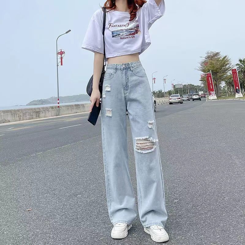 여성용 여름 얇은 데미지 하이웨이스트 청바지, 2026년 신상 슬림핏 와이드 레그 루즈핏 바지스토어 가기