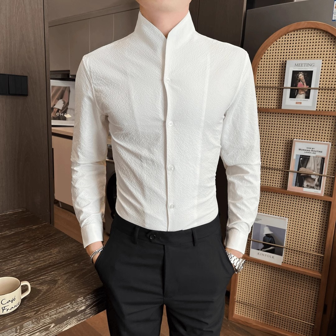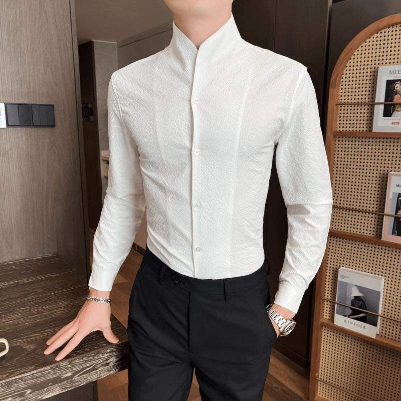 하이 엔드 Zhongshan 칼라 셔츠 남성 긴팔 유행 가을 새로운 새로운 중국 스타일 남성 스탠드 칼라 캐주얼 잘 생긴 셔츠스토어 가기