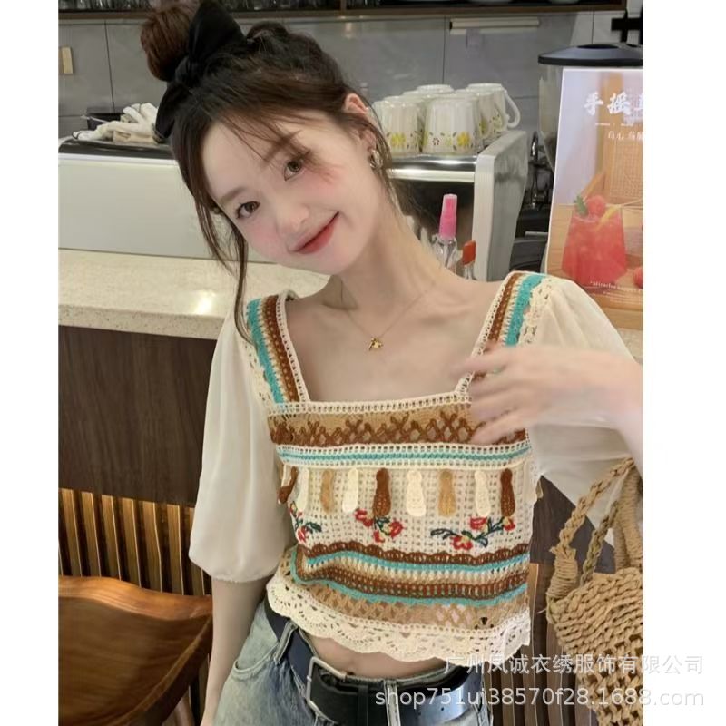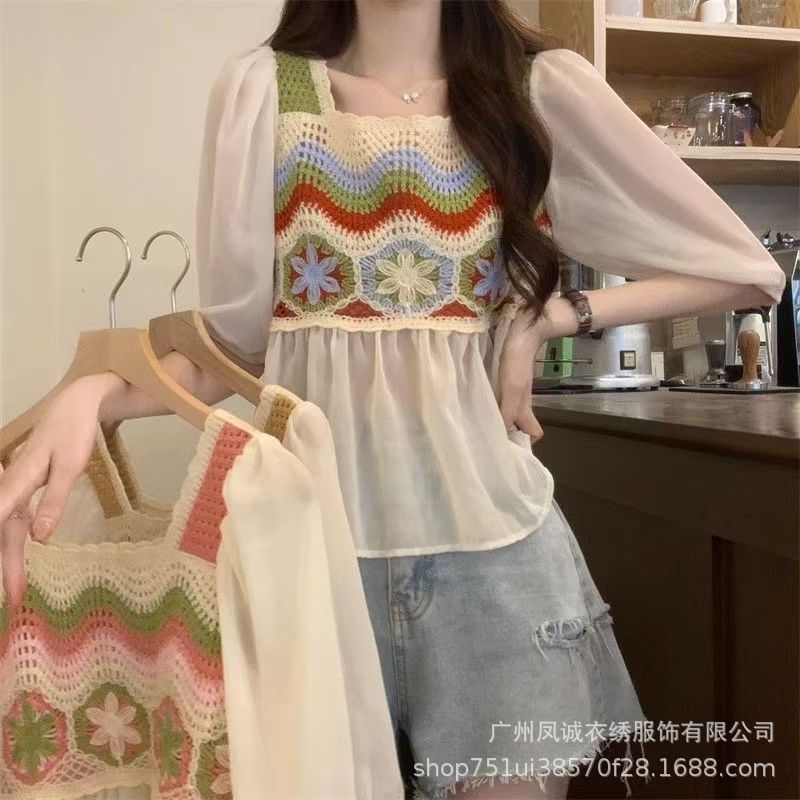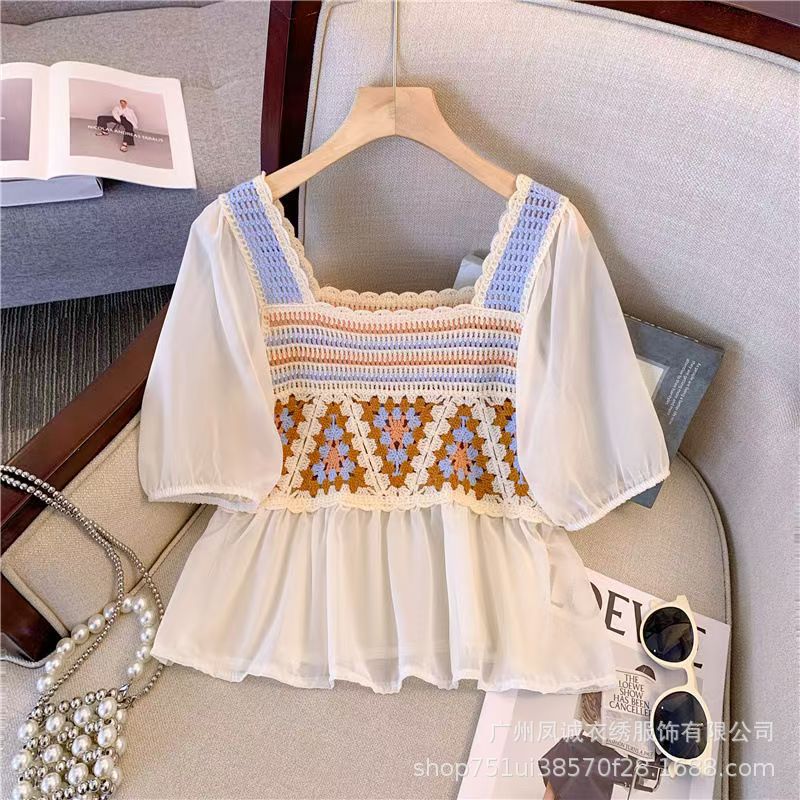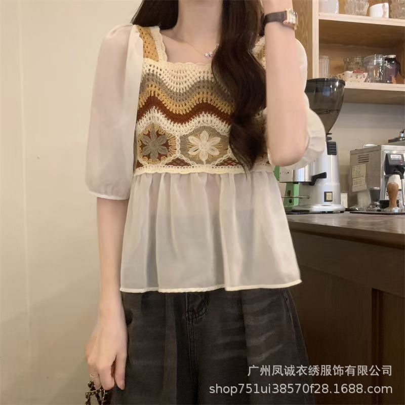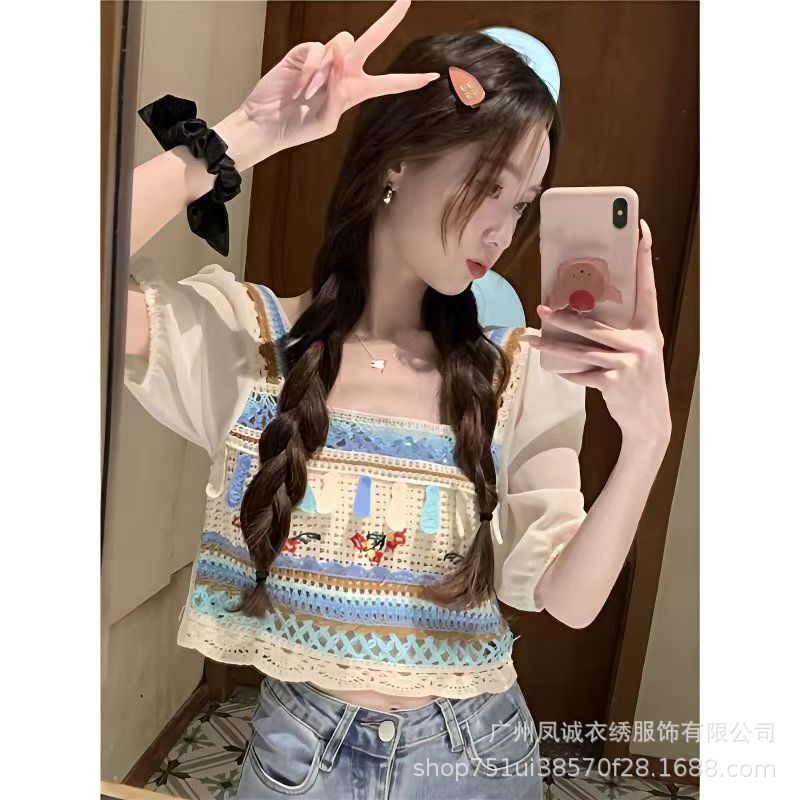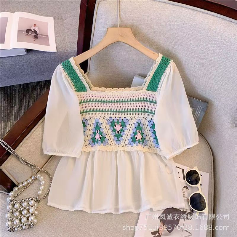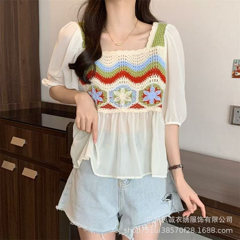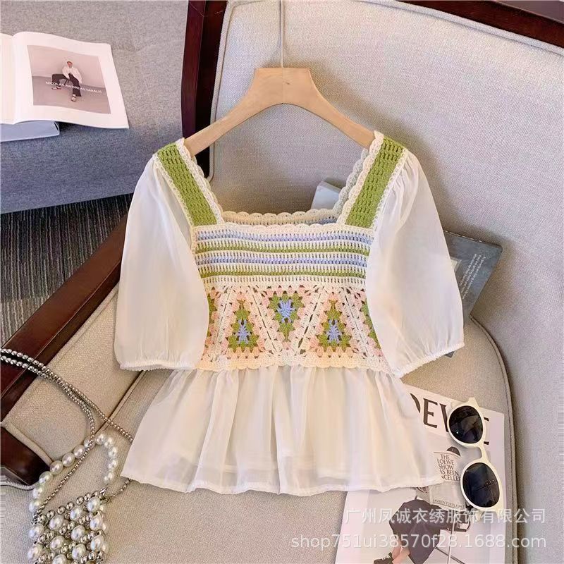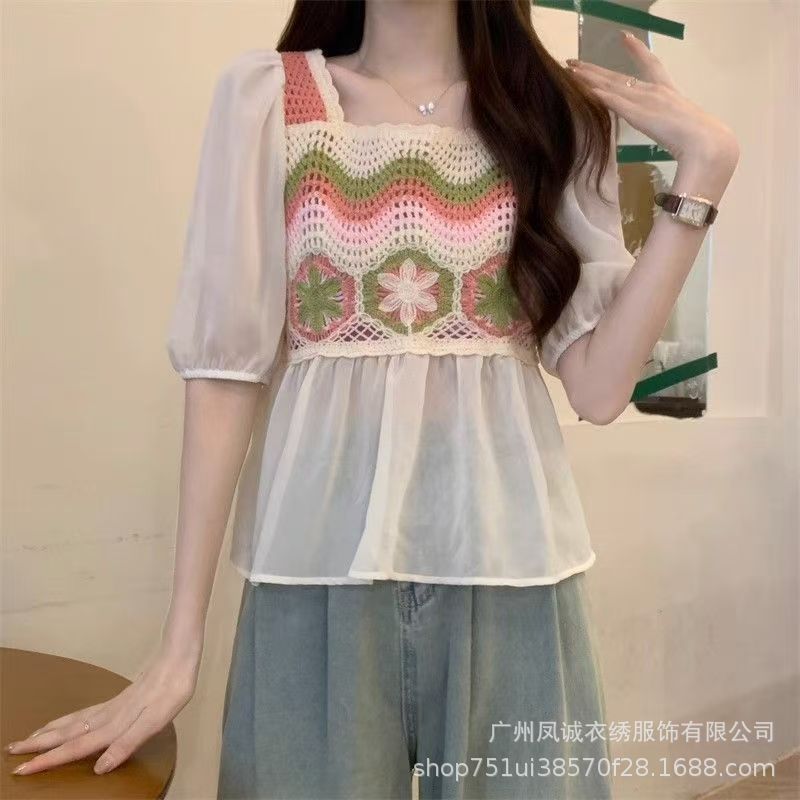 여성을위한 프렌치 쉬폰 스플 라이스 중공 크로 셰 뜨개질 스웨터 여름 새로운 틈새 달콤한 반팔 연령 감소 짧은 탑스토어 가기