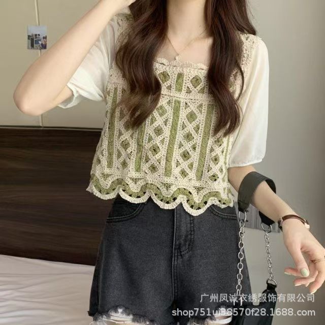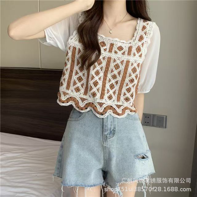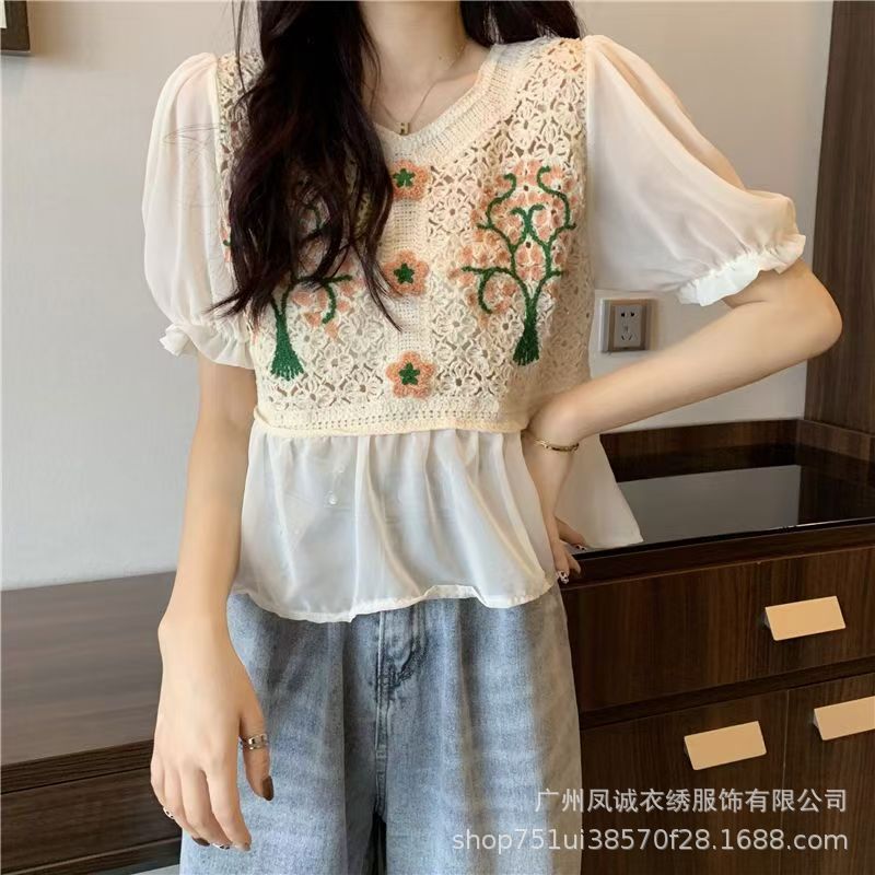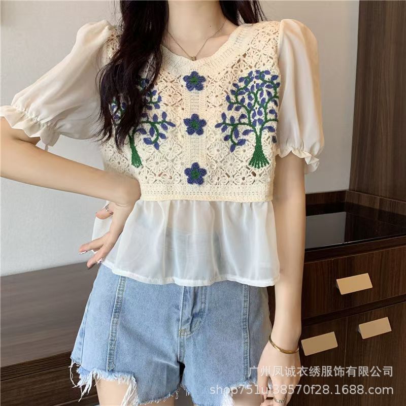 여성을위한 프렌치 쉬폰 스플 라이스 중공 크로 셰 뜨개질 스웨터 여름 새로운 틈새 달콤한 반팔 연령 감소 짧은 탑