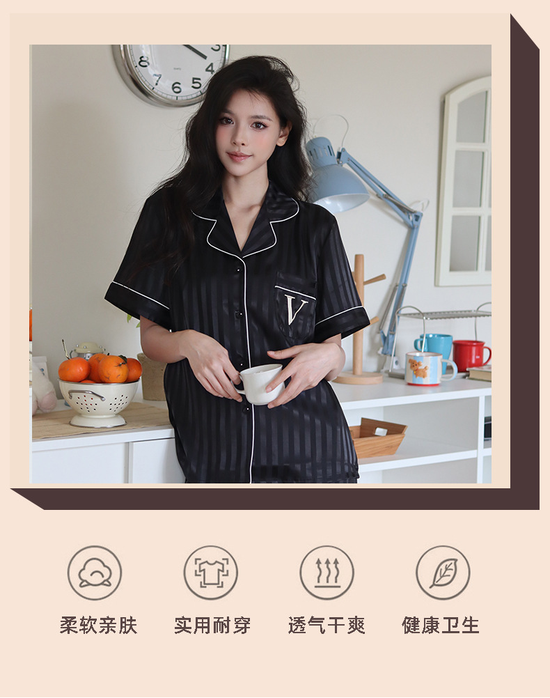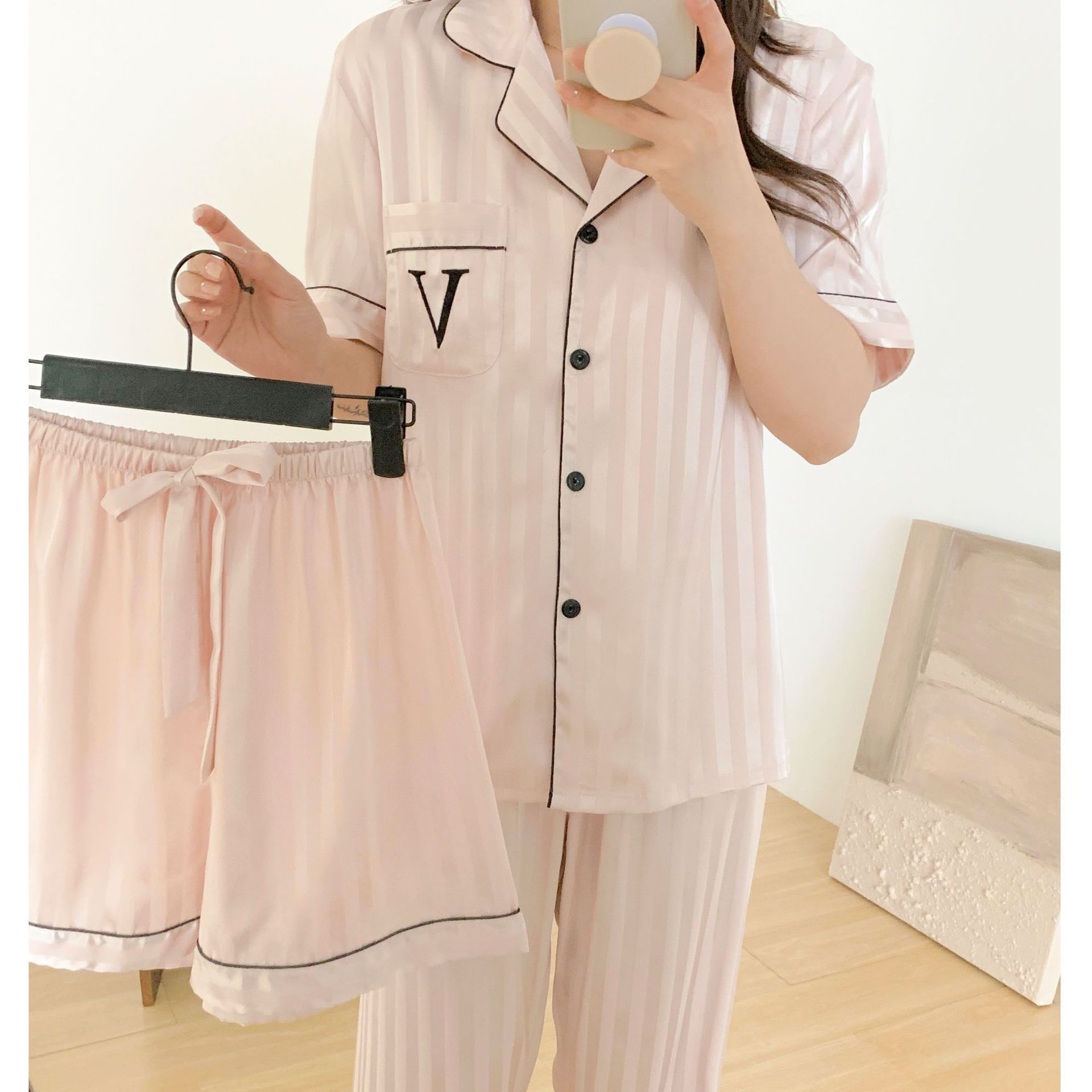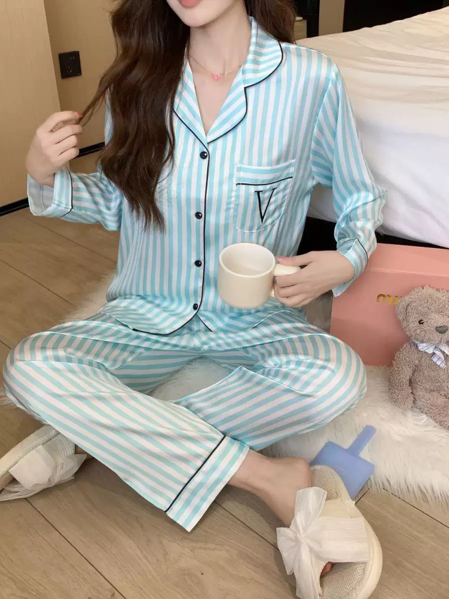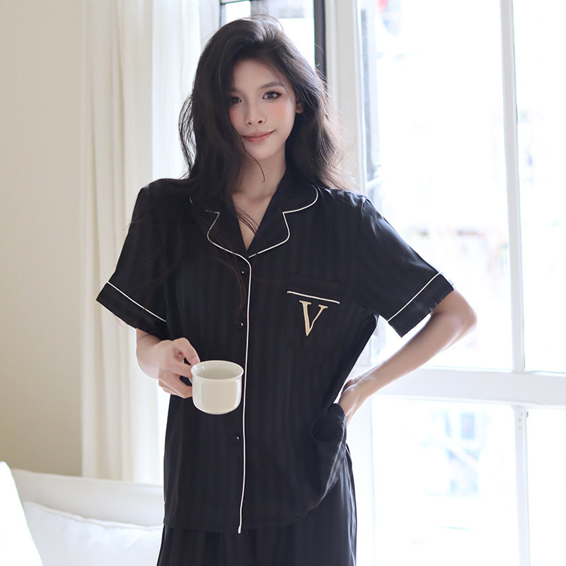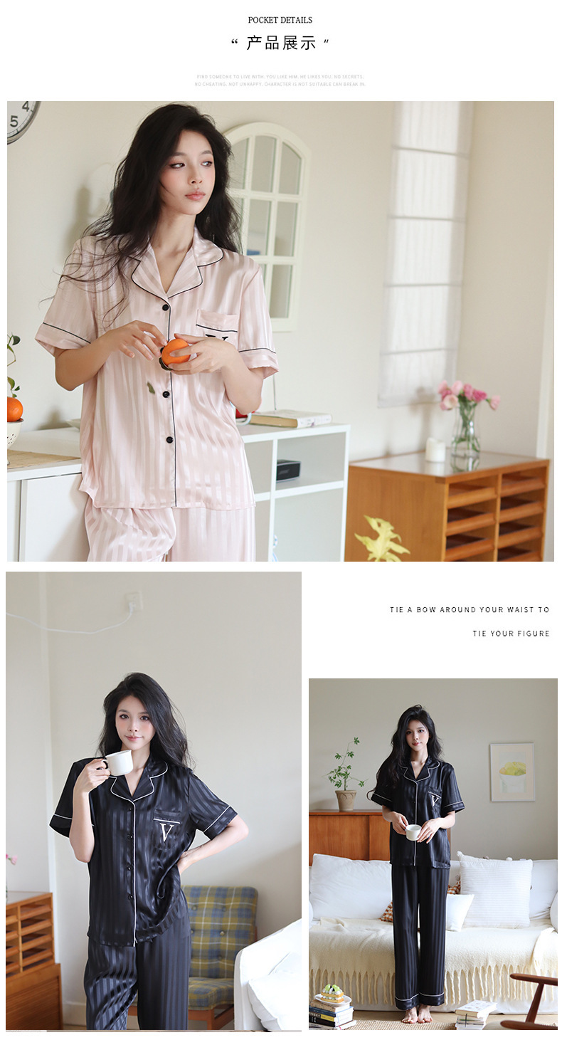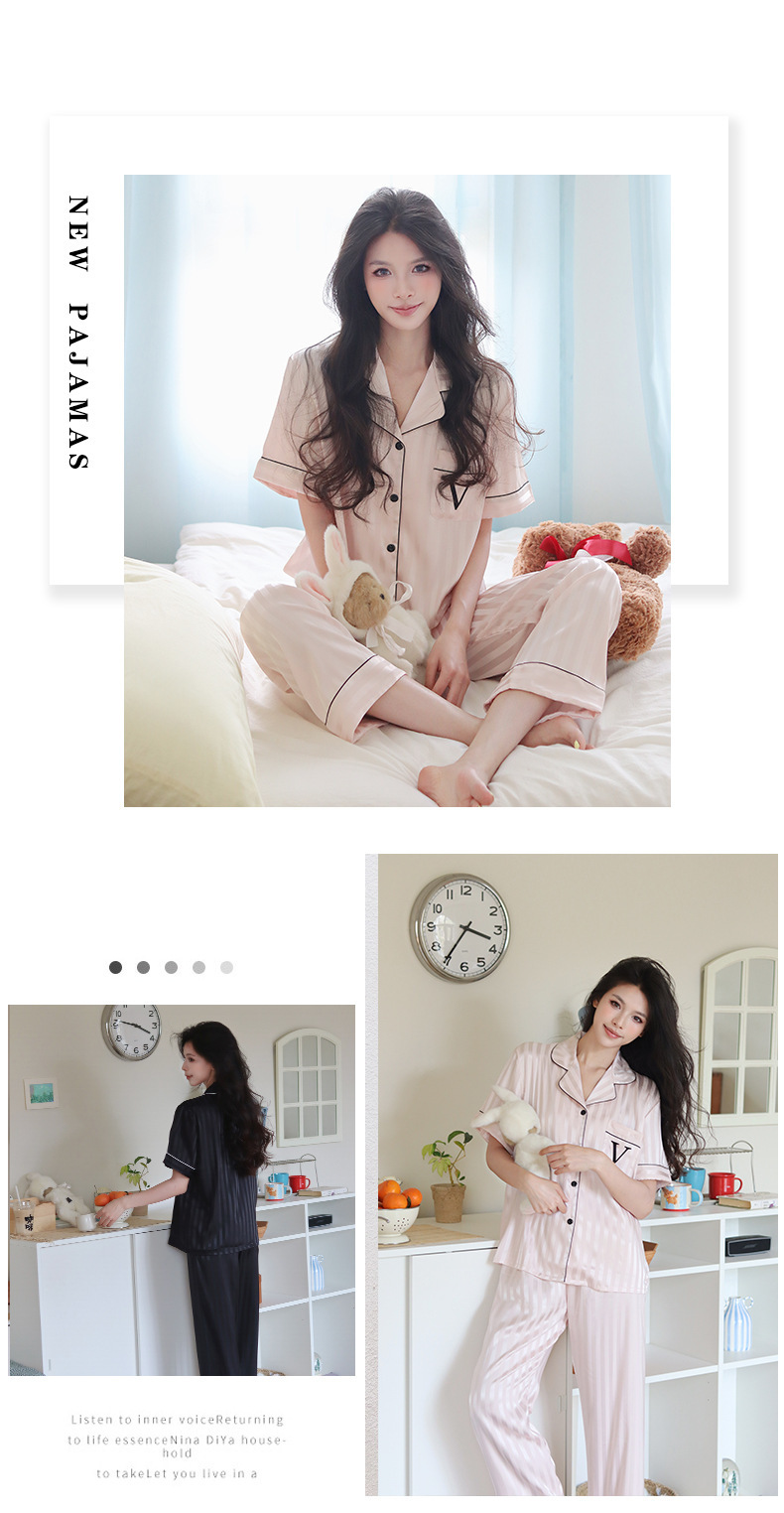 Weijia 스트라이프 파자마 여성 여름 아이스 실크 고급 고급 반팔 바지 세트 얇은 외형 홈 옷