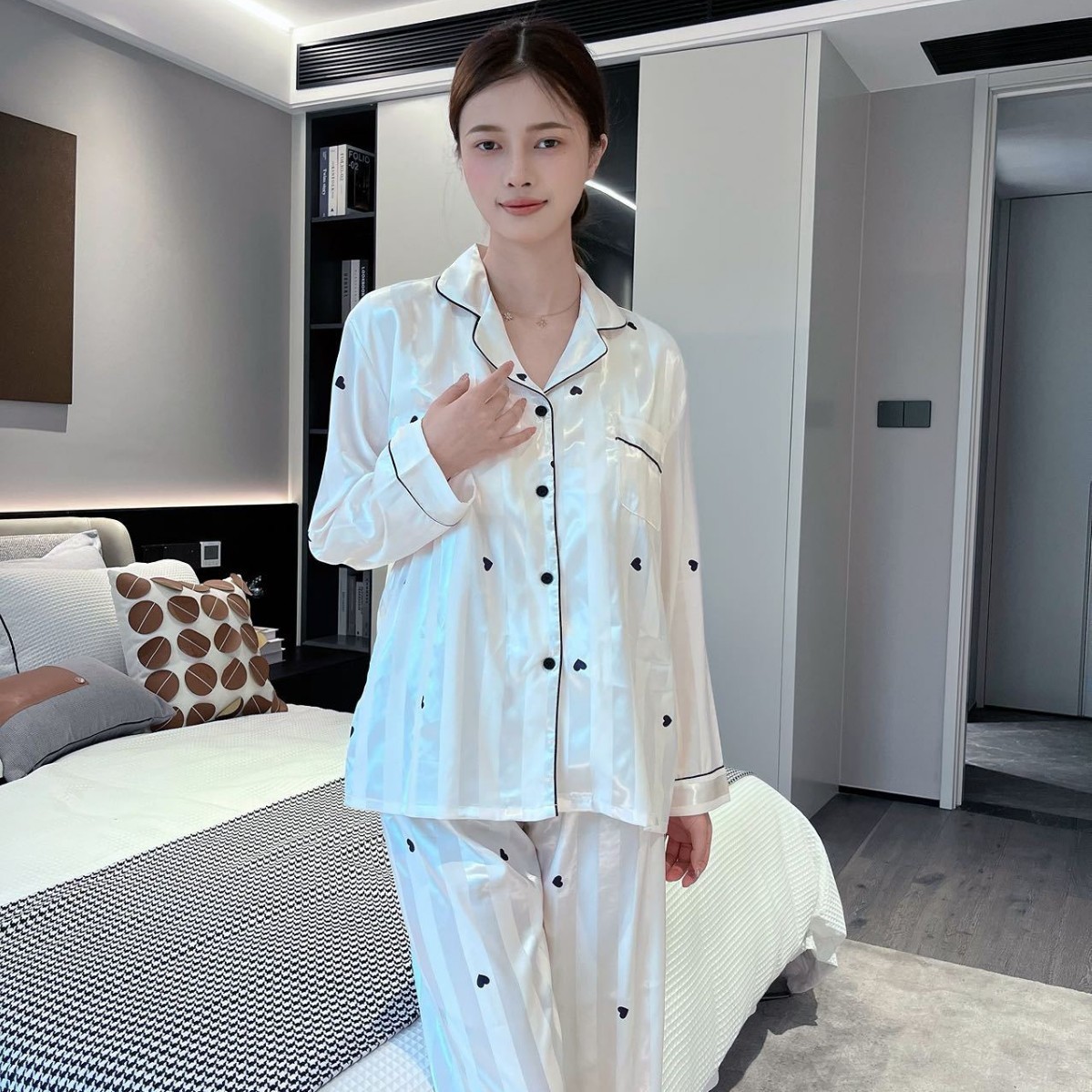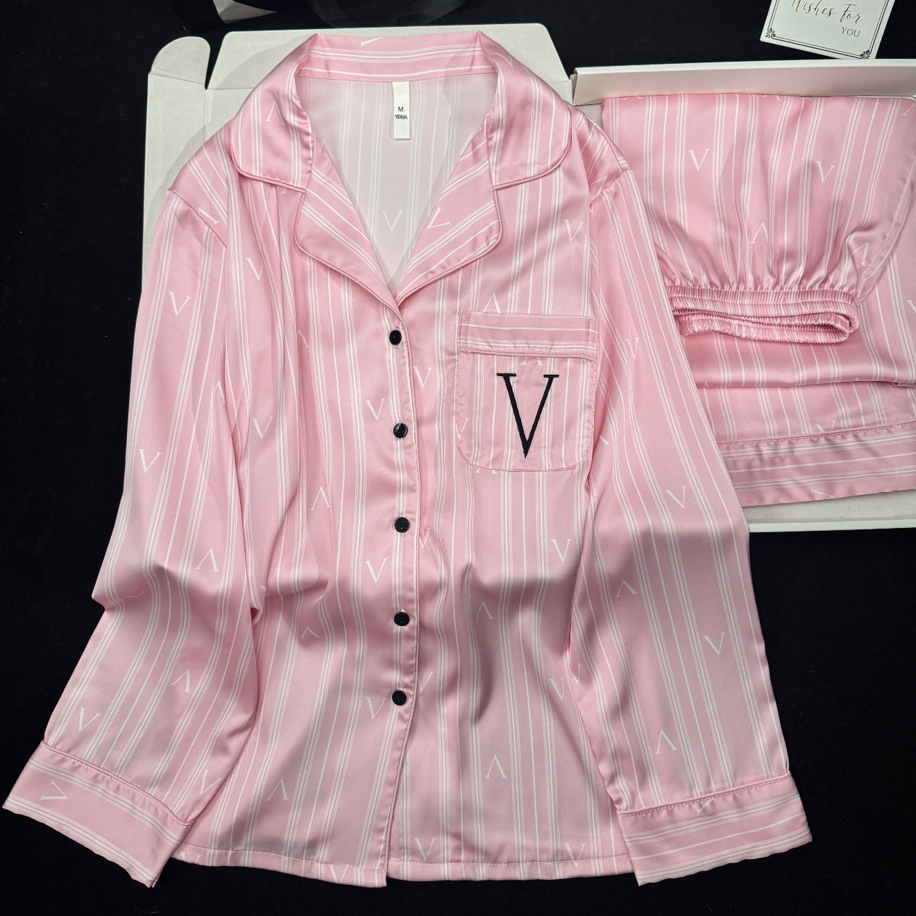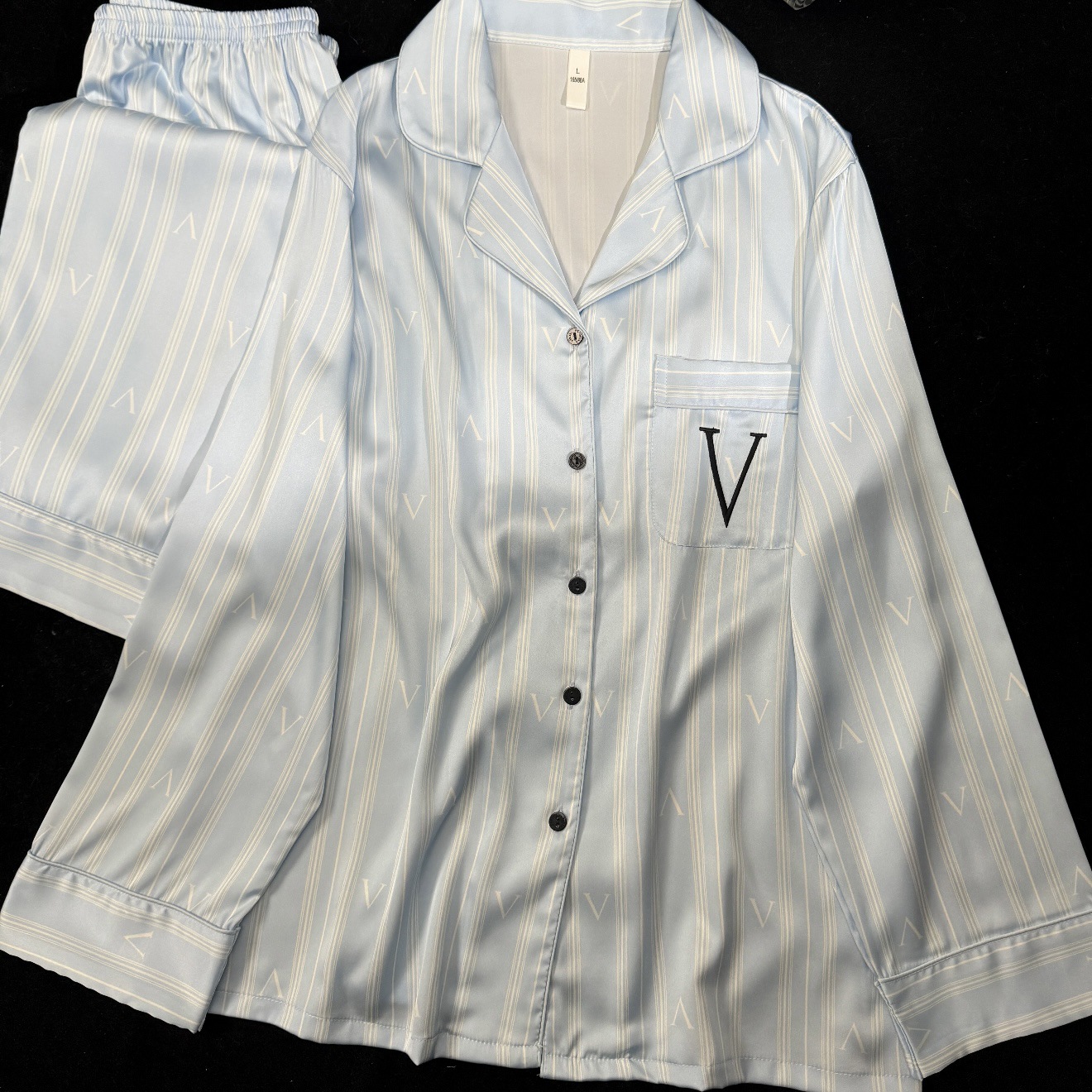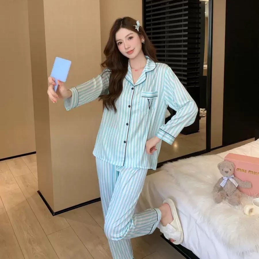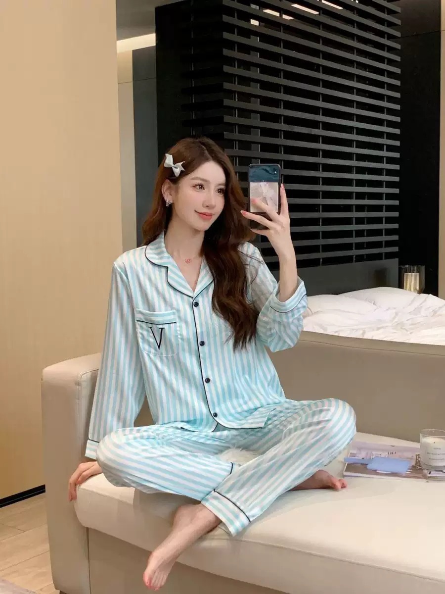 Weijia 스트라이프 파자마 여성 여름 아이스 실크 고급 고급 반팔 바지 세트 얇은 외형 홈 옷