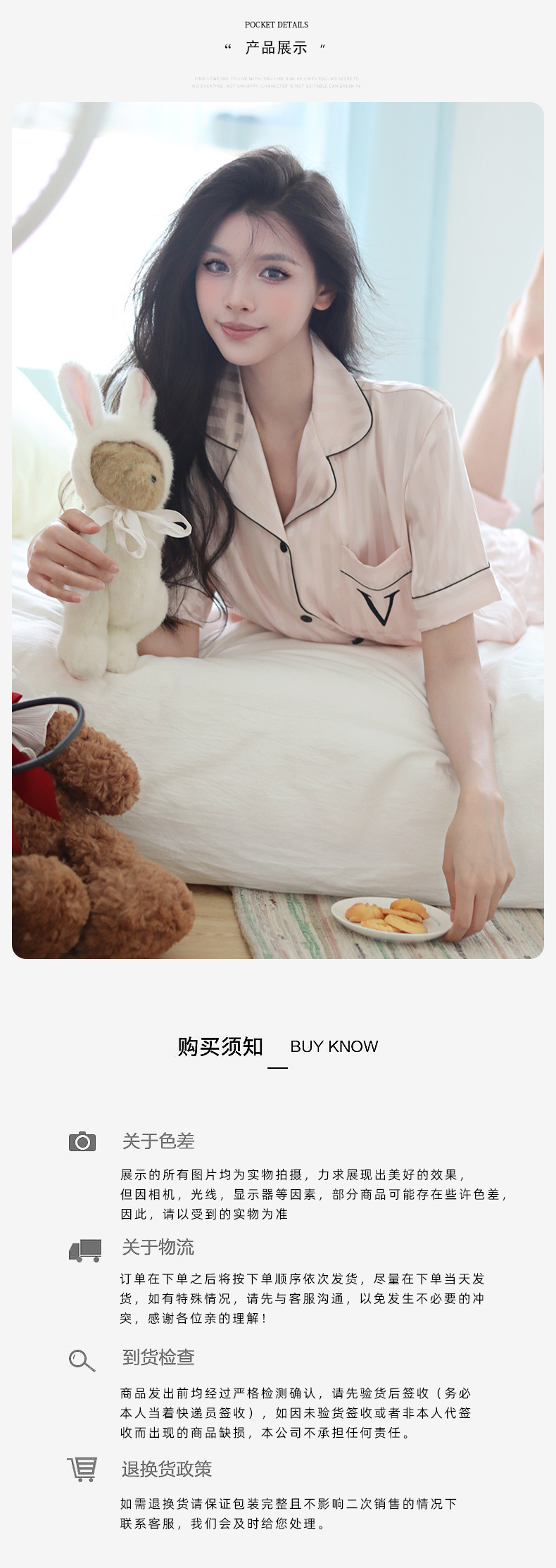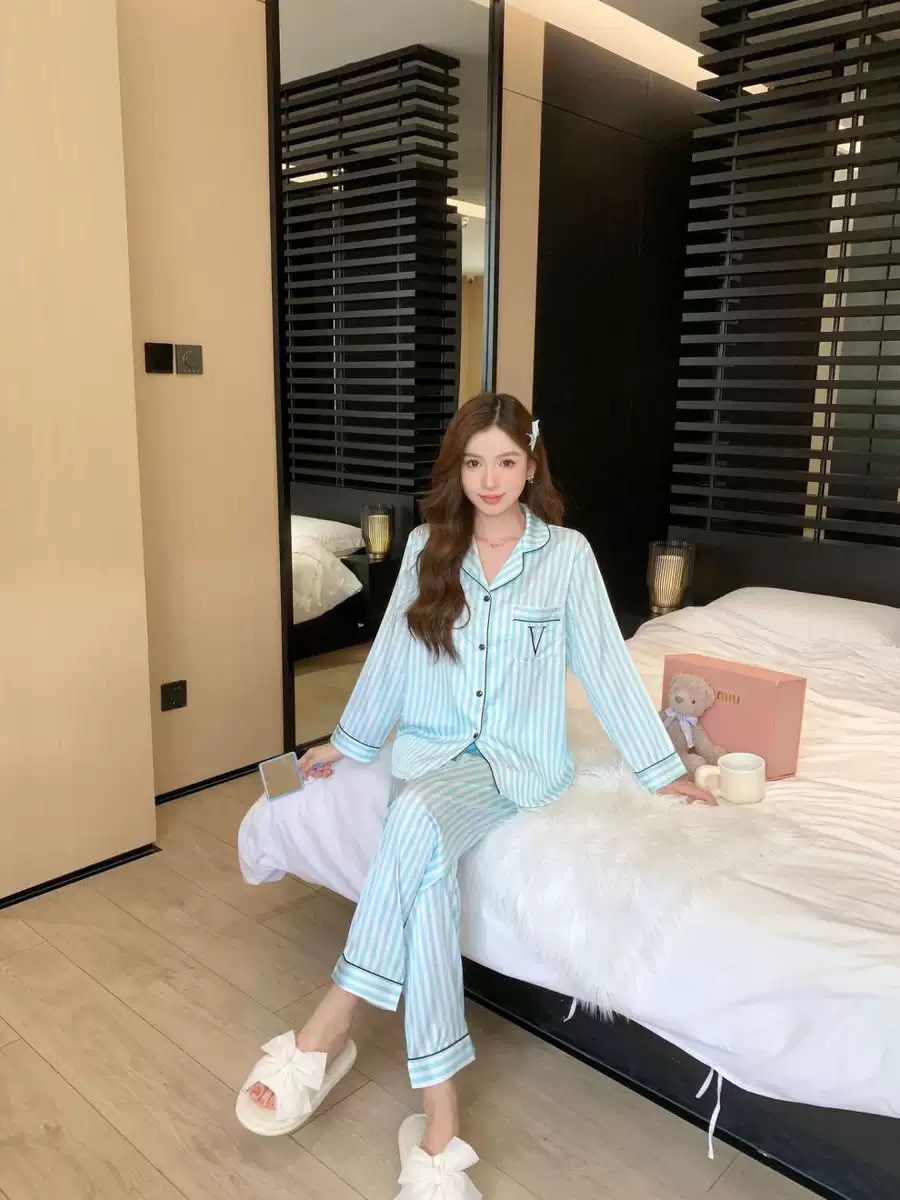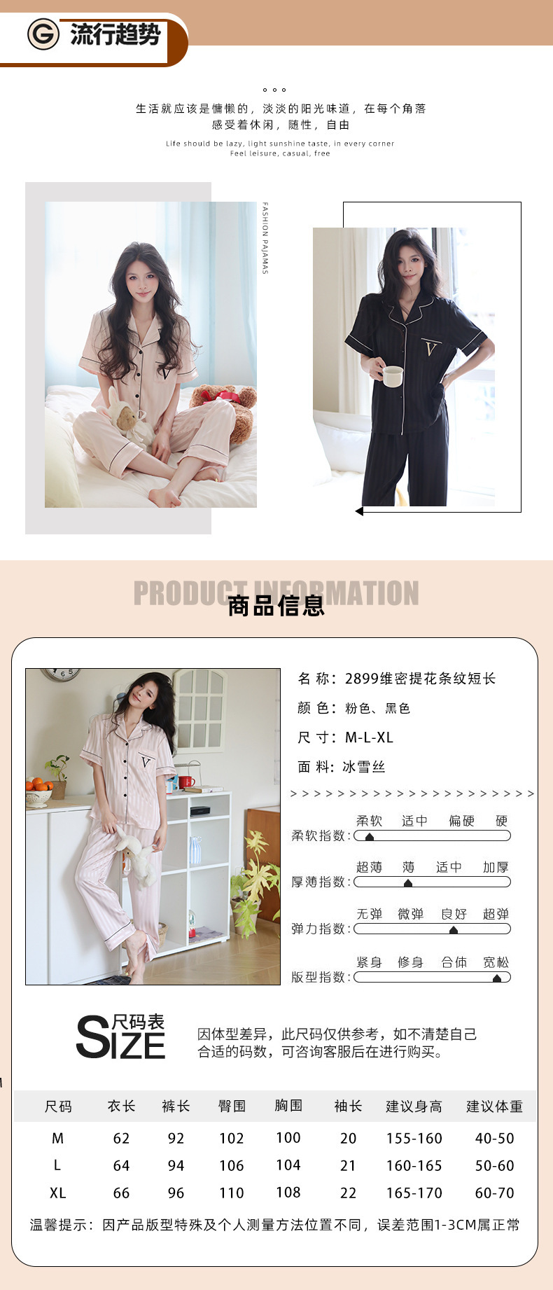 Weijia 스트라이프 파자마 여성 여름 아이스 실크 고급 고급 반팔 바지 세트 얇은 외형 홈 옷스토어 가기