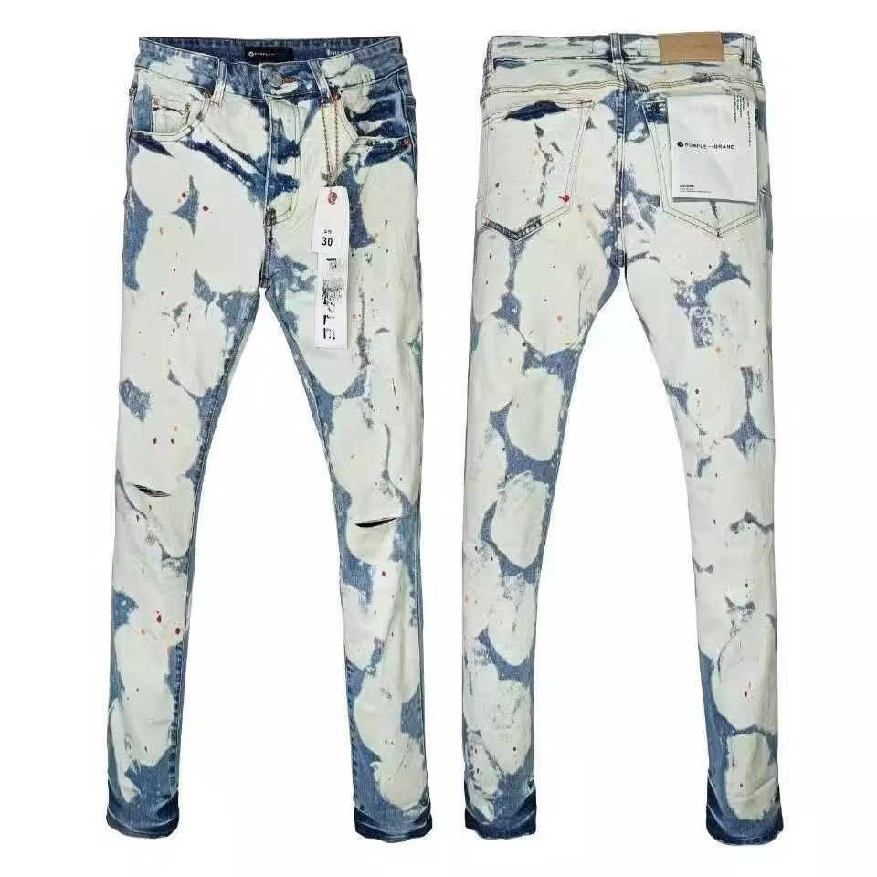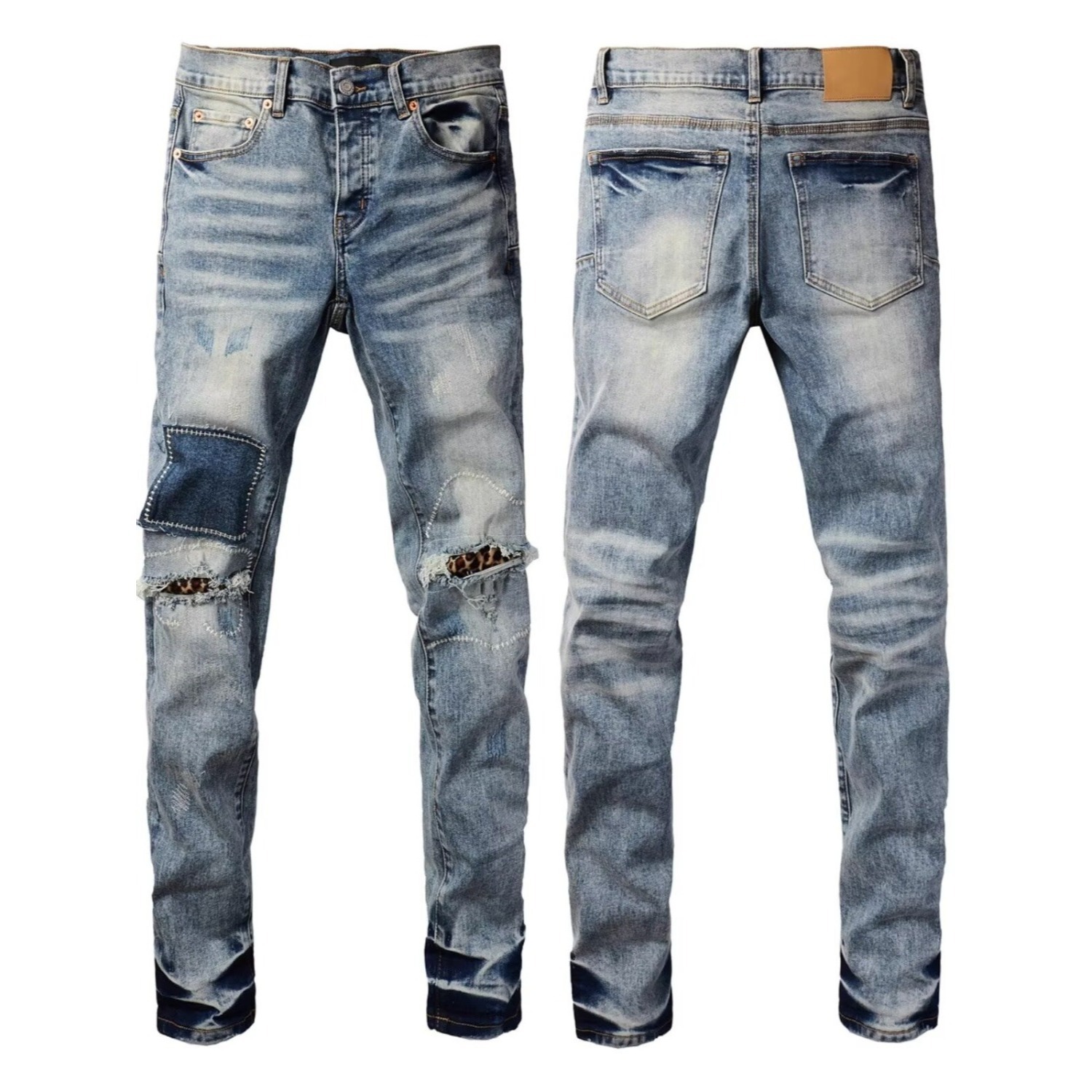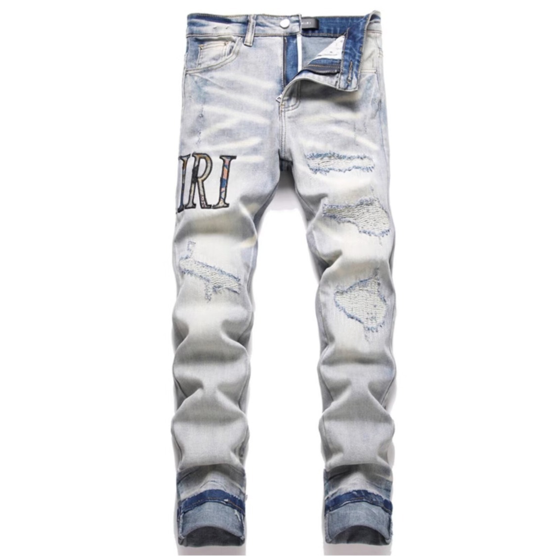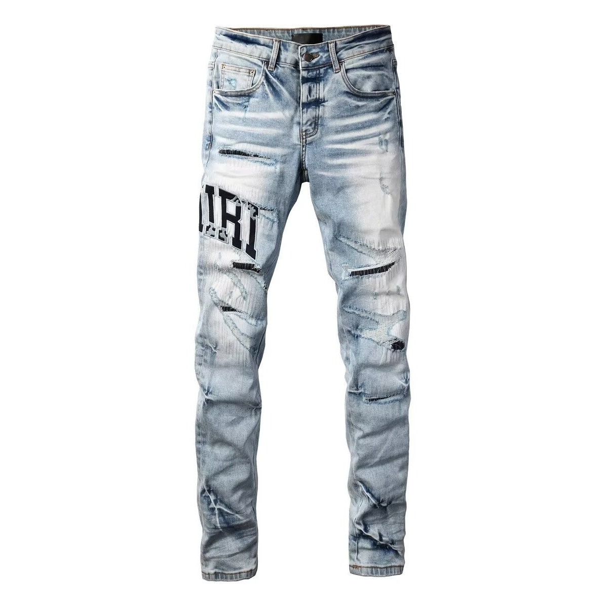 트렌디한 맞춤형 캐주얼 신상품, 패치워크, 트렌디한 브랜드 슬림핏 자수 청바지, 남성용 찢어진 트렌디 패치워크 코튼스토어 가기