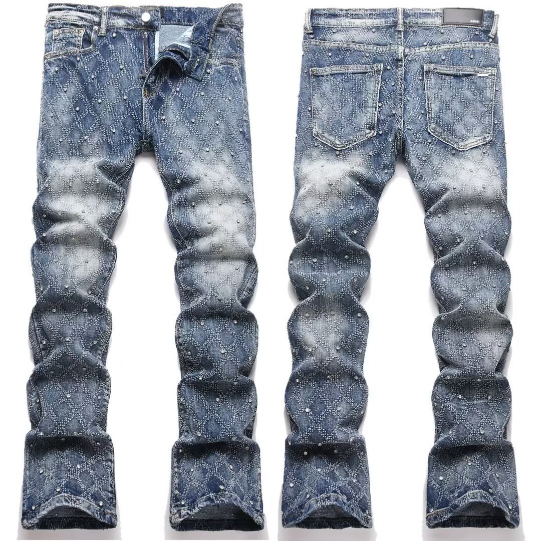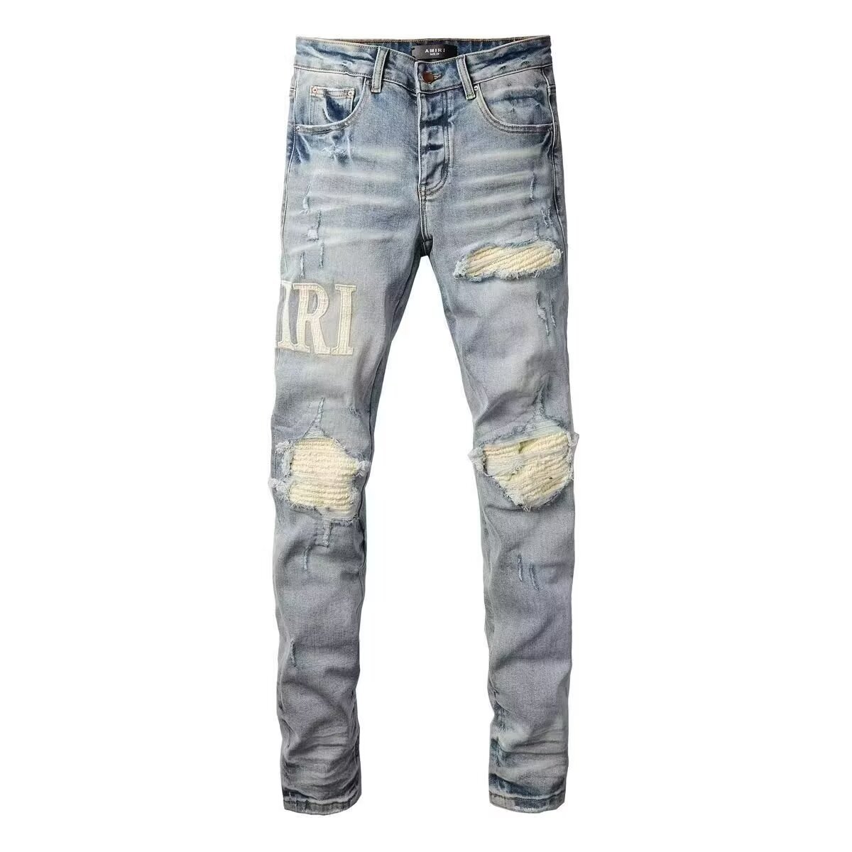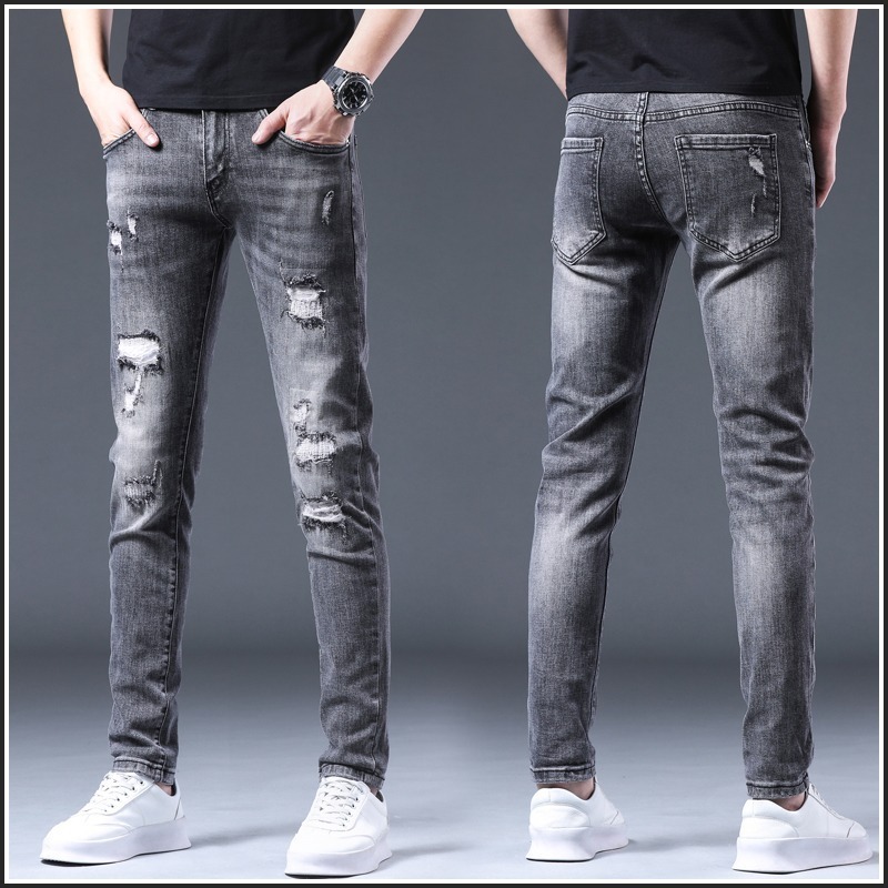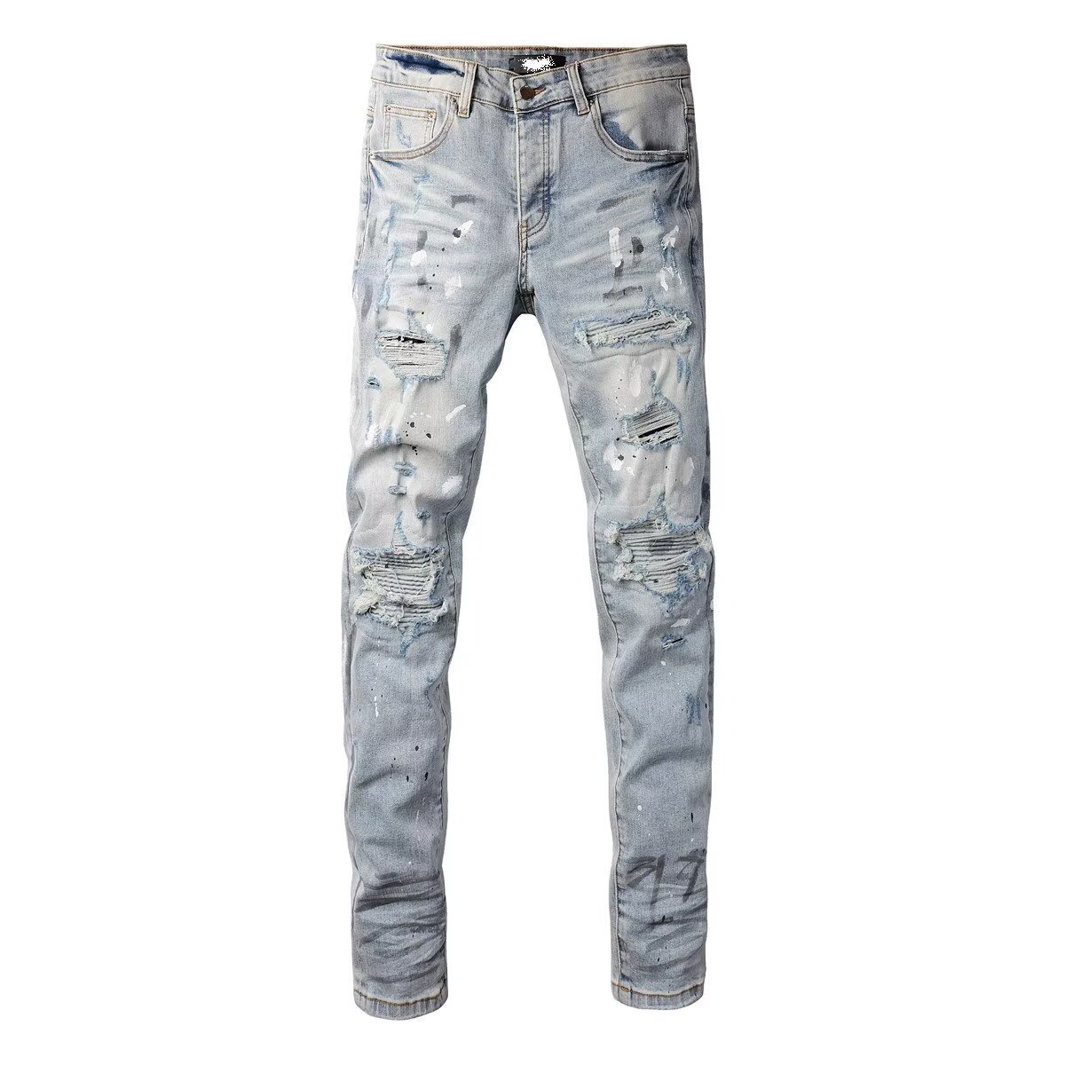 트렌디한 맞춤형 캐주얼 신상품, 패치워크, 트렌디한 브랜드 슬림핏 자수 청바지, 남성용 찢어진 트렌디 패치워크 코튼스토어 가기
