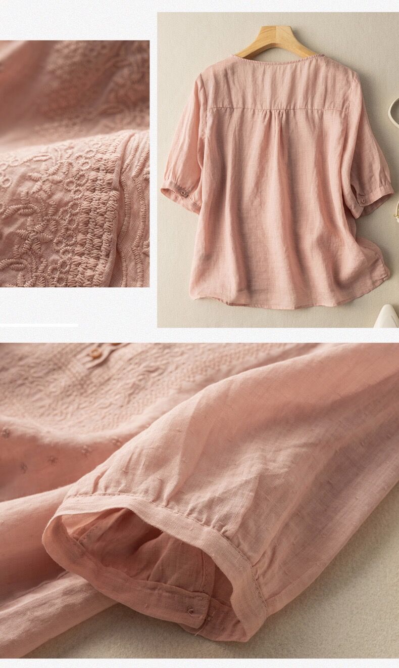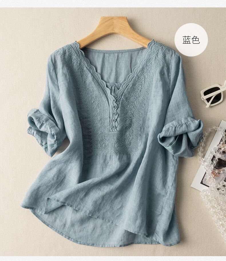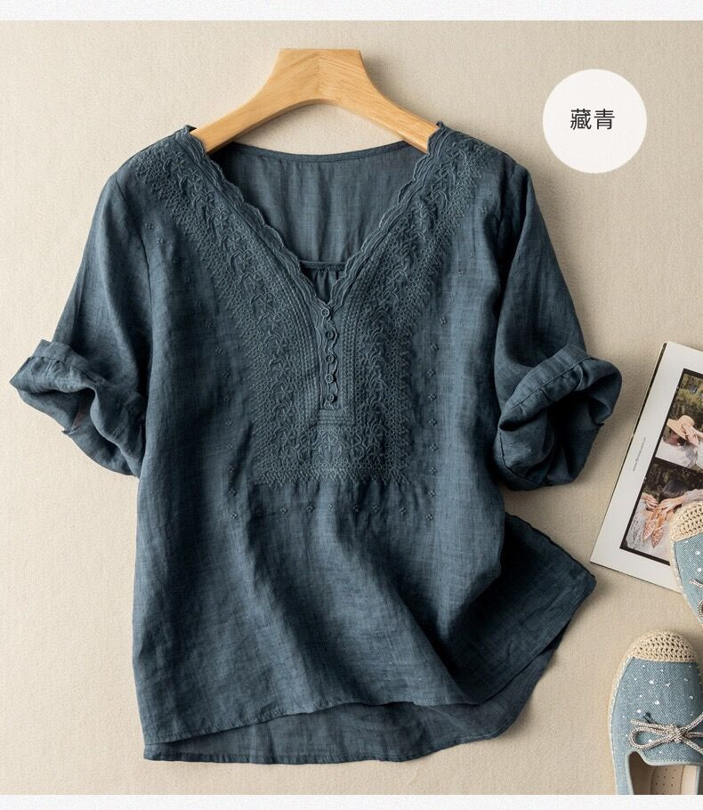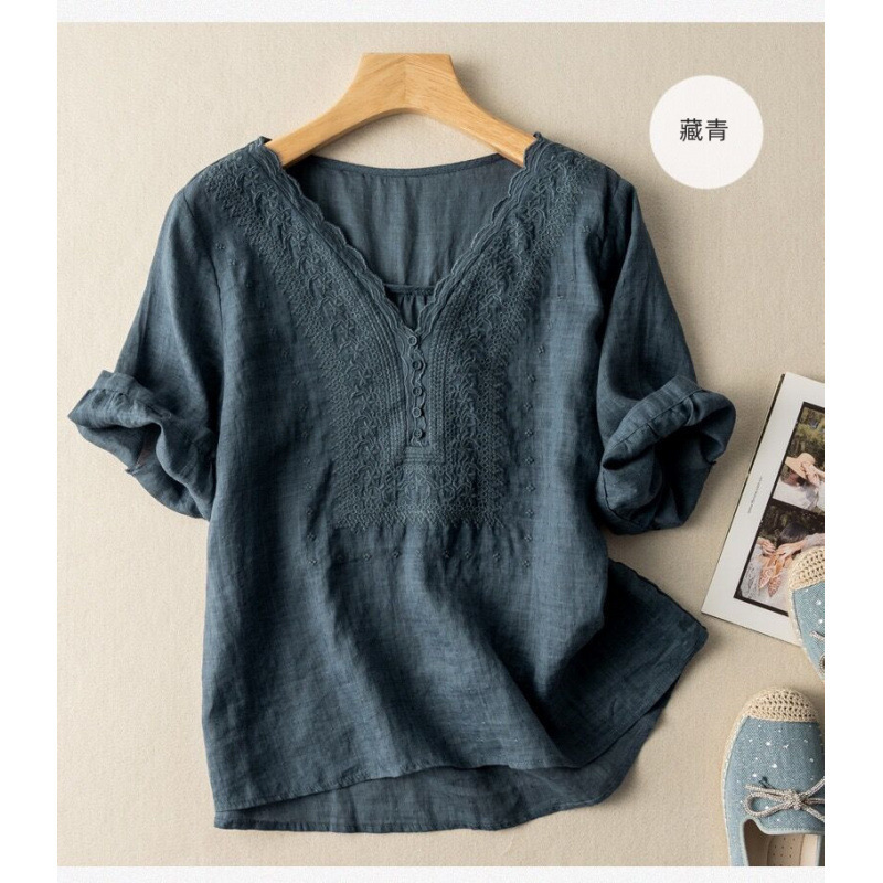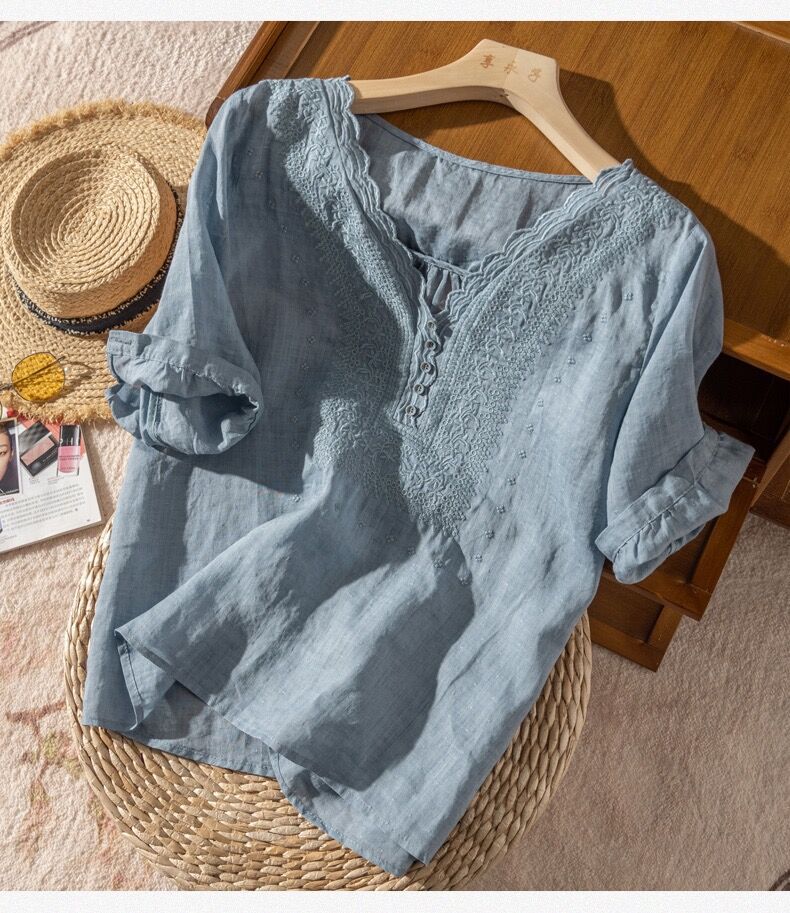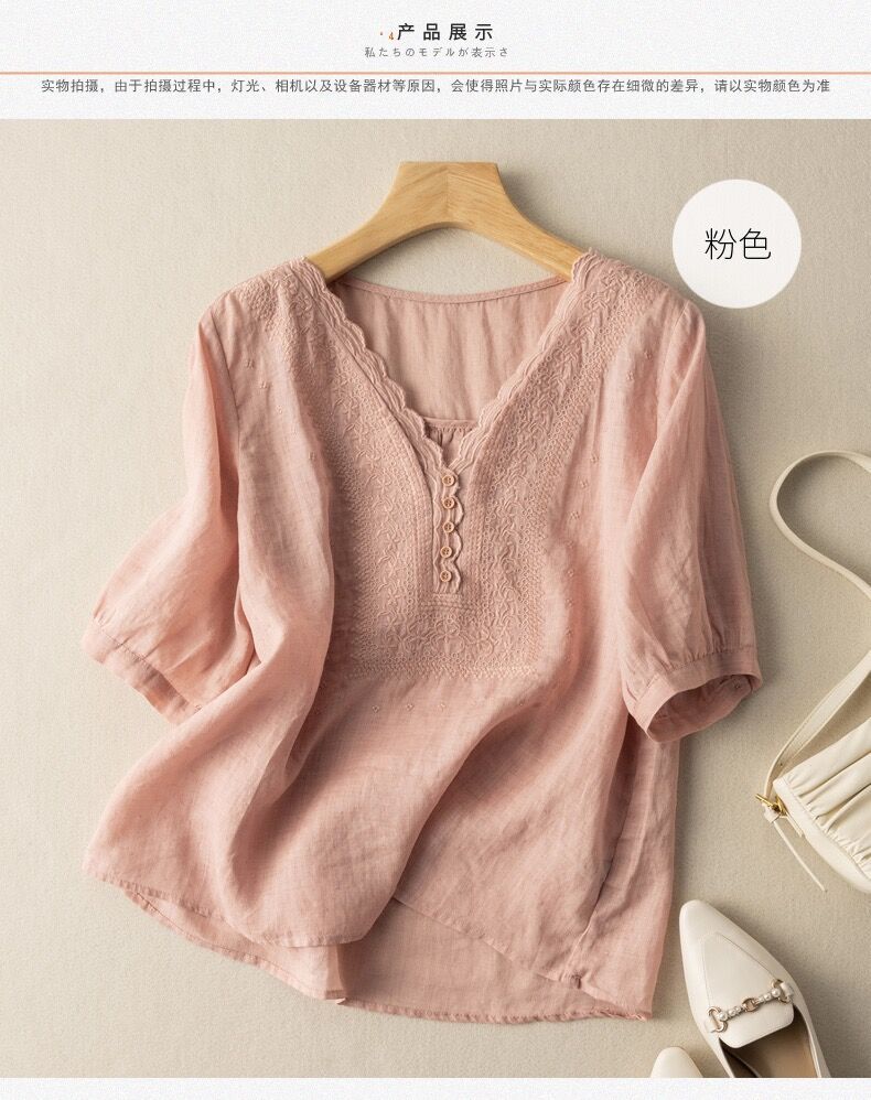 2025 여름 문학 복고풍 린넨 반팔 셔츠 기질 자수 v 넥 코튼 린넨 탑 여성용