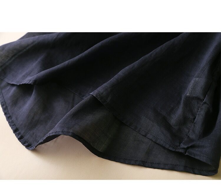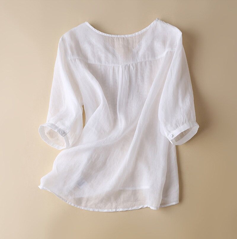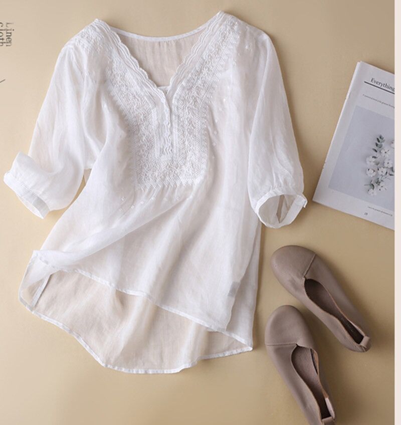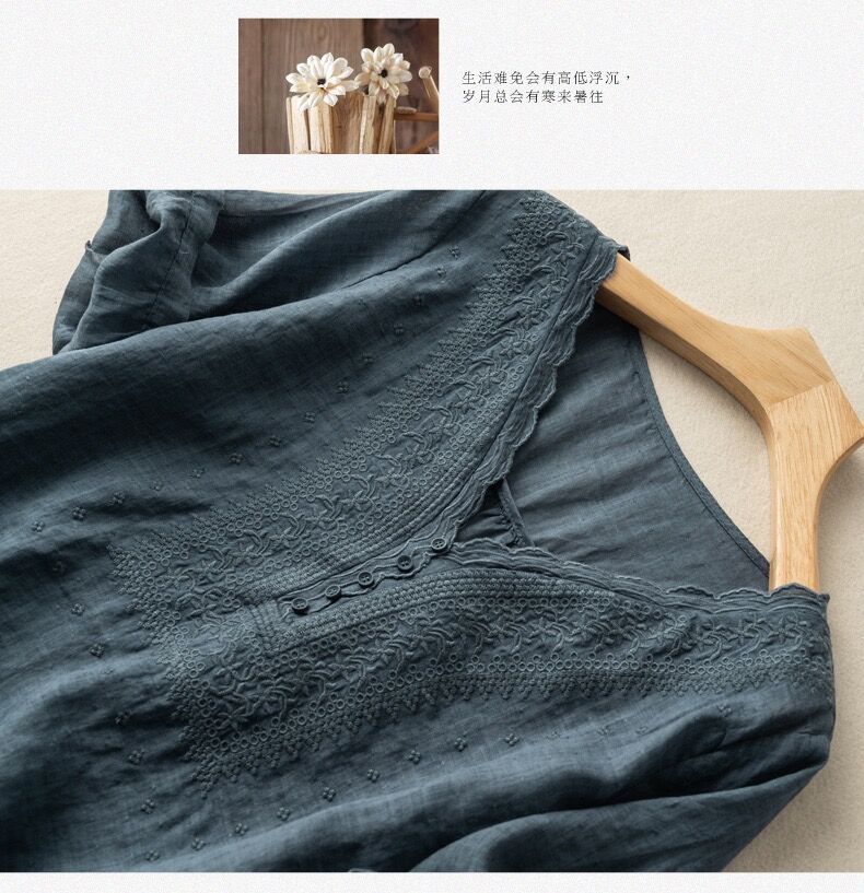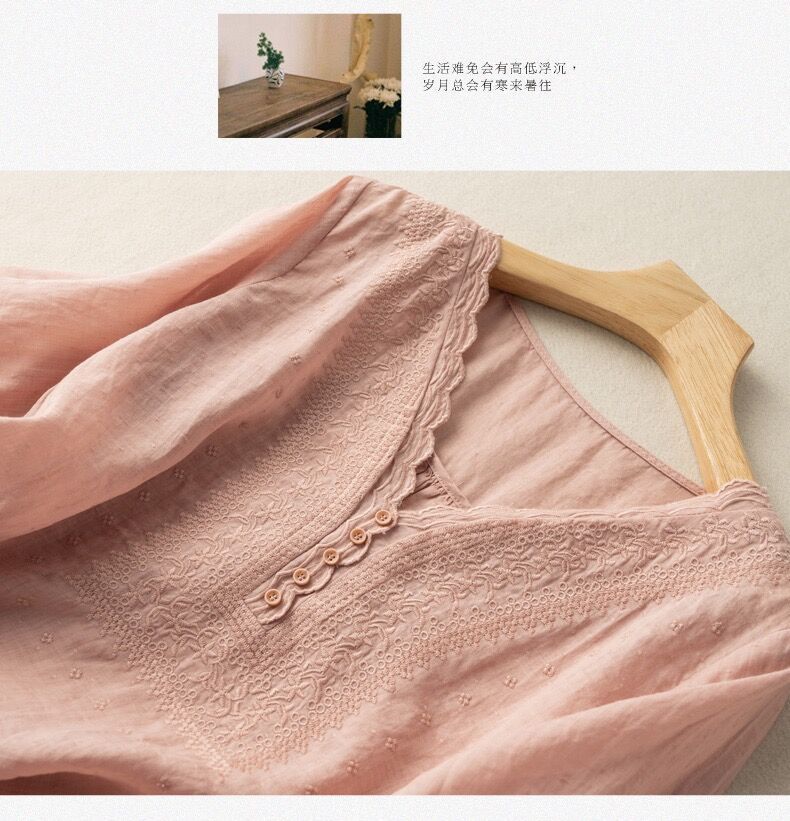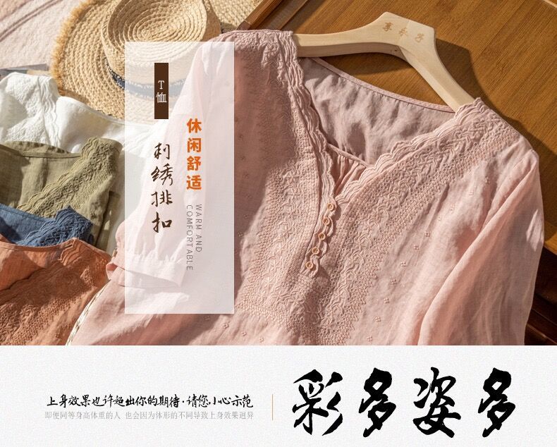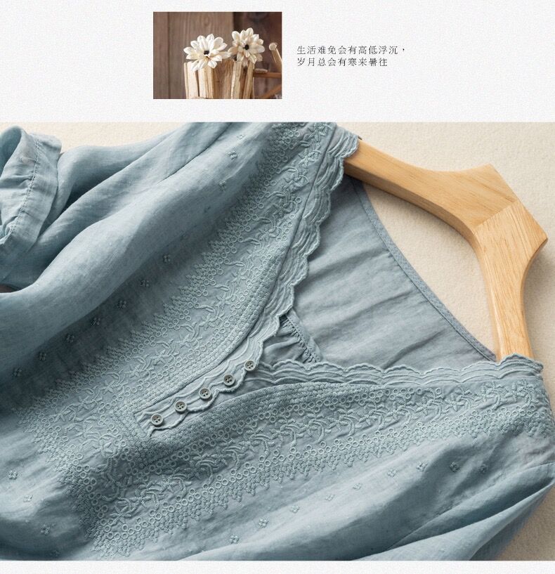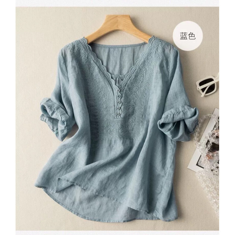 2025 여름 문학 복고풍 린넨 반팔 셔츠 기질 자수 v 넥 코튼 린넨 탑 여성용