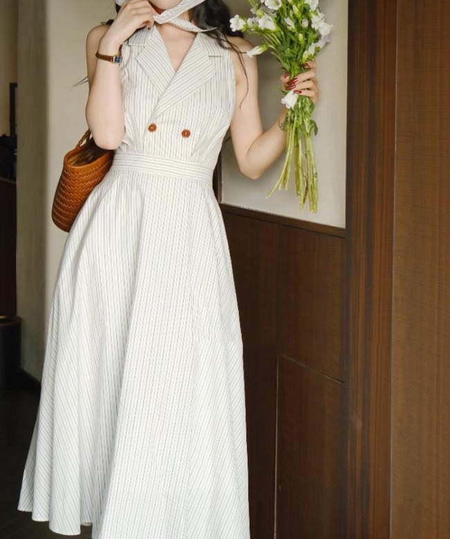Hai Vintage 프랑스 스타일 로맨틱 한 우아한 간단한 목 허리 줄무늬 셔츠 원피스 홍콩 스타일 여성 여름