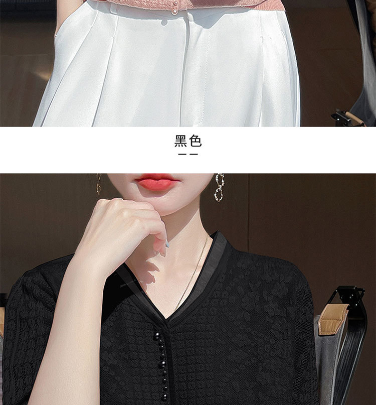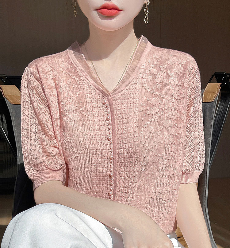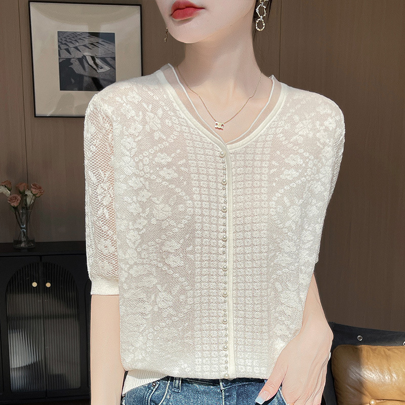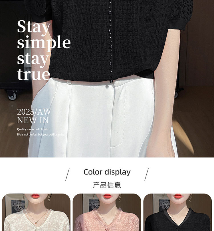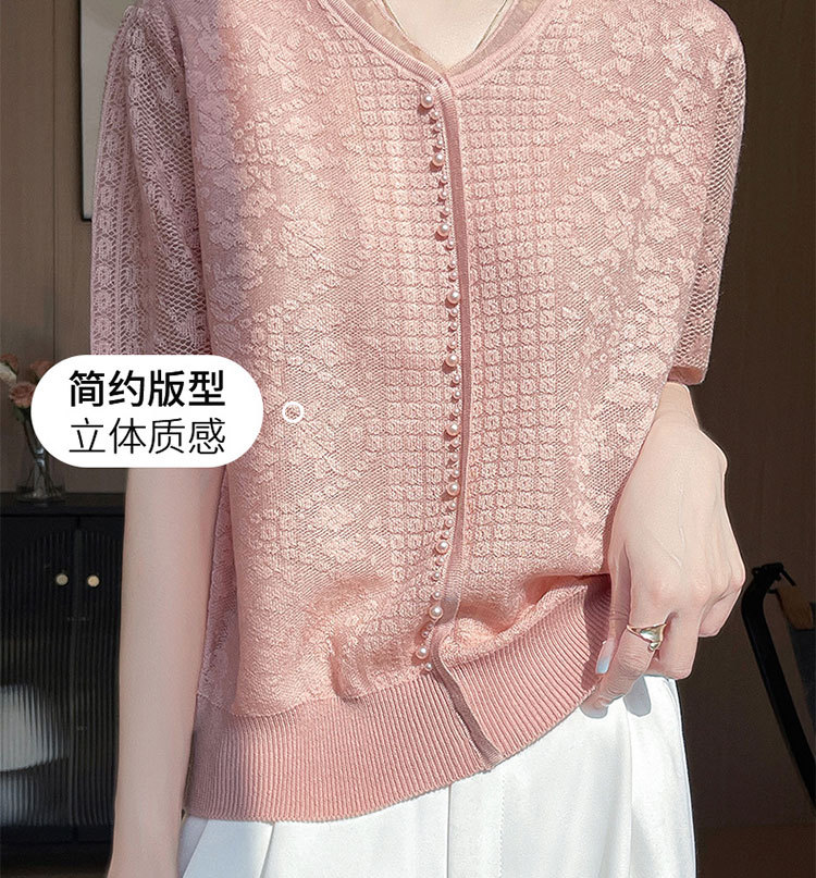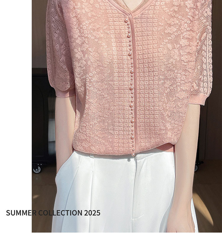 [공장 직접 공급] 여름 얇은 V 넥 텐셀 여성용 티셔츠 단색 자카드 느슨한 아이스 실크 반팔 니트 스웨터