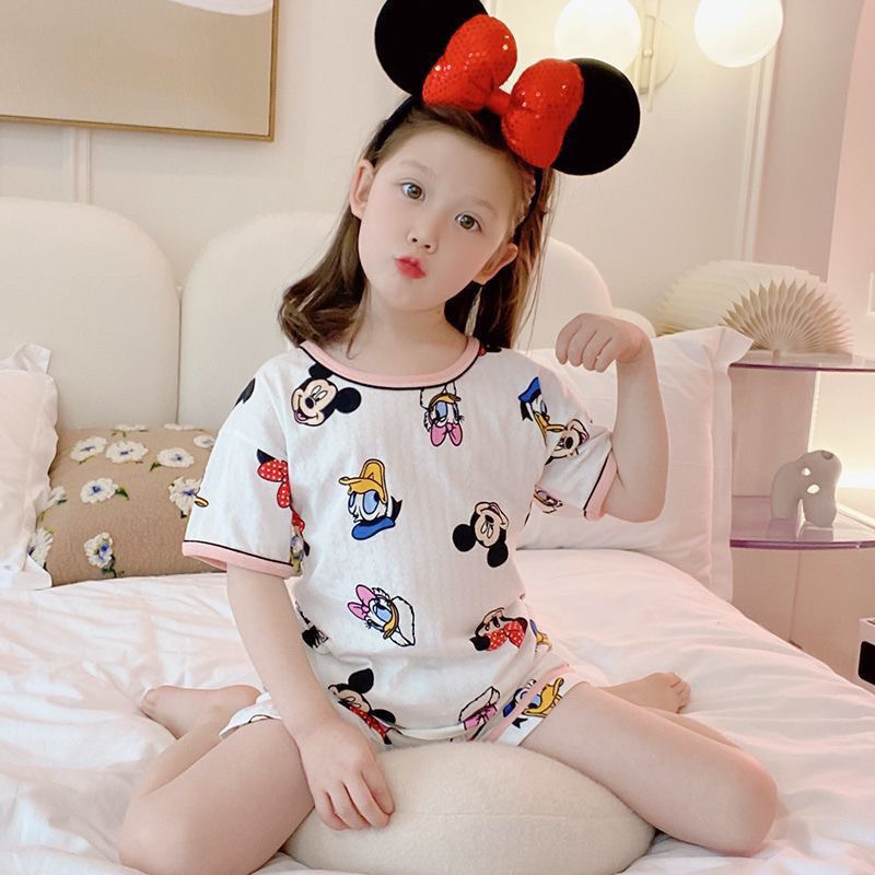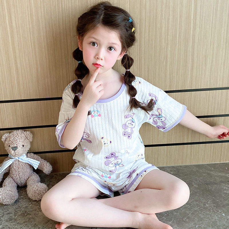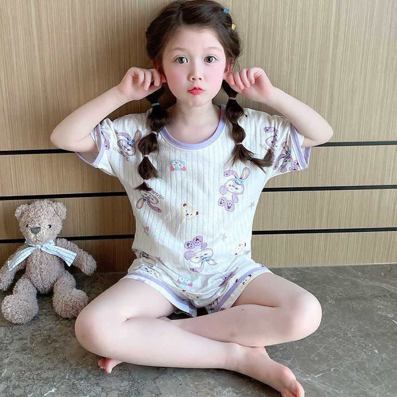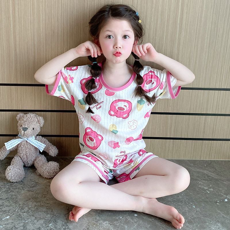 여자 반팔 잠옷 2025 새로운 여름 어린 소녀 에어컨 옷 어린이 얇은 만화 가정 의류 세트스토어 가기