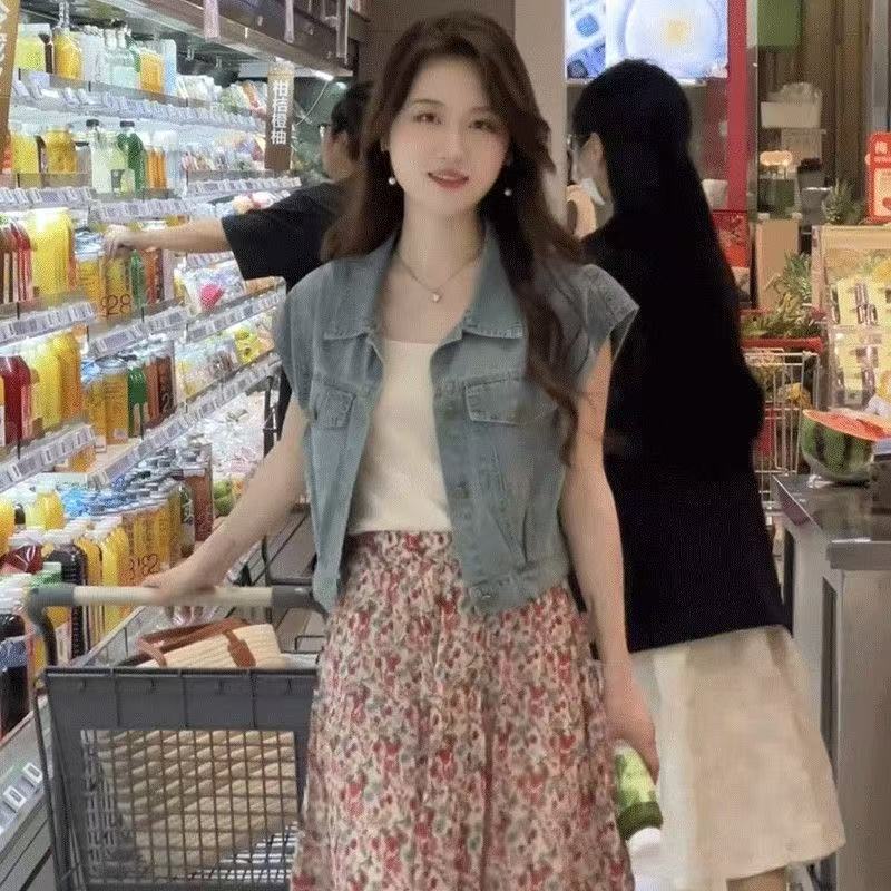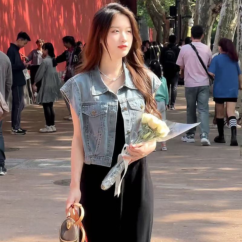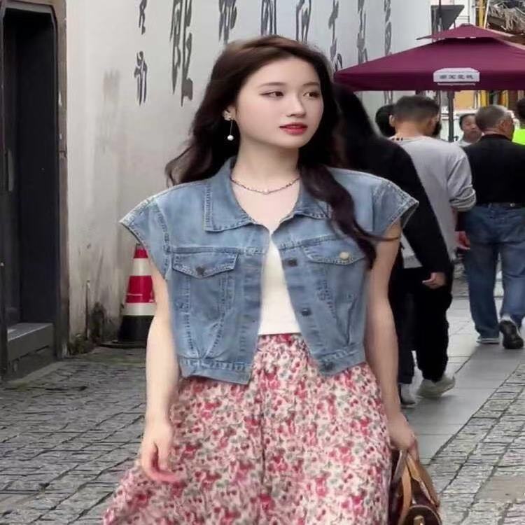 패션 세련된 반팔 데님 셔츠 여성 조끼 여름 새로운 민소매 캐주얼 조끼 얇은 작은 코트스토어 가기