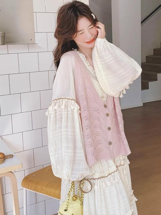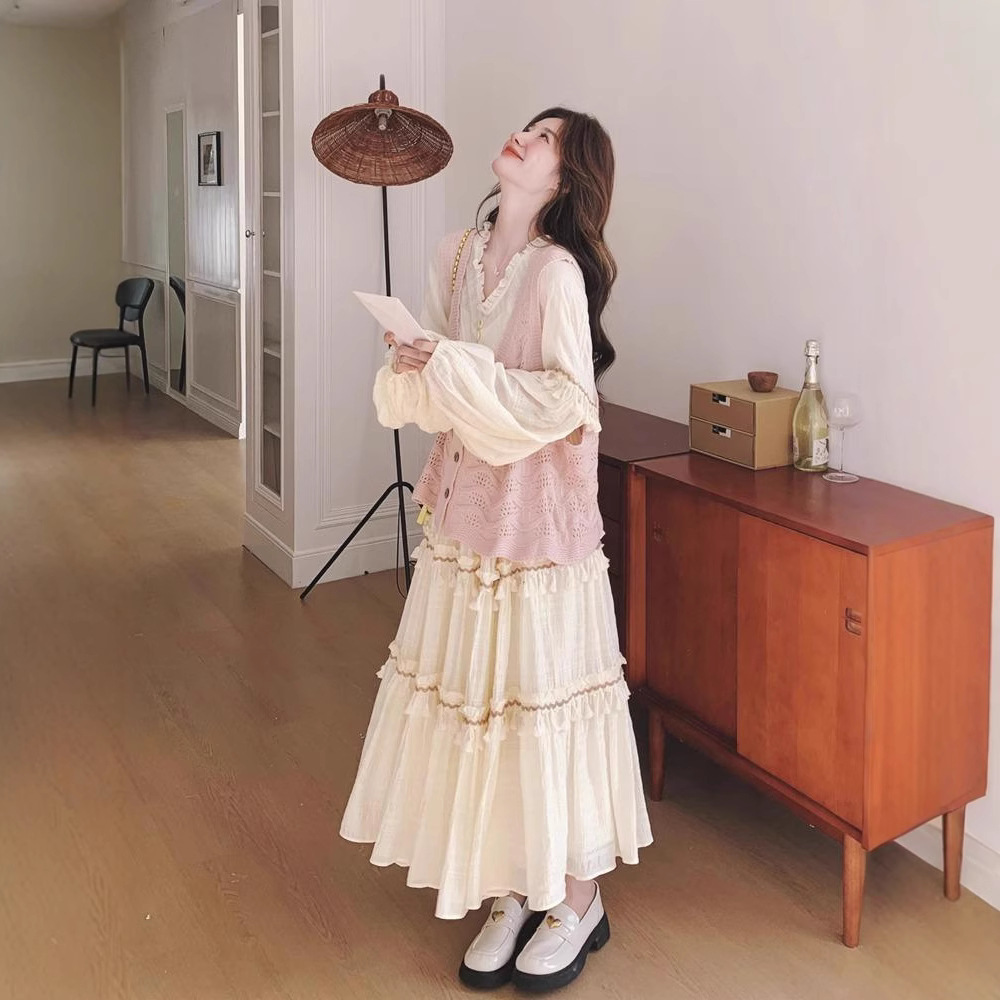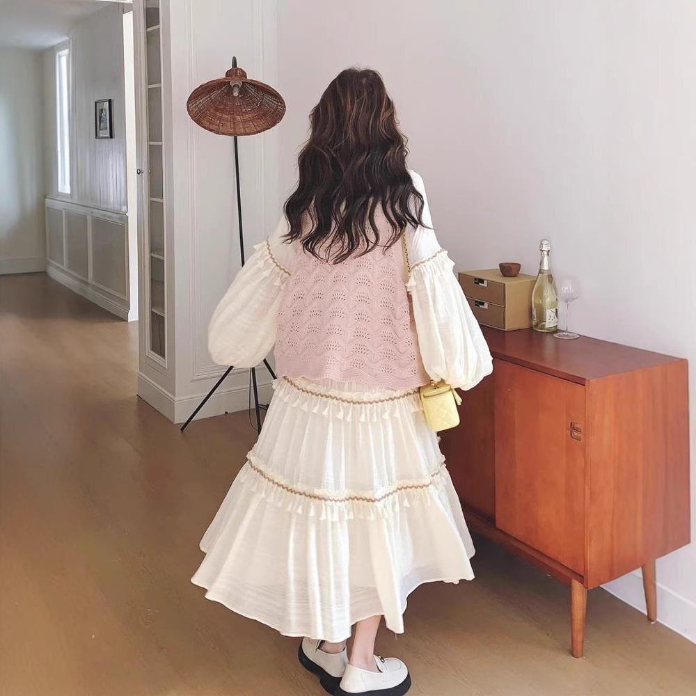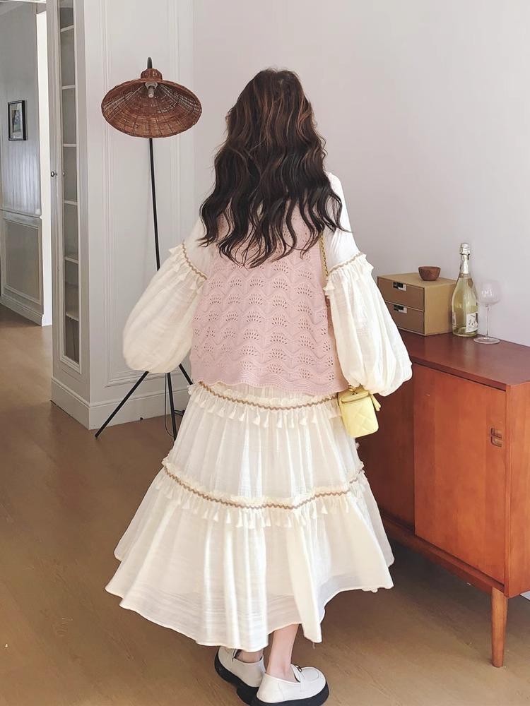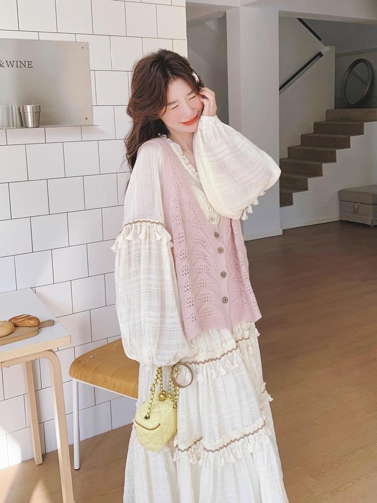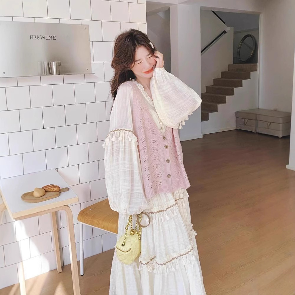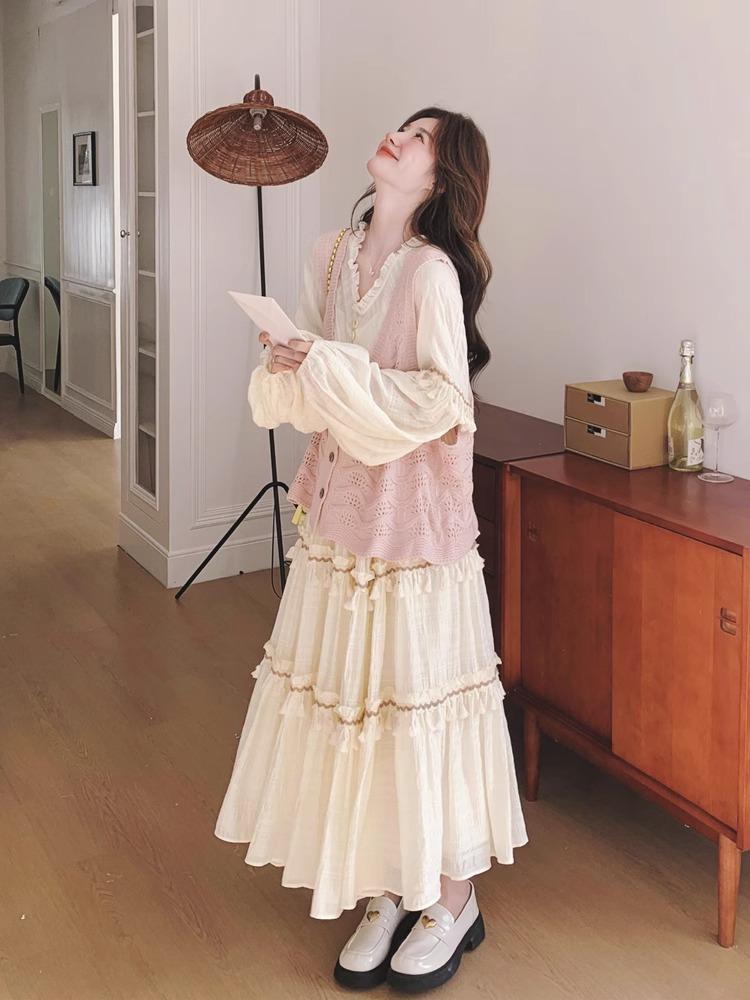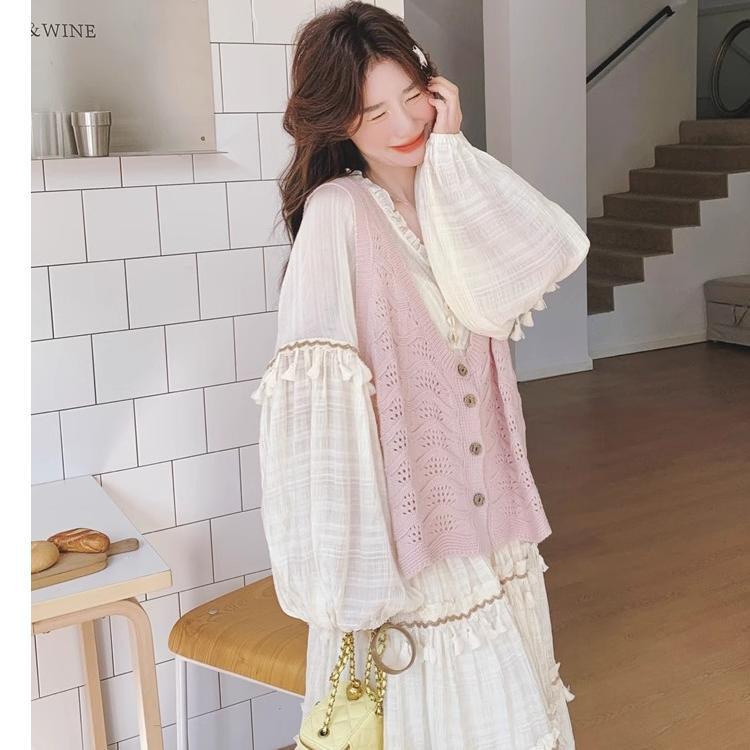 핑크 첫사랑 소녀 달콤한 시대를 줄이는 조끼 부드러운 프랑스 술 긴 원피스 새로운 투피스 원피스 여성의 봄