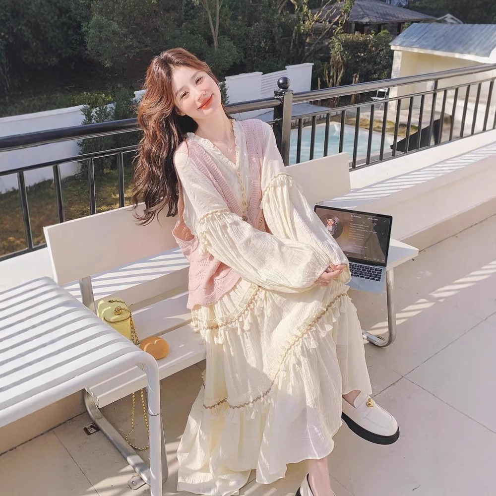 핑크 첫사랑 소녀 달콤한 시대를 줄이는 조끼 부드러운 프랑스 술 긴 원피스 새로운 투피스 원피스 여성의 봄스토어 가기