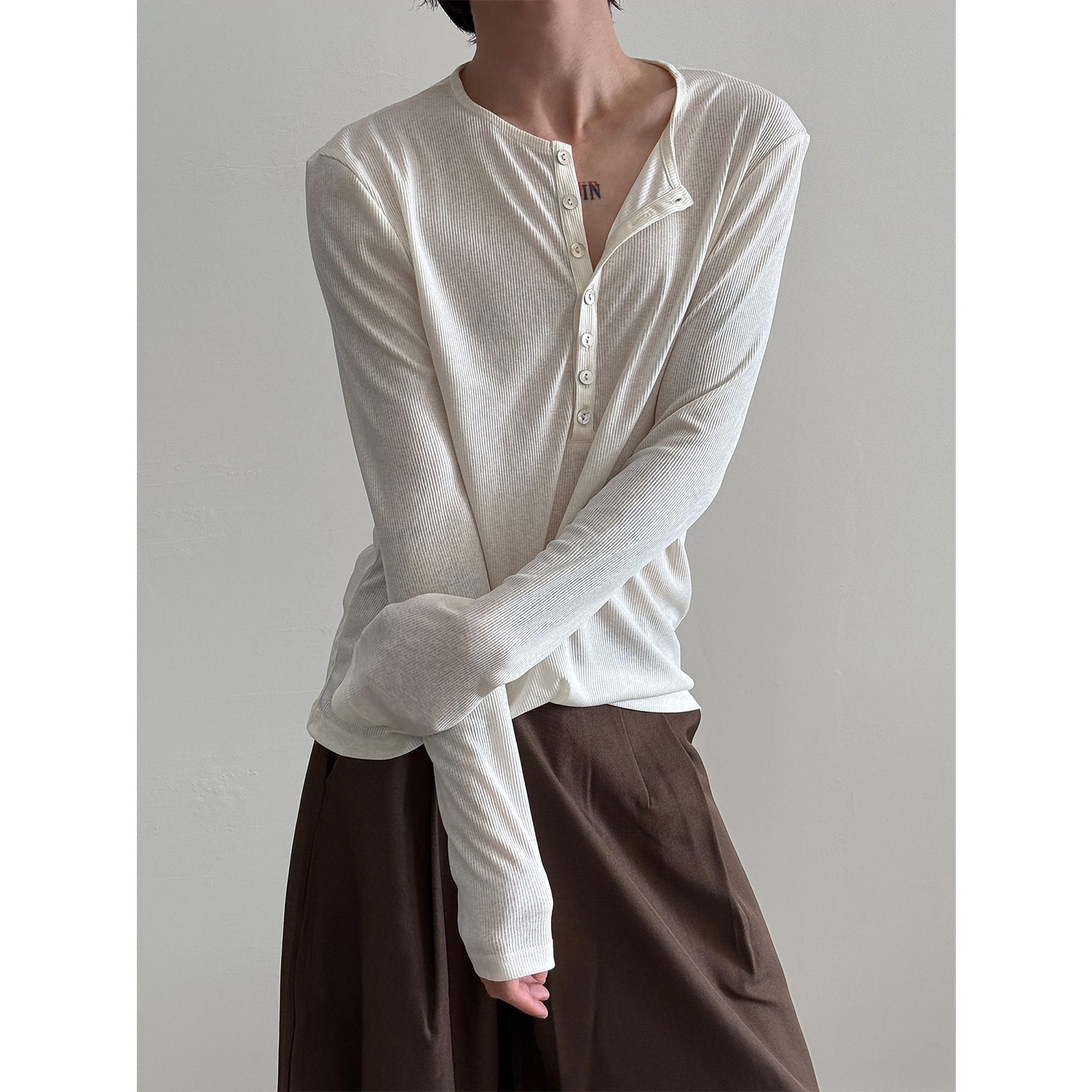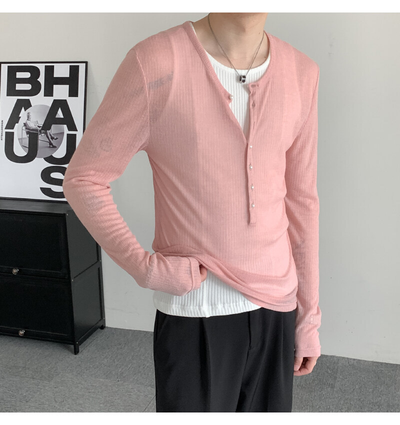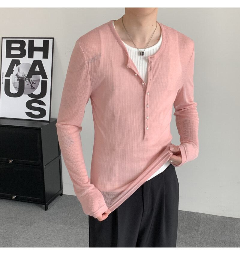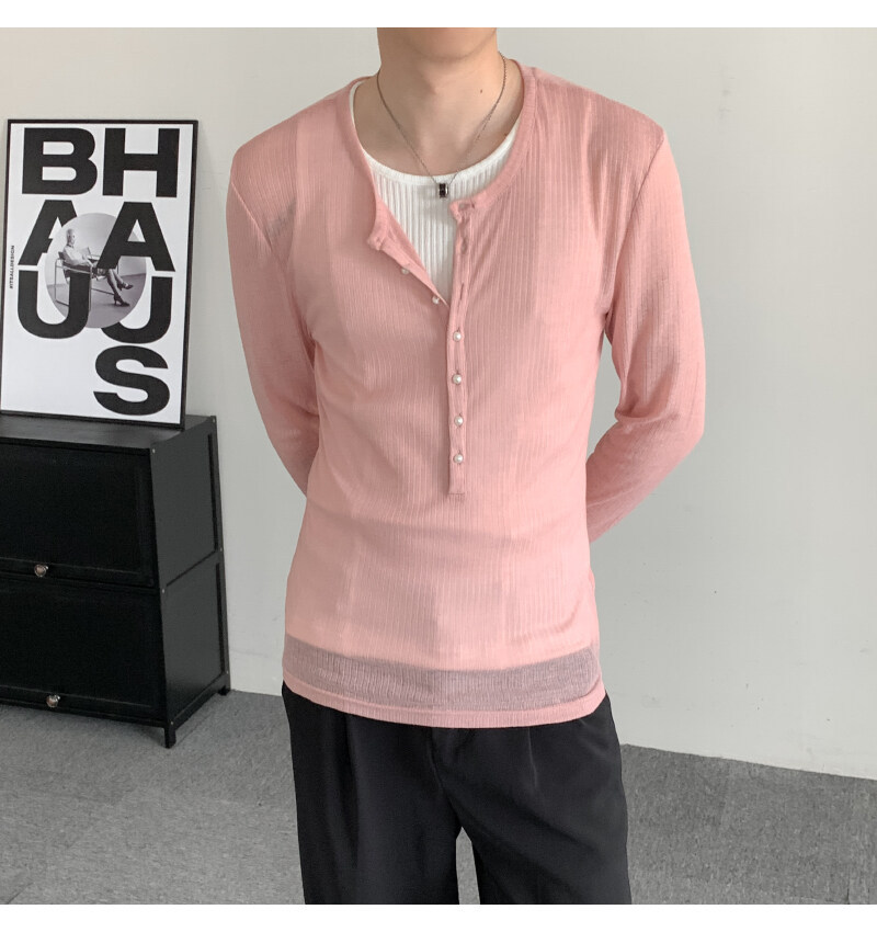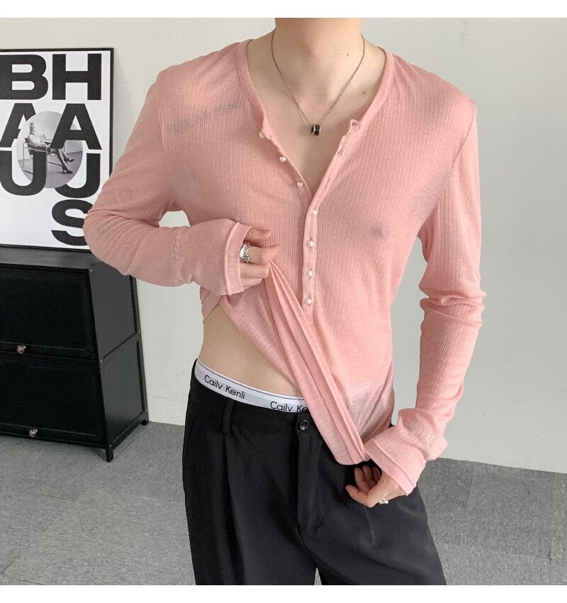 에메랄드 그린 딥 브이넥 시스루 긴팔 티셔츠 남성용 금욕 슬림핏 튤 블라우스 레이지 이너 헨리넥 탑스토어 가기