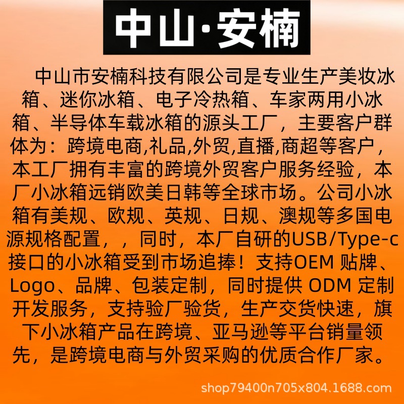 中山市安楠科技有限公司是一家专注于小型制冷家电研发、生产、销售于一体的专业迷你冰箱工厂、迷你冰箱厂家,更是行业内值得信赖的迷你冰箱源头工厂,深耕行业多年,始终以跨境电商、外贸公司、国外商超为核心服务对象,专注迷你冰箱、小型冰箱、小冰箱、迷你小冰箱全品类生产,凭借过硬的产品品质、完善的定制服务和高效的供应链体系,成为海内外客户信赖的核心供应商,产品远销欧美等全球主流市场,在亚马逊等跨境平台销量遥遥领先,用专业实力为跨境外贸客户筑牢供应链优势,助力客户抢占迷你冰箱跨境批发、迷你冰箱批发、车载冰箱批发、美妆冰箱批发等核心外贸市场。