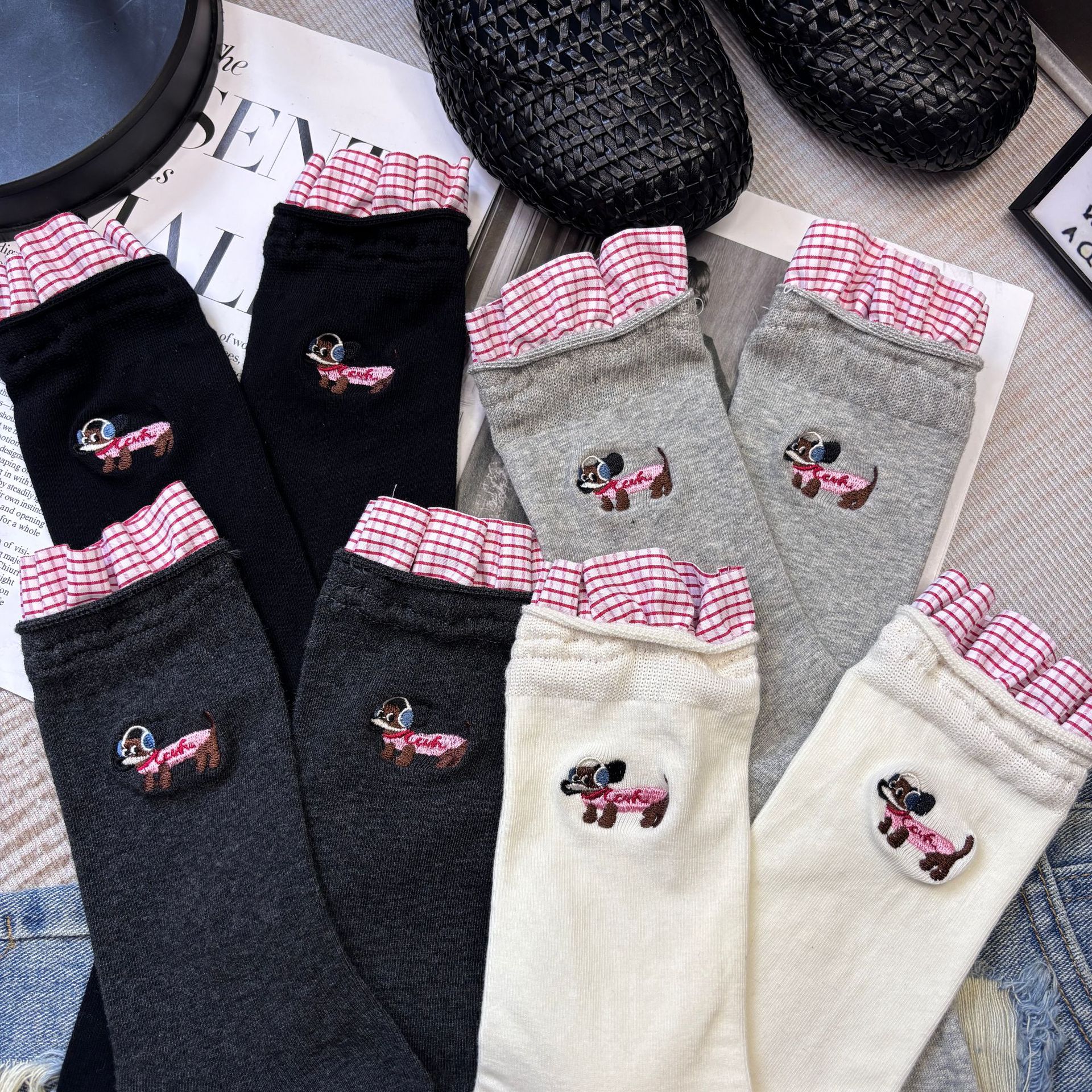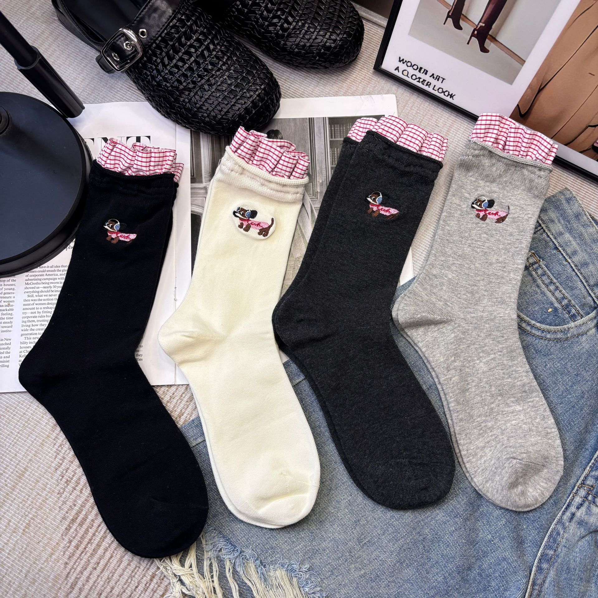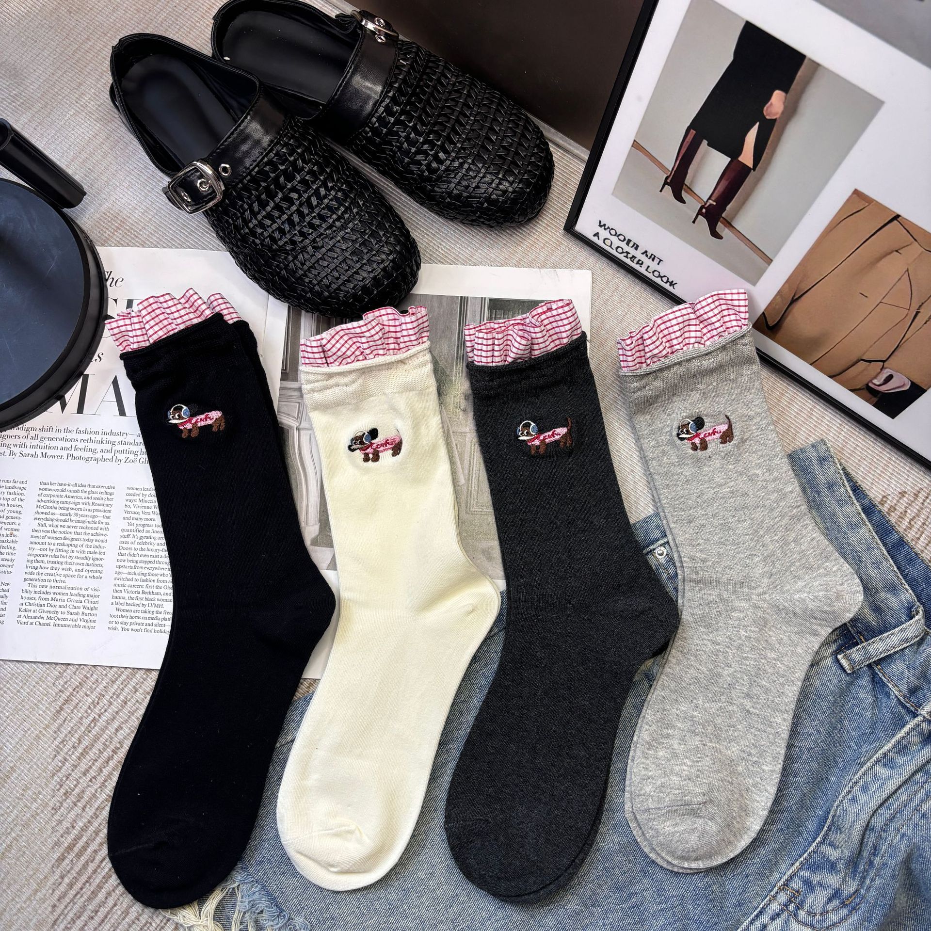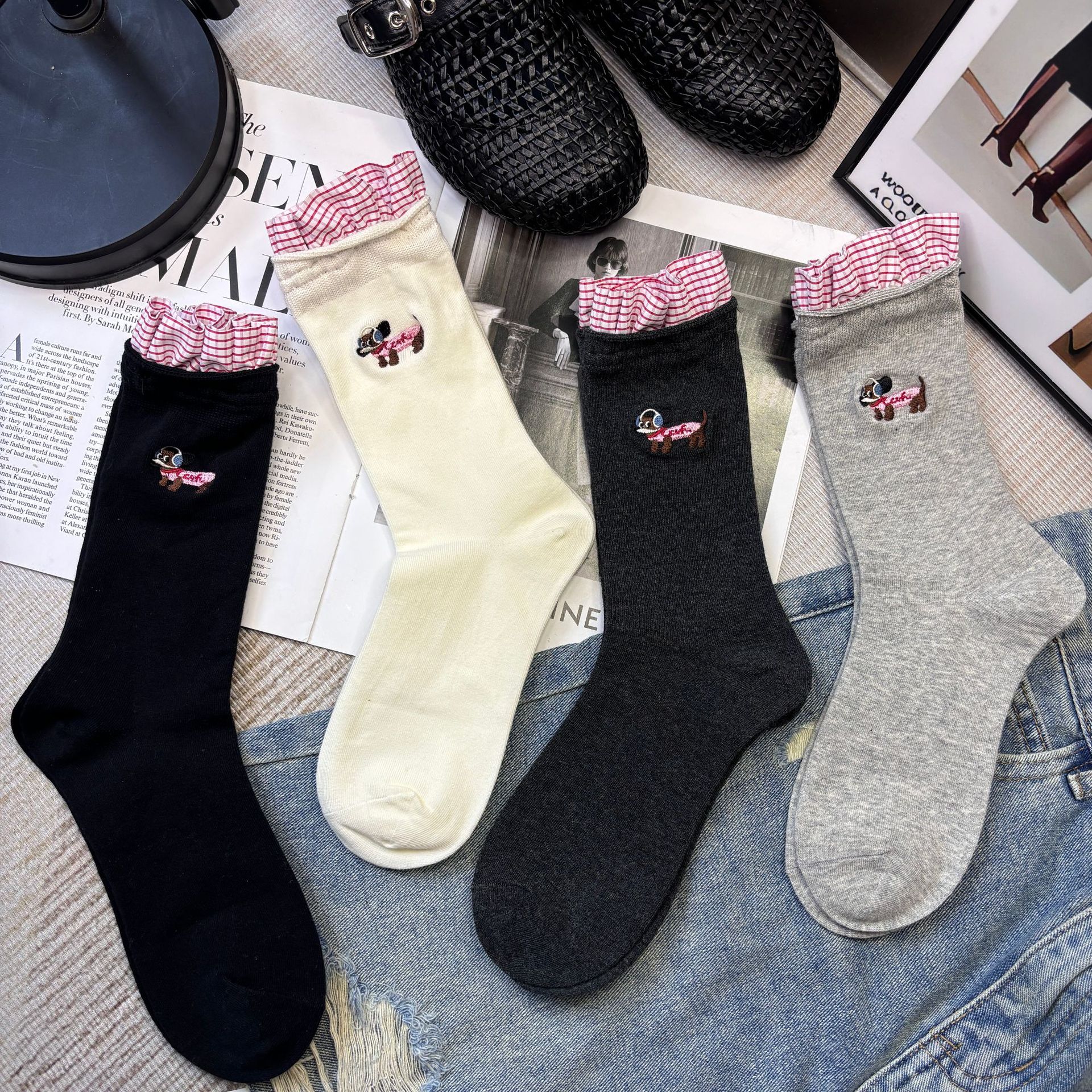 패션쇼 디자이너 세련된 양말 2025 봄과 여름 새로운 스타일 맞춤형 체크 무늬 바느질 강아지 자수 더미 양말 유행스토어 가기