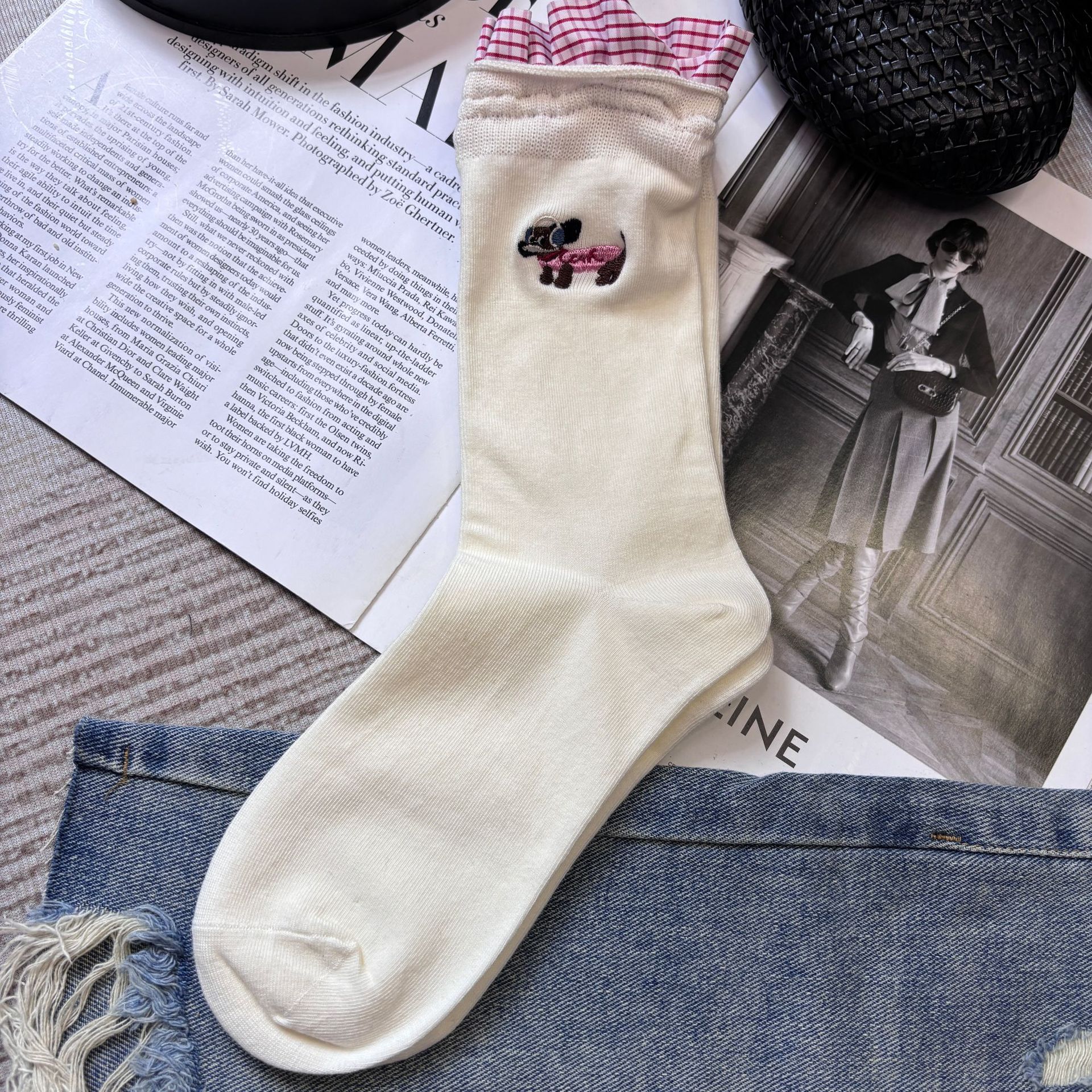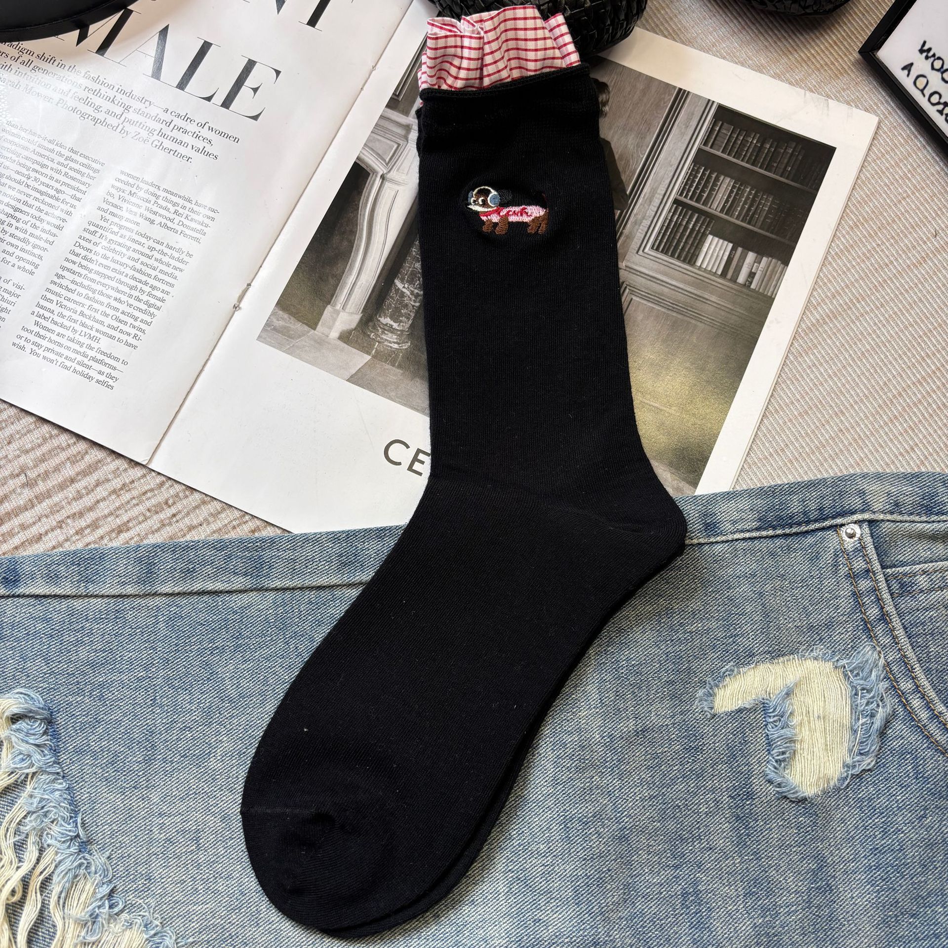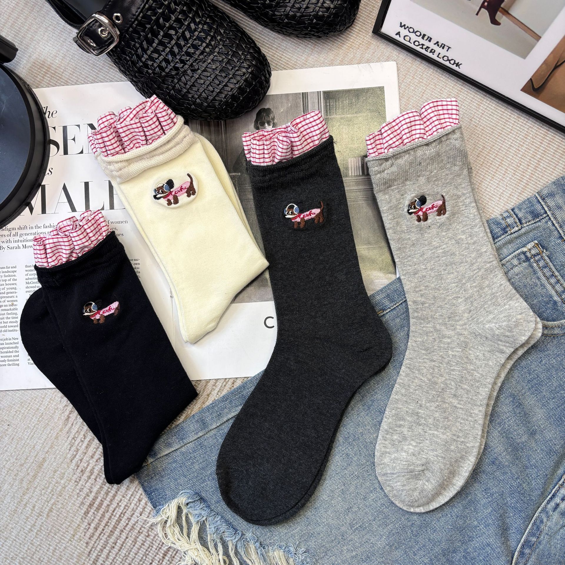 패션쇼 디자이너 세련된 양말 2025 봄과 여름 새로운 스타일 맞춤형 체크 무늬 바느질 강아지 자수 더미 양말 유행스토어 가기