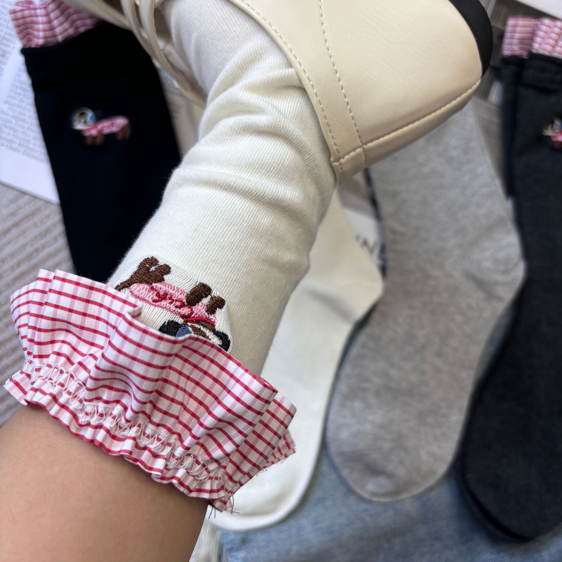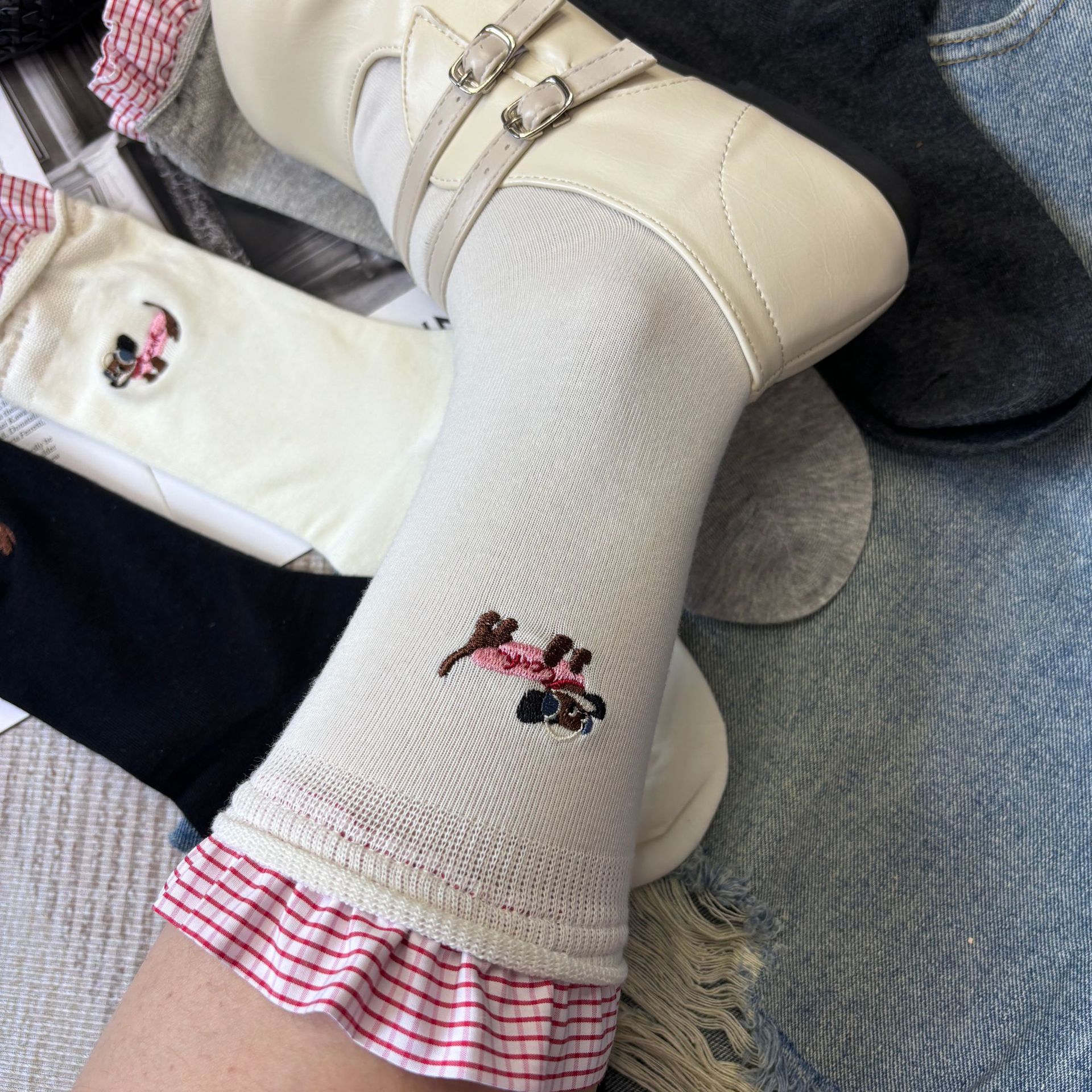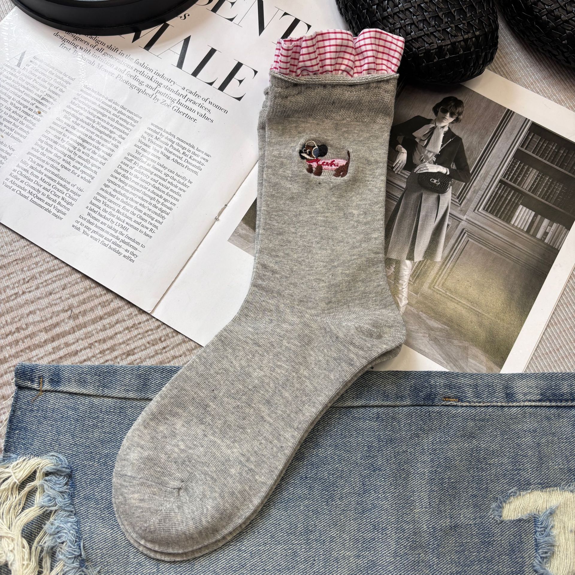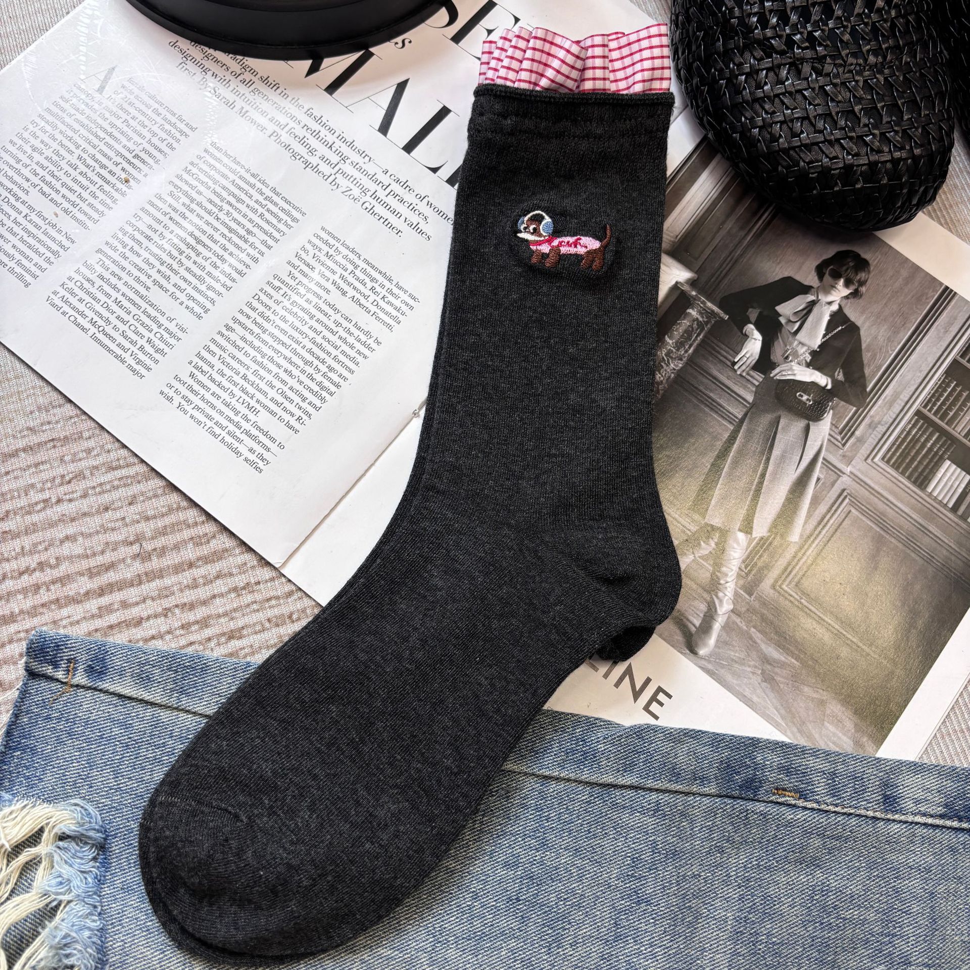 패션쇼 디자이너 세련된 양말 2025 봄과 여름 새로운 스타일 맞춤형 체크 무늬 바느질 강아지 자수 더미 양말 유행스토어 가기