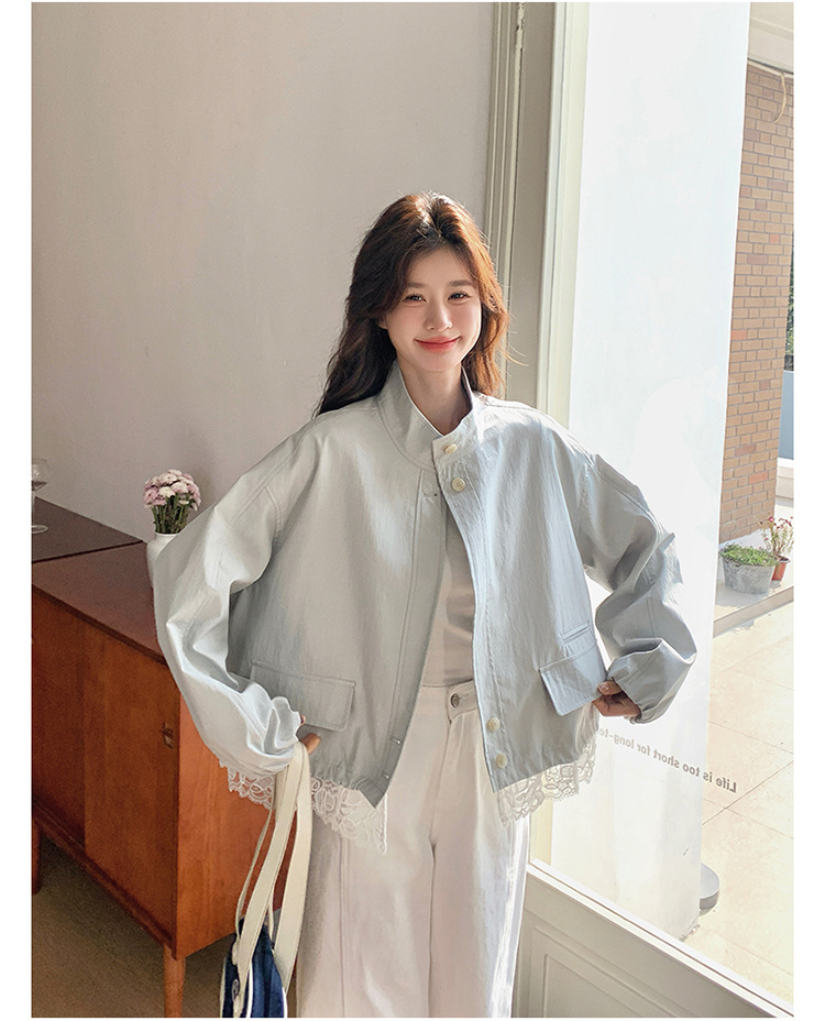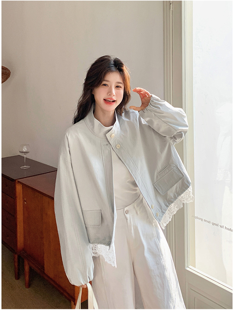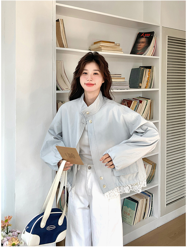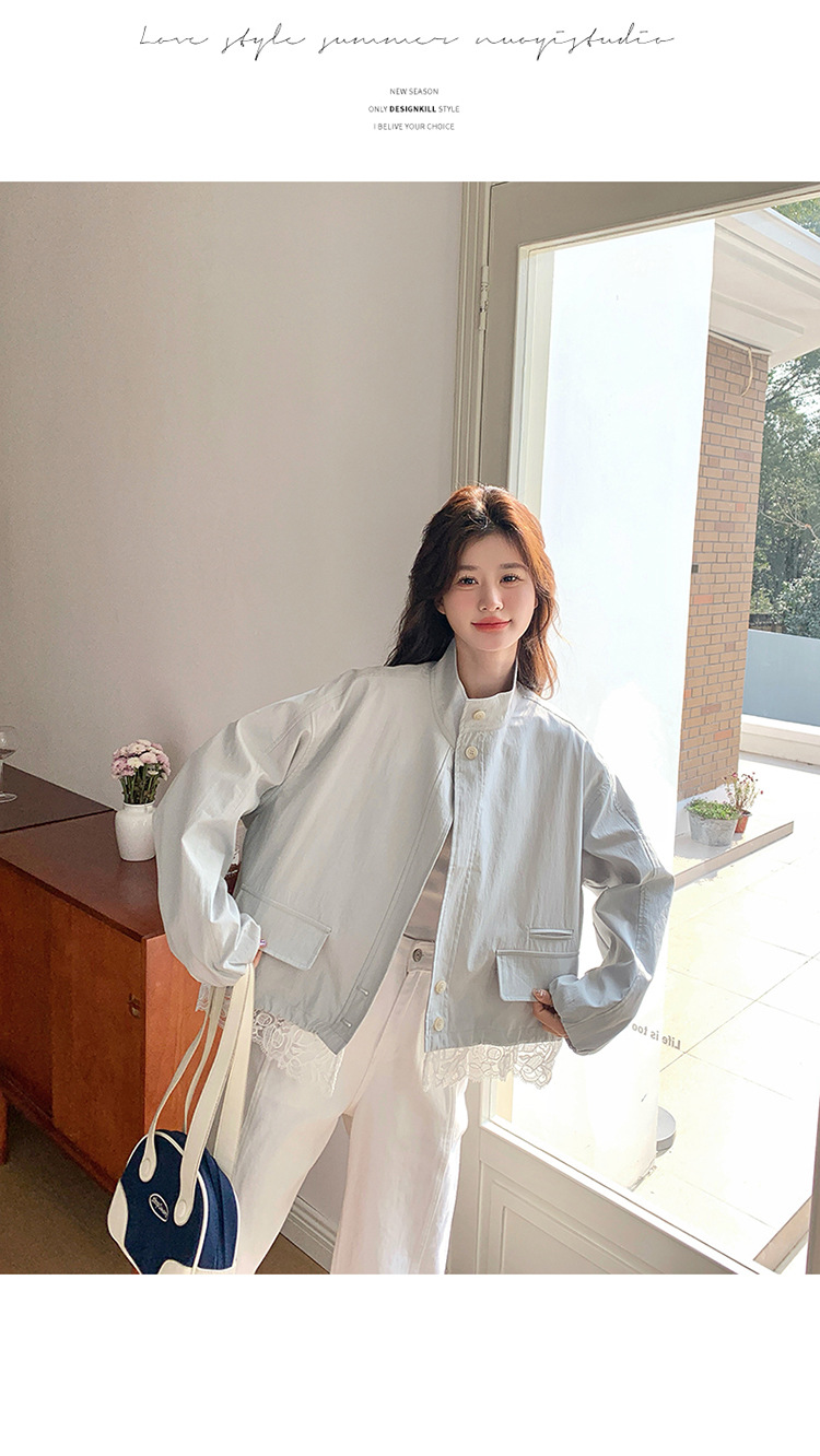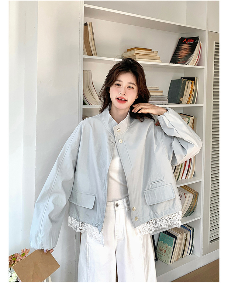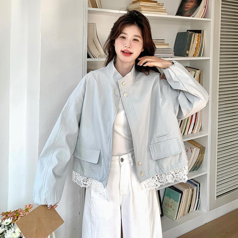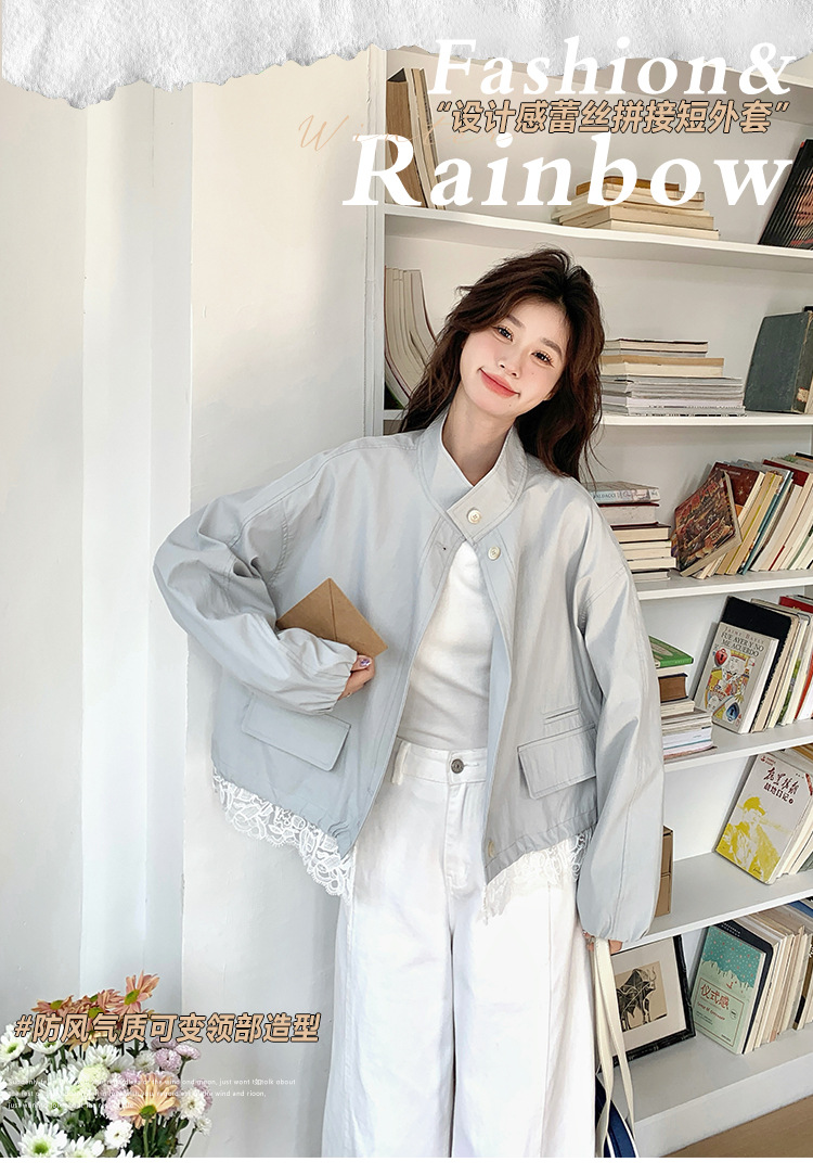 실제 샷 라이트 블루 디자인 센스 레이스 바느질 재킷 여성의 봄과 가을 새로운 캐주얼 대학 스타일 짧은 재킷스토어 가기