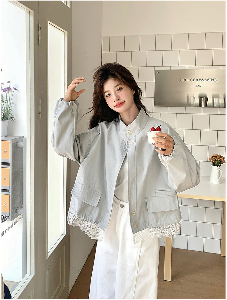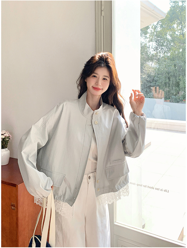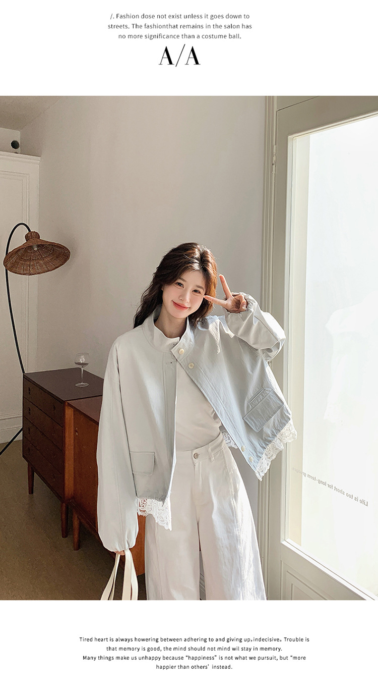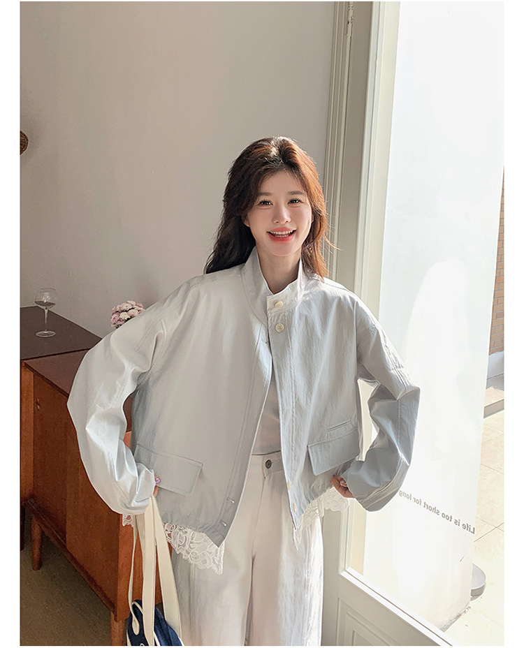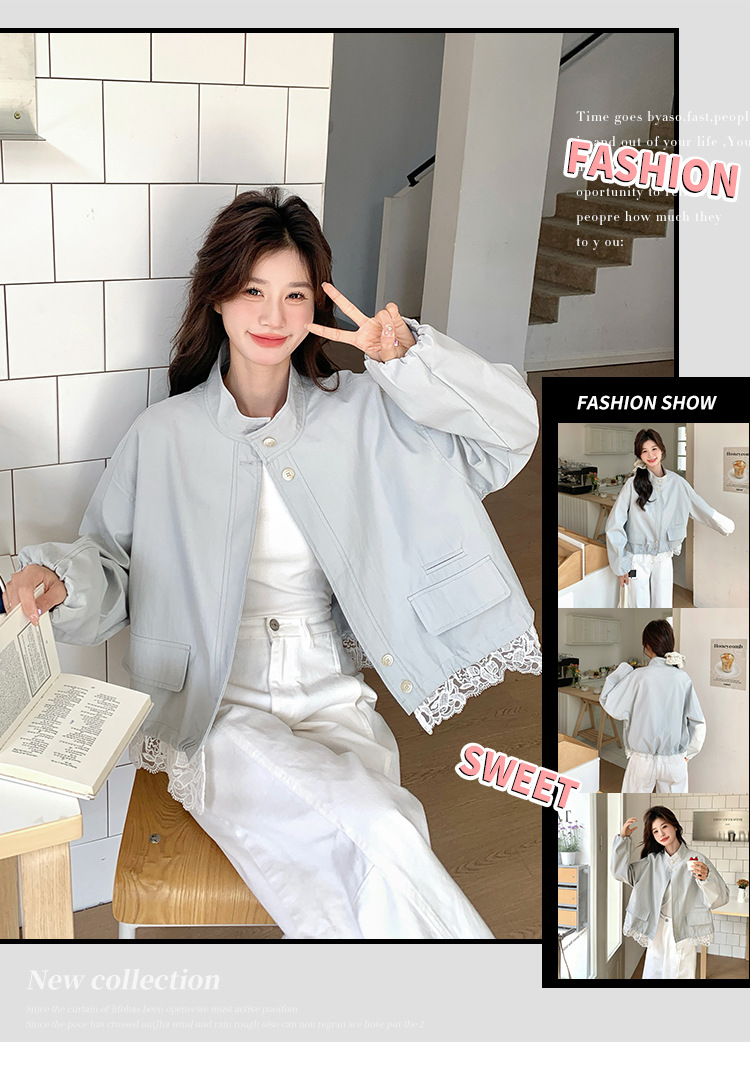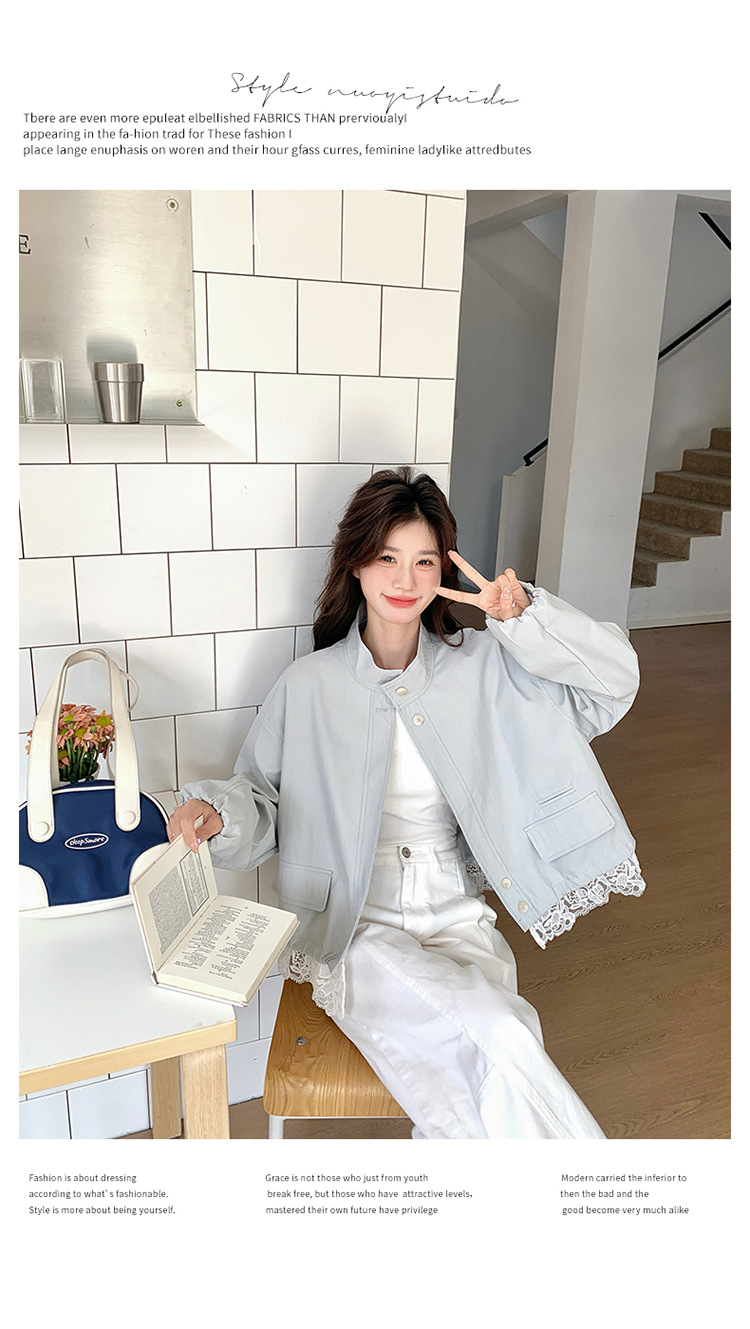 실제 샷 라이트 블루 디자인 센스 레이스 바느질 재킷 여성의 봄과 가을 새로운 캐주얼 대학 스타일 짧은 재킷스토어 가기