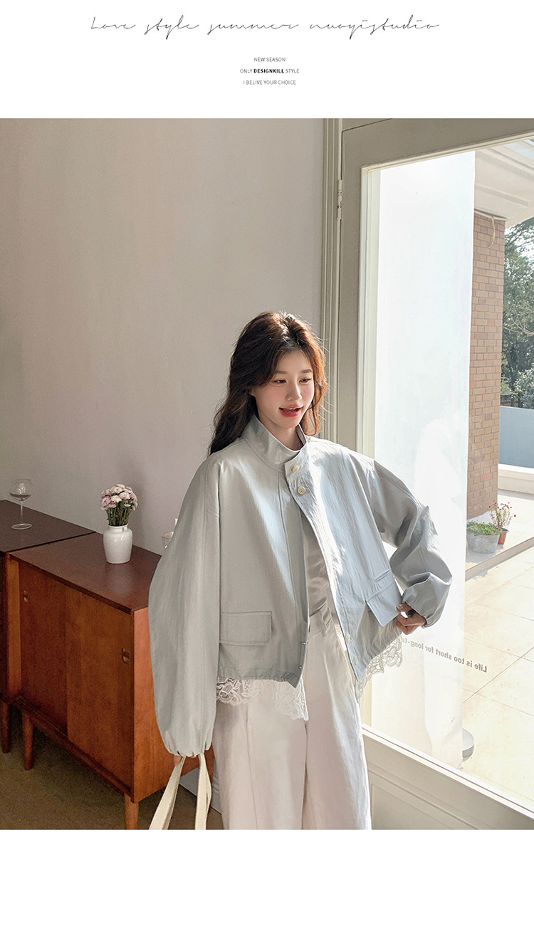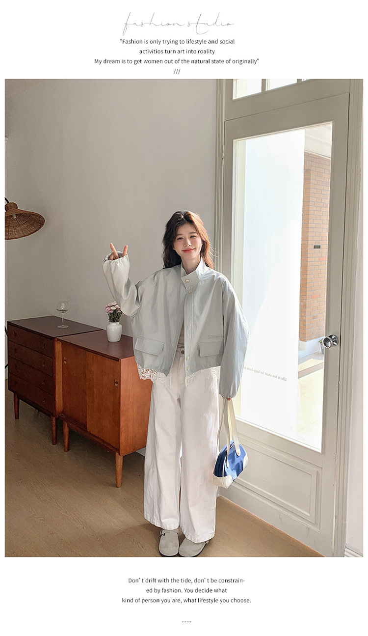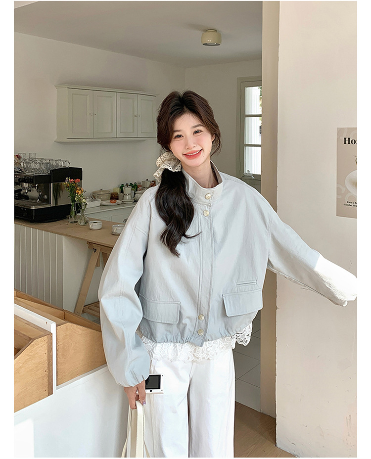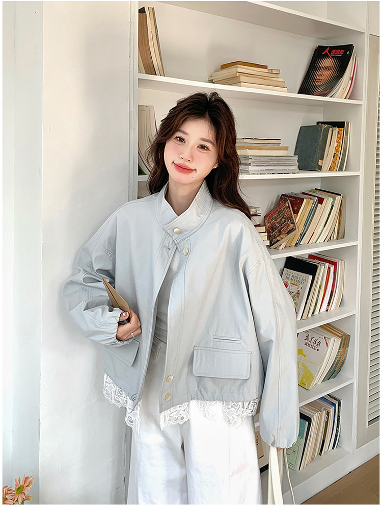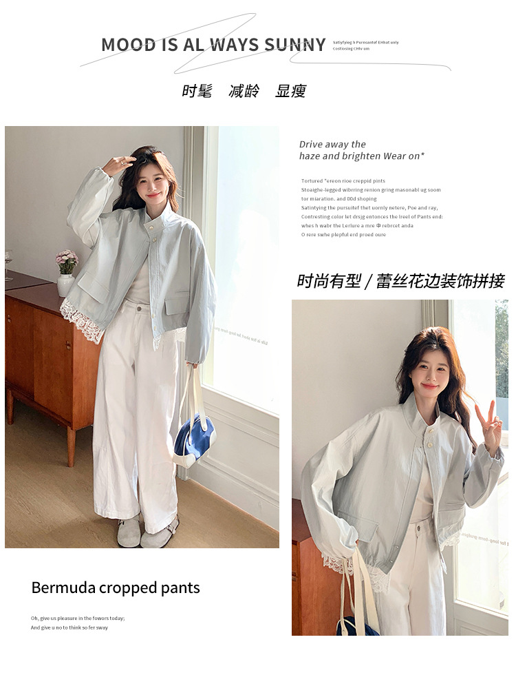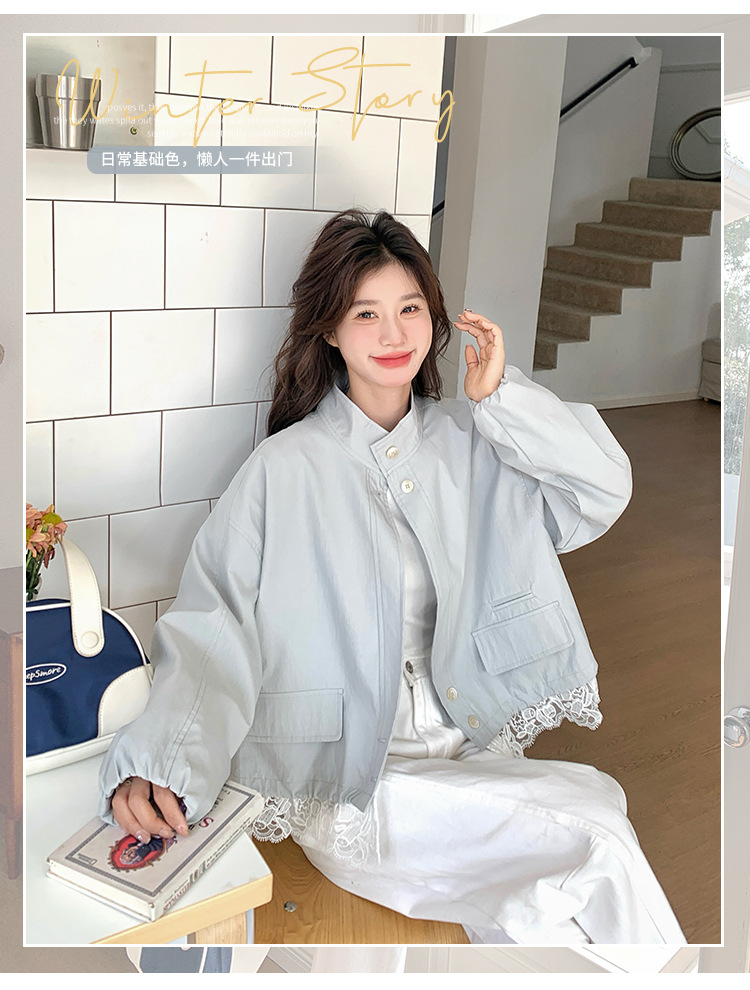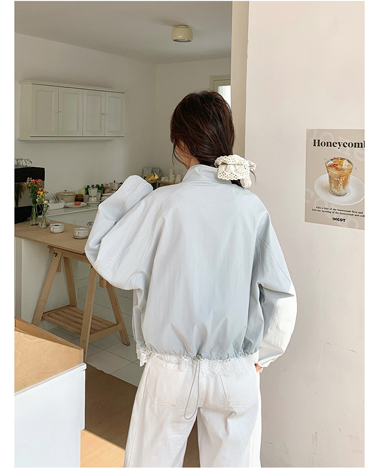 실제 샷 라이트 블루 디자인 센스 레이스 바느질 재킷 여성의 봄과 가을 새로운 캐주얼 대학 스타일 짧은 재킷스토어 가기