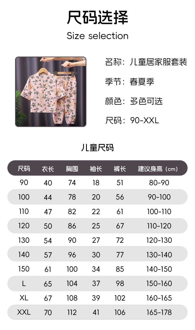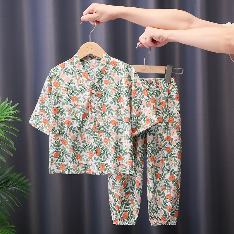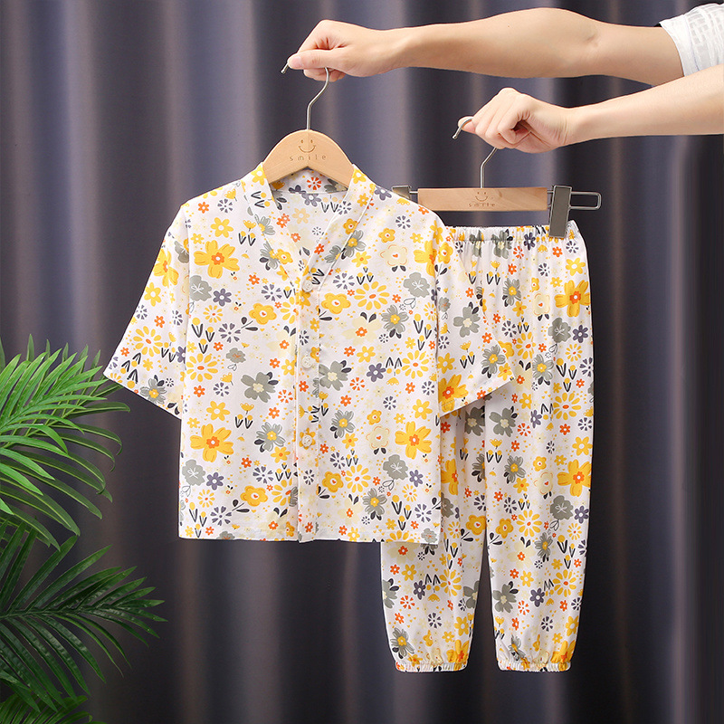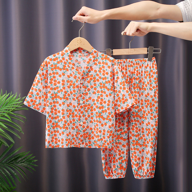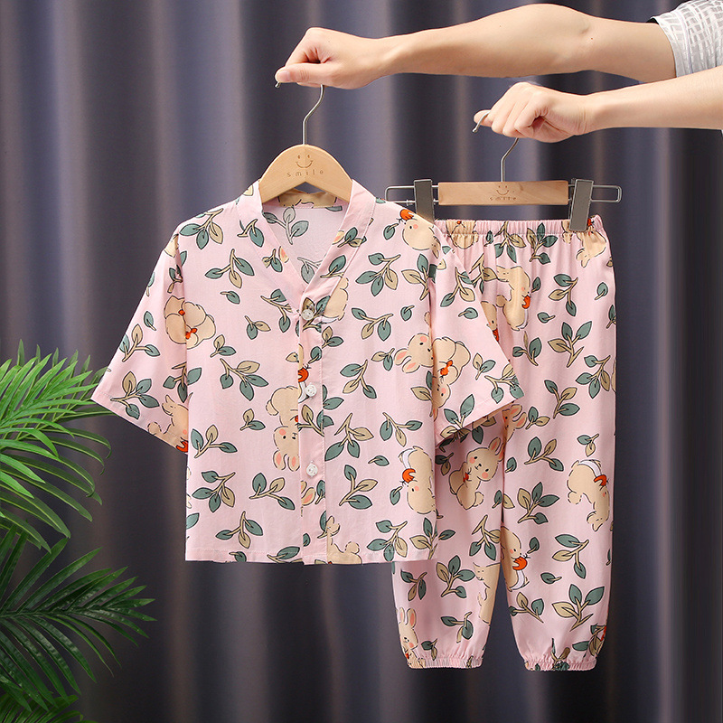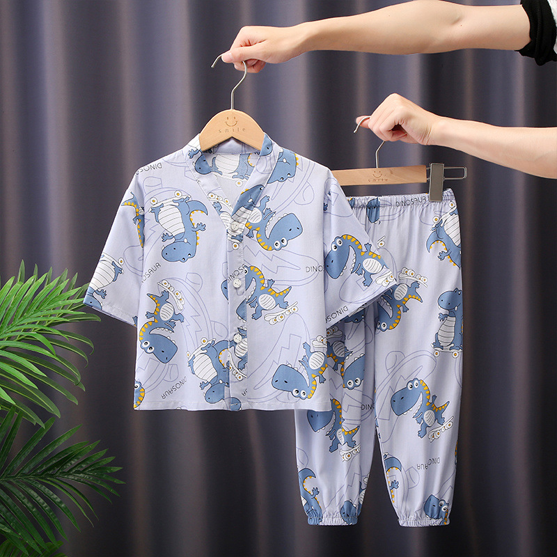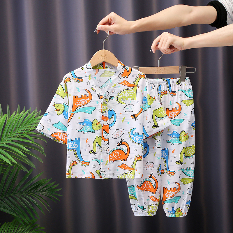 어린이 잠옷 여름 면화 실크 중간 소매 만화 카디건 소년과 소녀 얇은 중대형 어린이 아기 가정 의류 세트