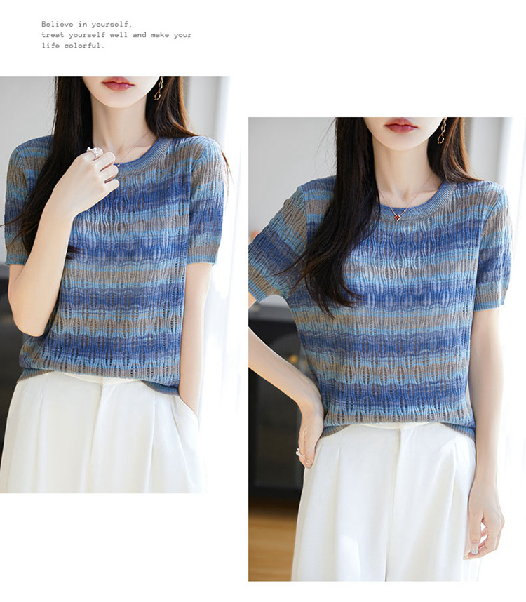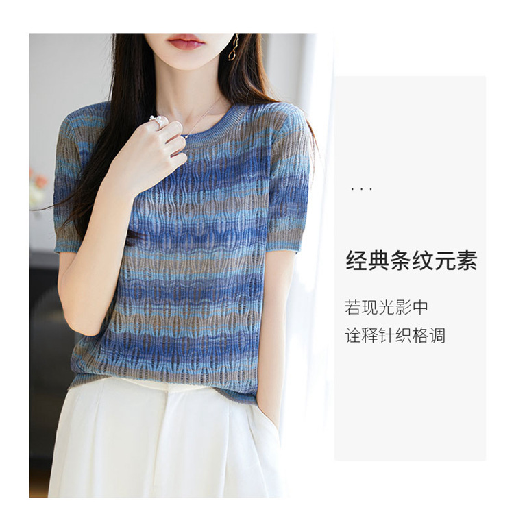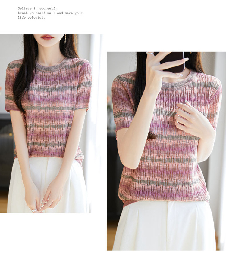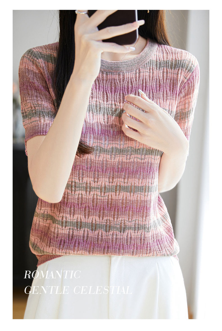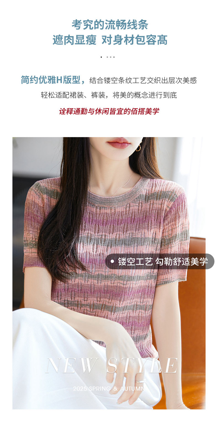 2025 년 봄과 여름 새로운 도착 Worsted 양모 크루 넥 스웨터 짧은 소매 티셔츠 여성의 무지개 줄무늬 중공베이스 셔츠스토어 가기
