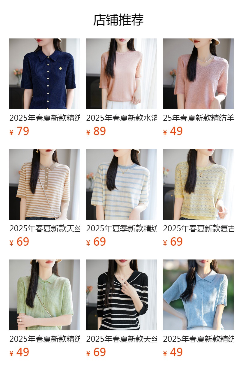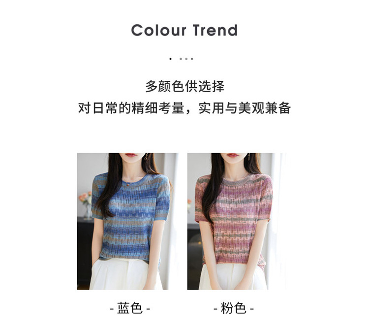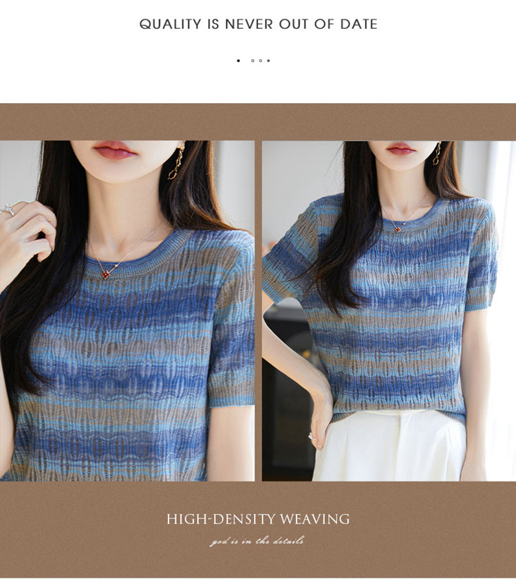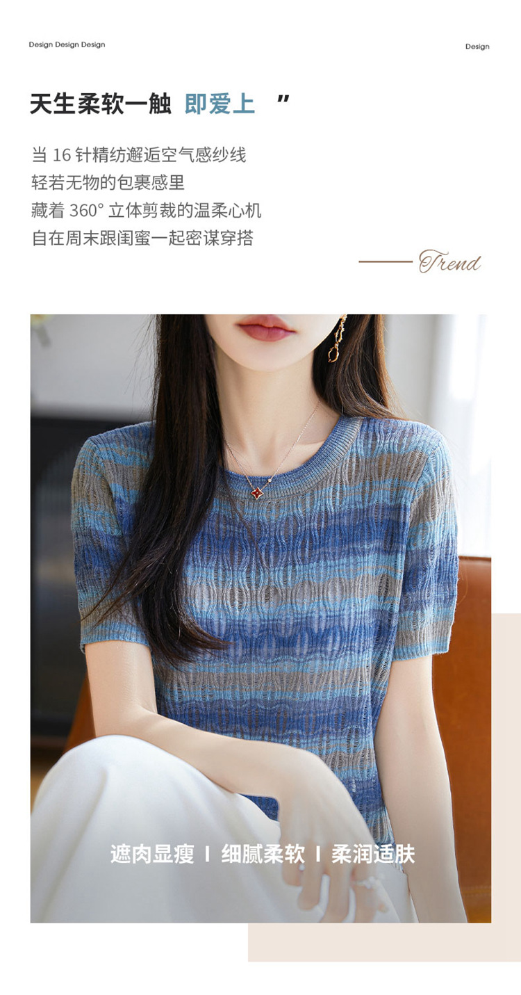 2025 년 봄과 여름 새로운 도착 Worsted 양모 크루 넥 스웨터 짧은 소매 티셔츠 여성의 무지개 줄무늬 중공베이스 셔츠스토어 가기