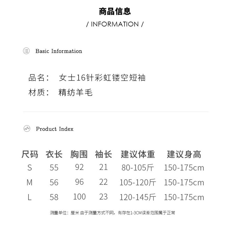 2025 년 봄과 여름 새로운 도착 Worsted 양모 크루 넥 스웨터 짧은 소매 티셔츠 여성의 무지개 줄무늬 중공베이스 셔츠