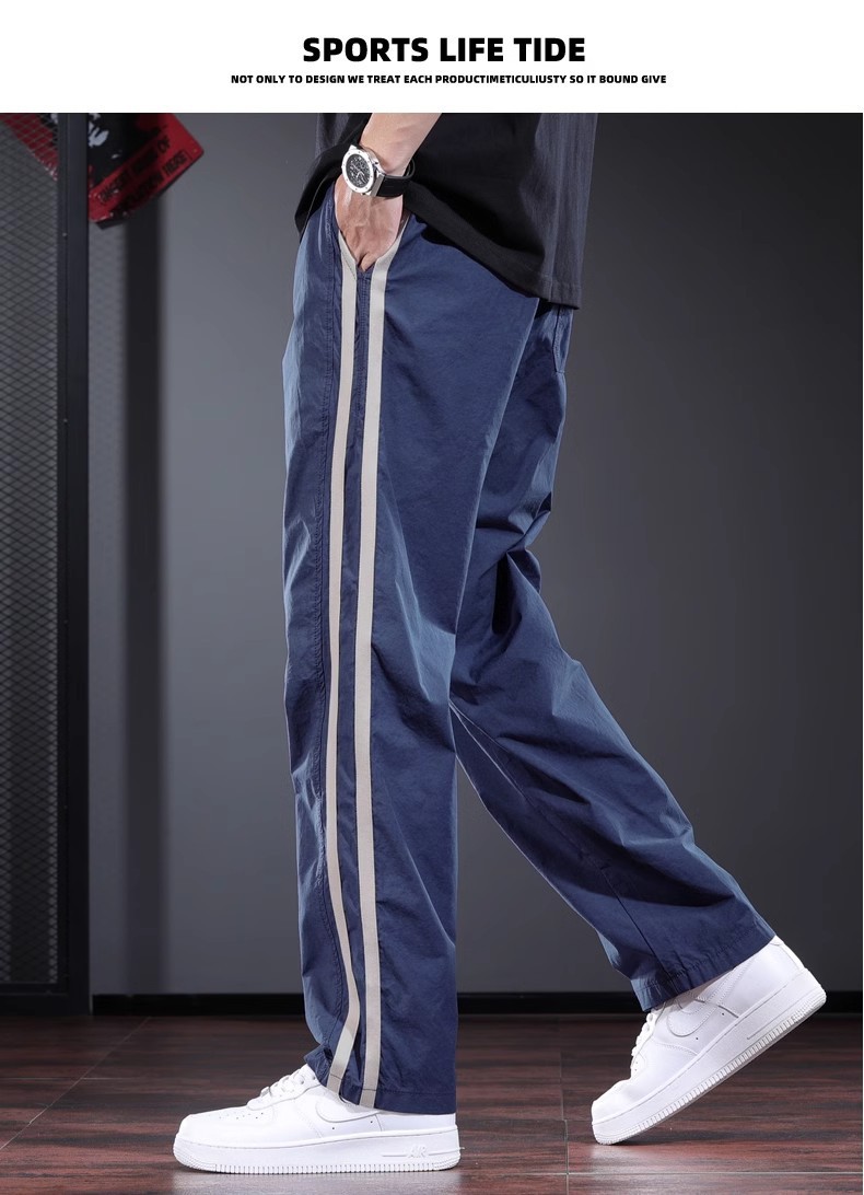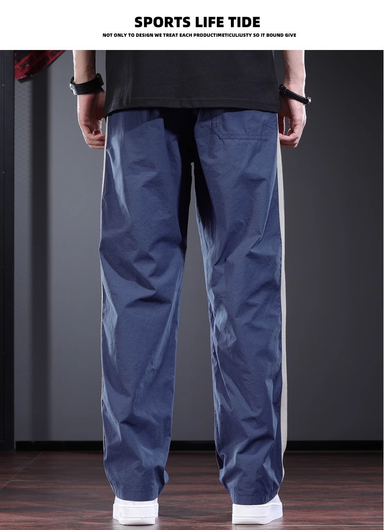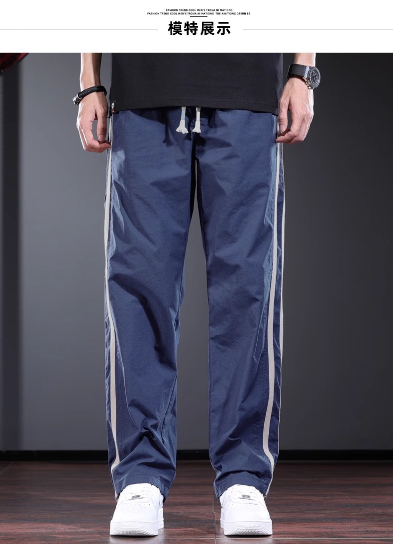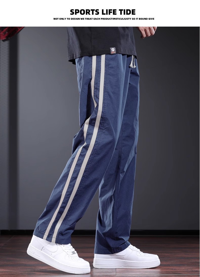 봄, 가을 남성용 아메리칸 스타일 엣지 스트라이프 캐주얼 팬츠 얇은 디자인 루즈 스트레이트 트렌디 블루 스포츠 바지스토어 가기