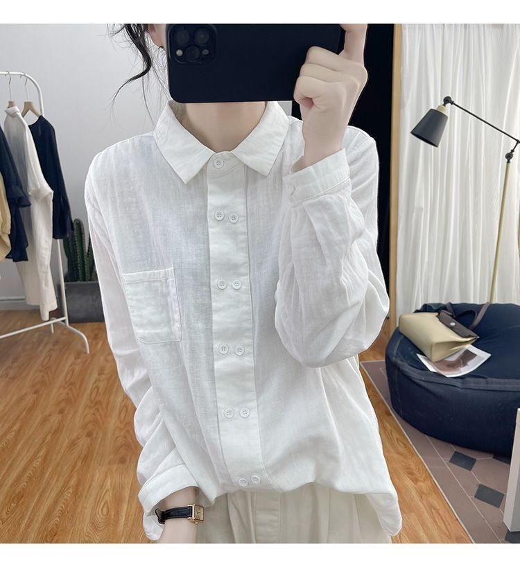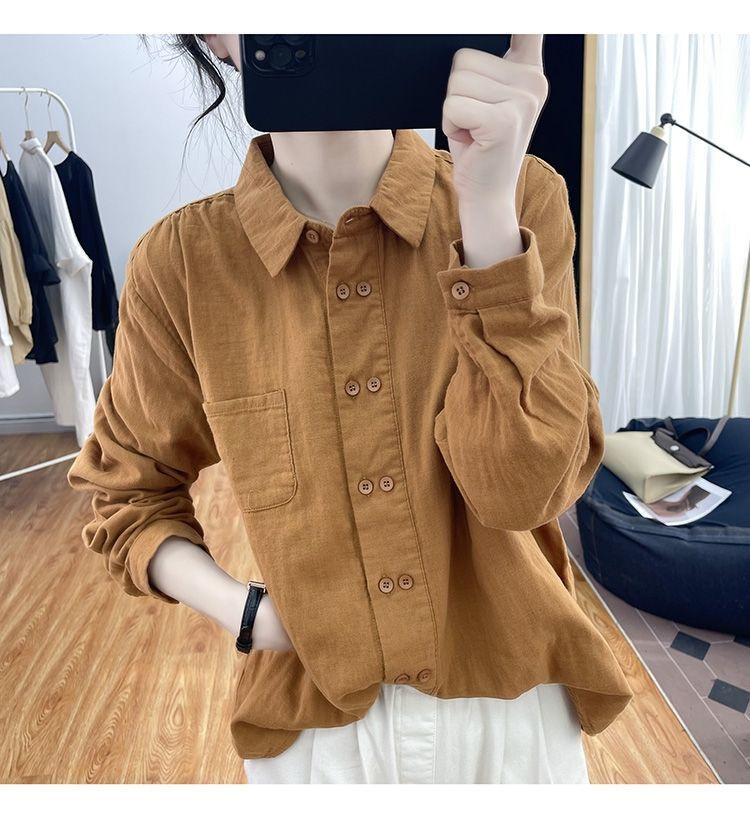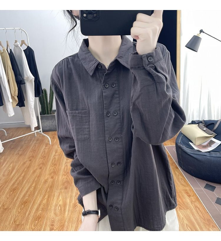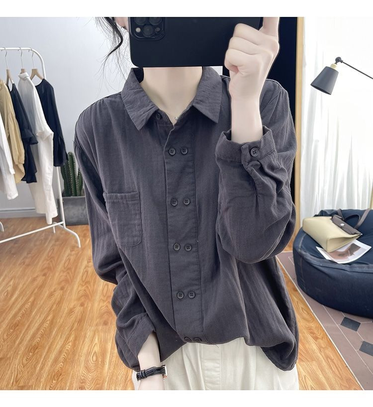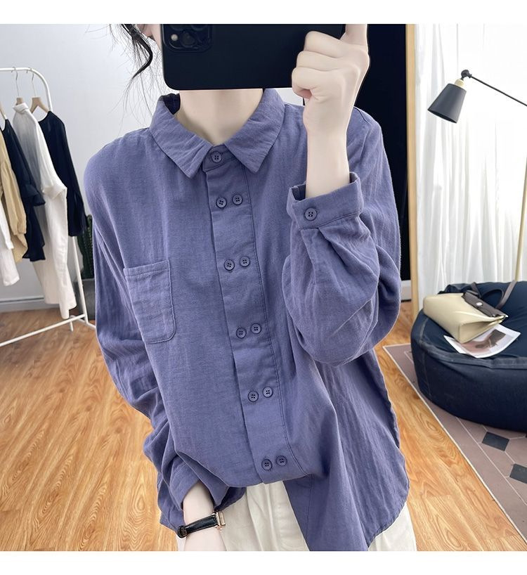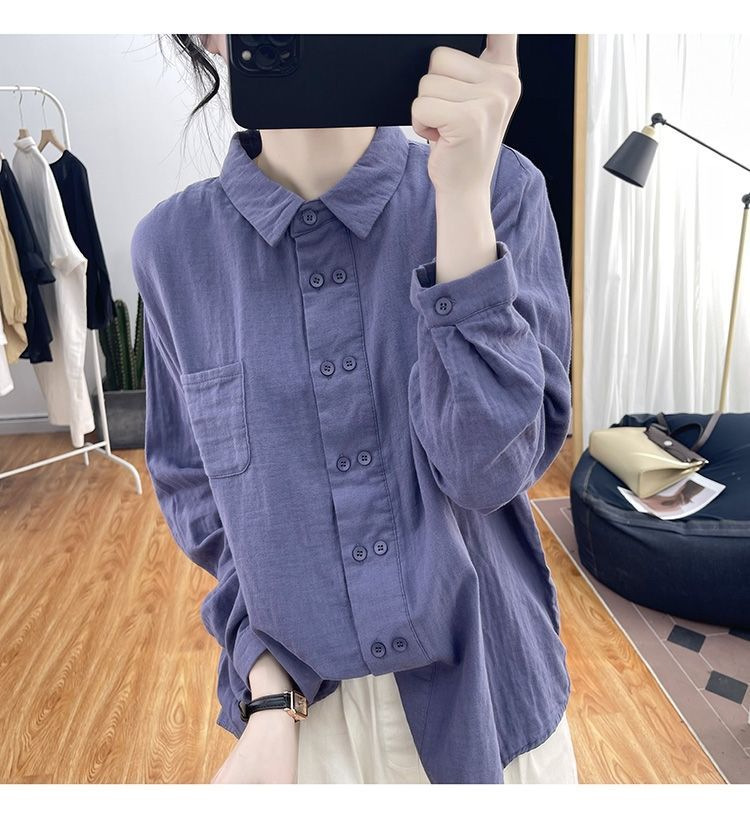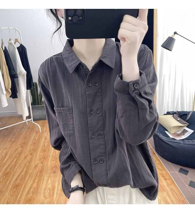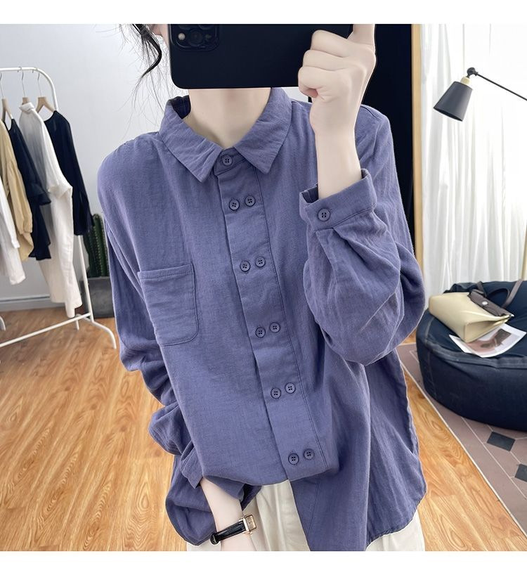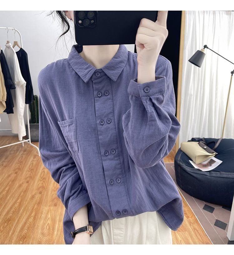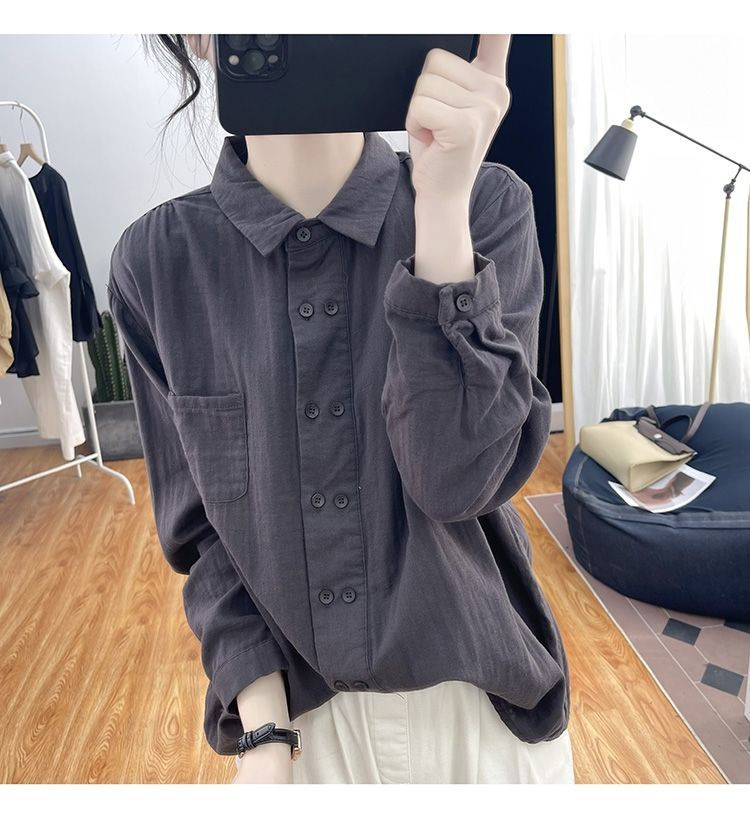 여성을위한 한국 스타일 더블 브레스트 코튼과 린넨 긴팔 셔츠 봄, 가을 새로운 폴로 칼라 이너 탑 루즈 디자인 셔츠스토어 가기