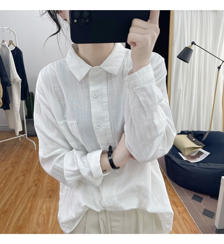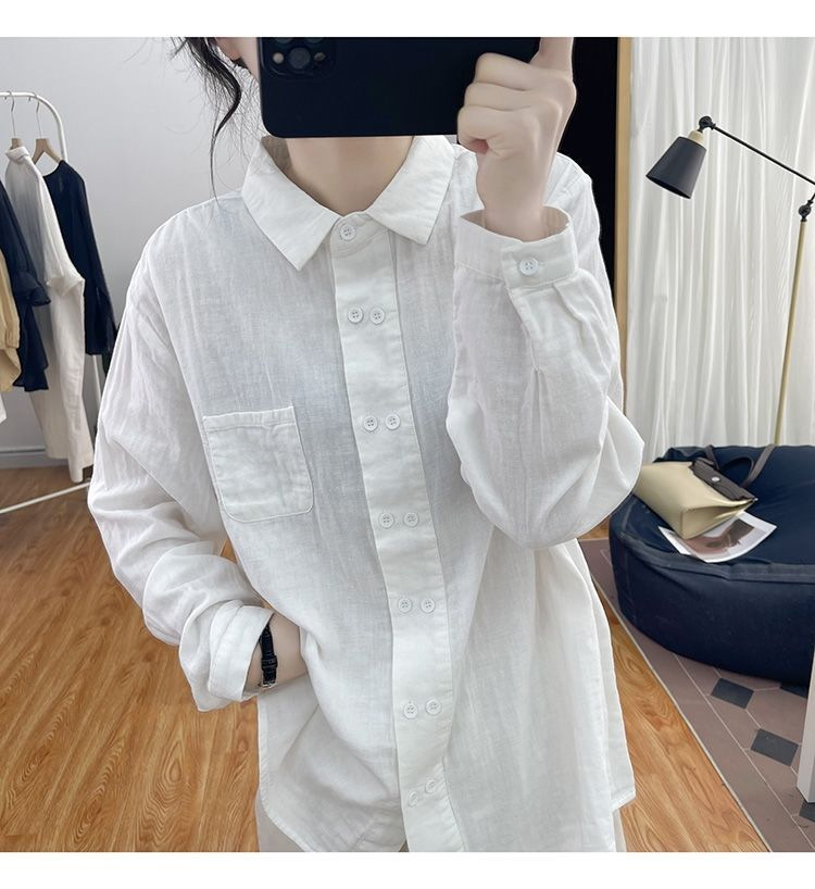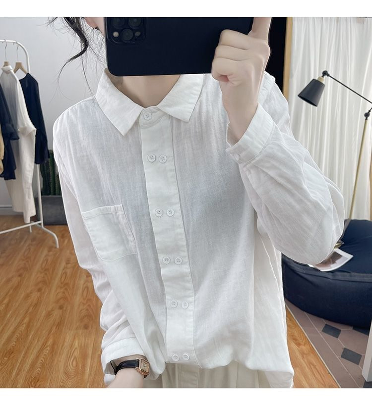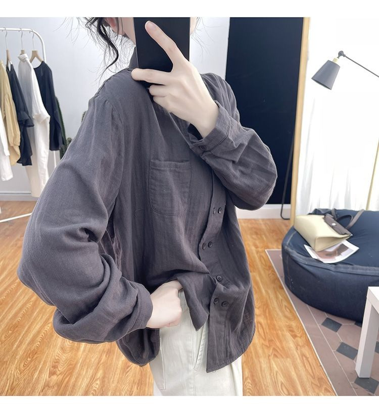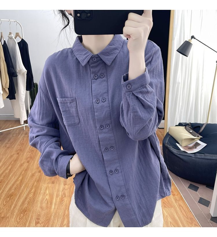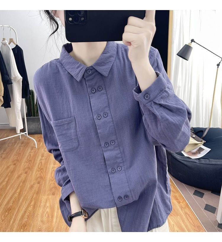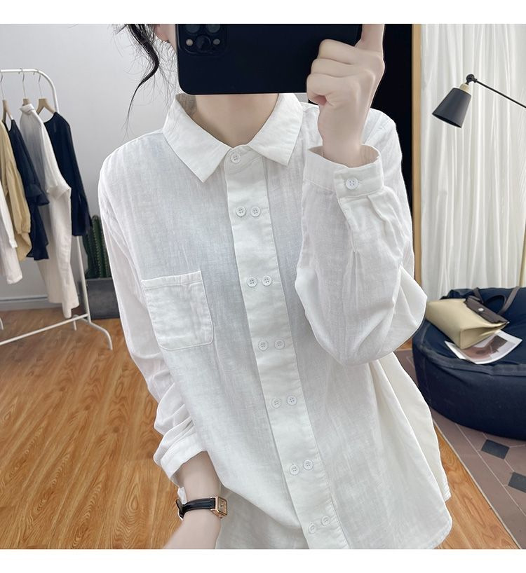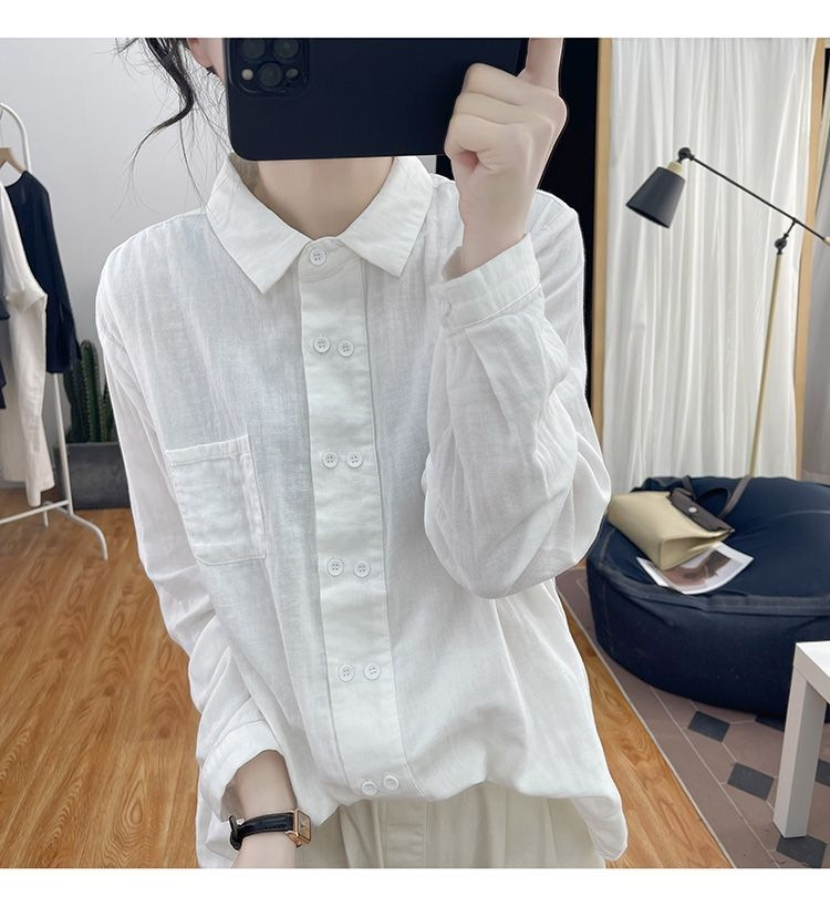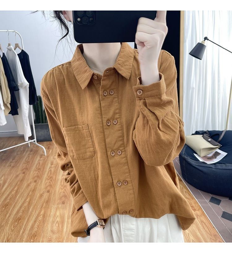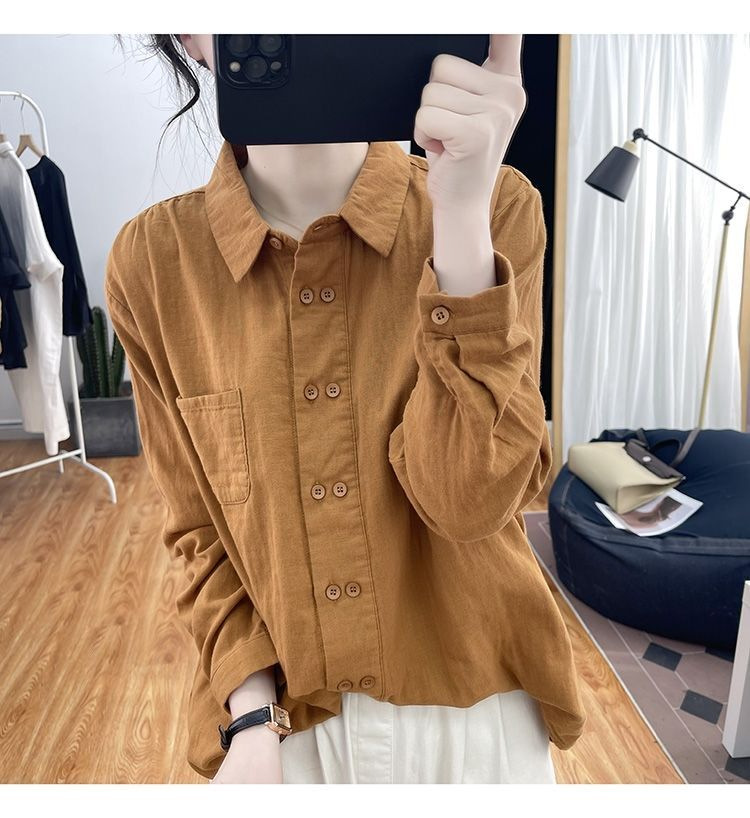 여성을위한 한국 스타일 더블 브레스트 코튼과 린넨 긴팔 셔츠 봄, 가을 새로운 폴로 칼라 이너 탑 루즈 디자인 셔츠스토어 가기