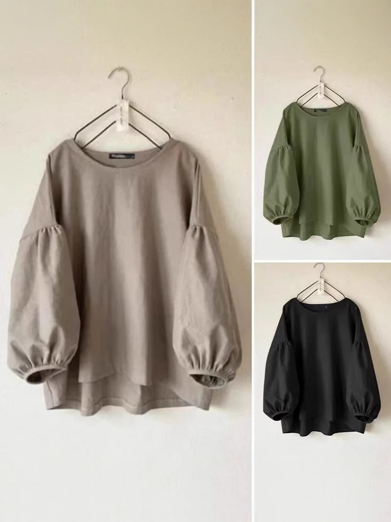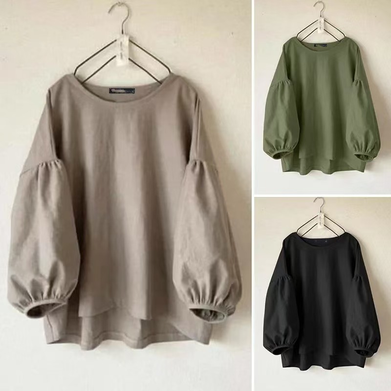 크로스 국경 2025 여성 느슨한 빈티지 셔츠 캐주얼 솔리드 컬러 라운드 넥 퍼프 슬리브 작업 셔츠