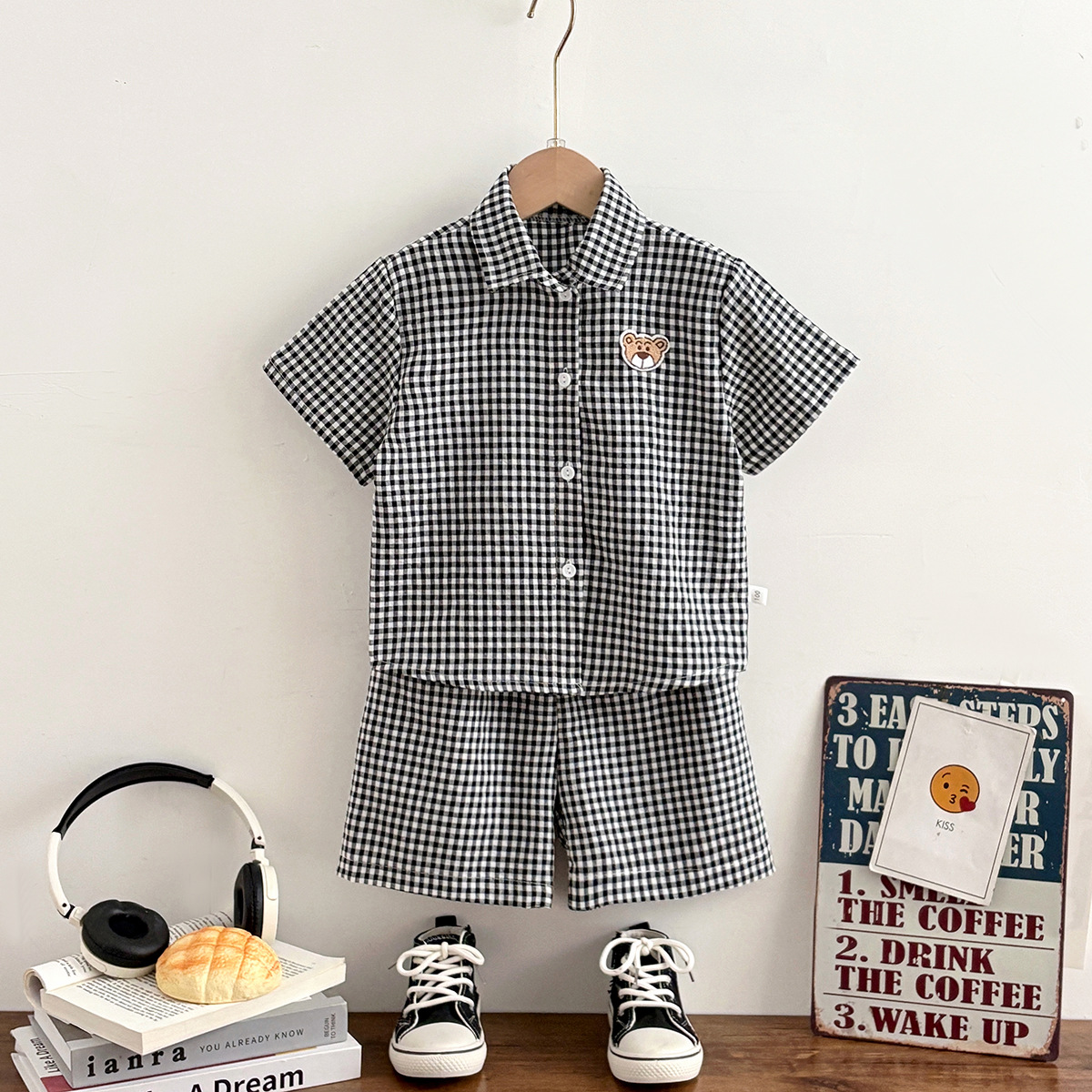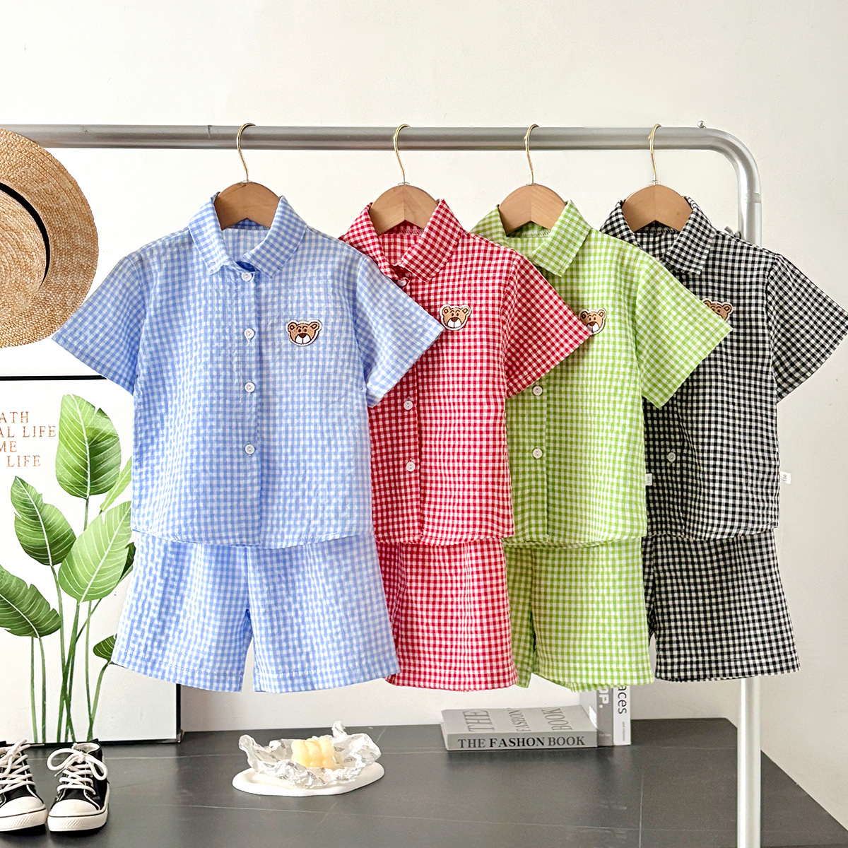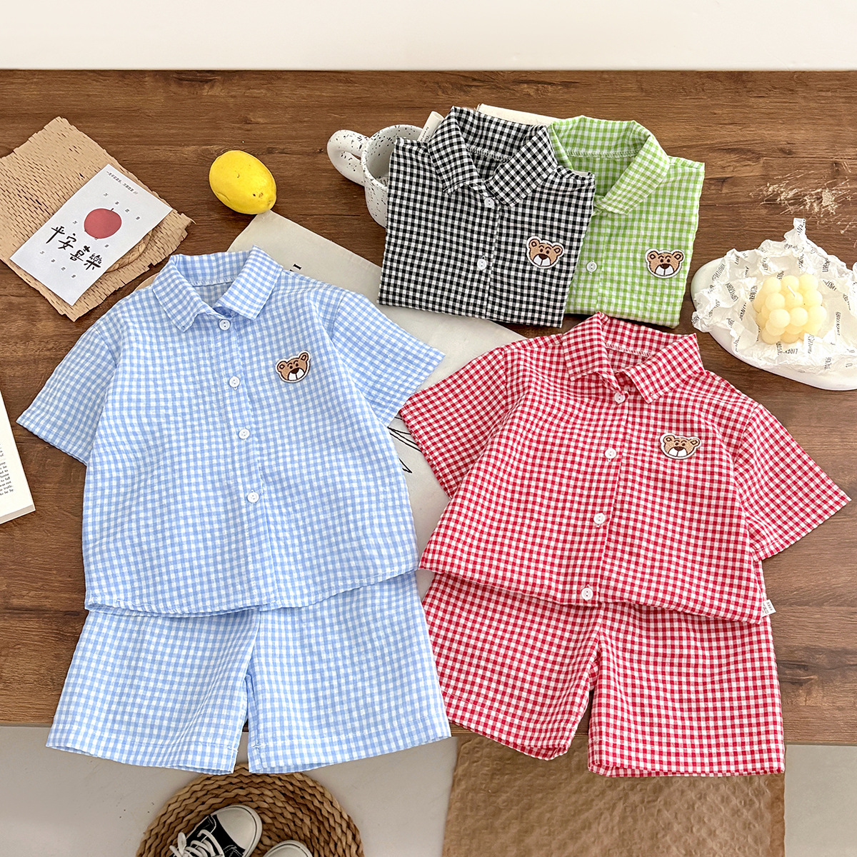 여름 새로운 어린이 셔츠 세트 반팔 반바지 격자 무늬 만화 2 피스 외투 세트 소년 소녀스토어 가기