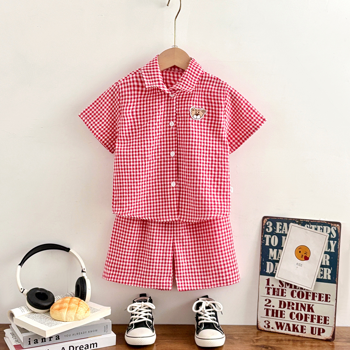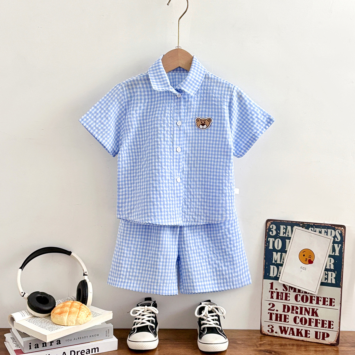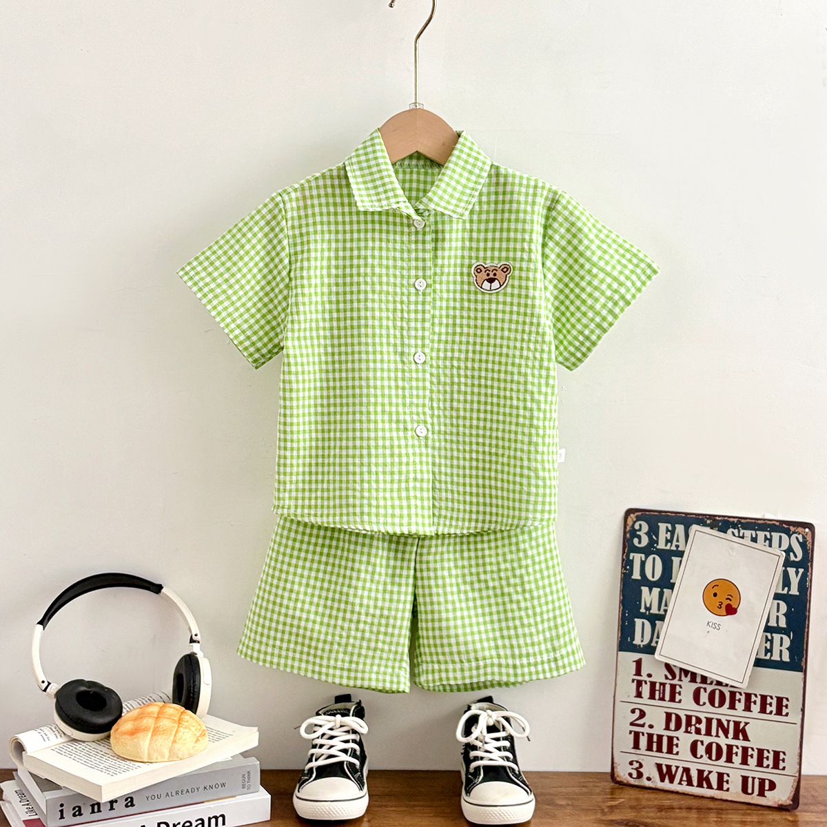 여름 새로운 어린이 셔츠 세트 반팔 반바지 격자 무늬 만화 2 피스 외투 세트 소년 소녀스토어 가기