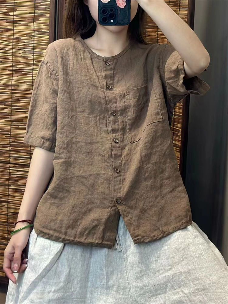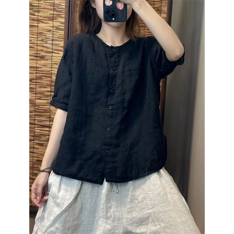 2025 코튼 린넨 반팔 라운드 넥 셔츠 여성 여름 신작 복고풍 예술적 루즈 다용도 연령 감소 카디건 탑스토어 가기