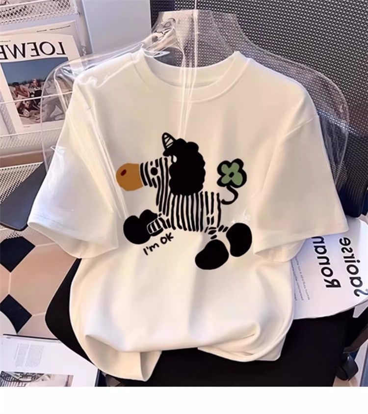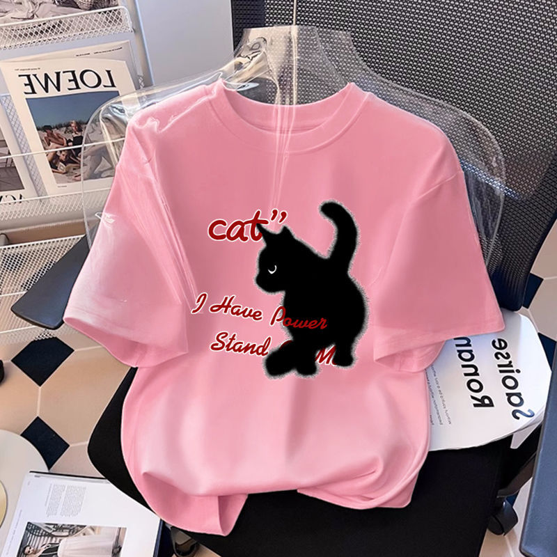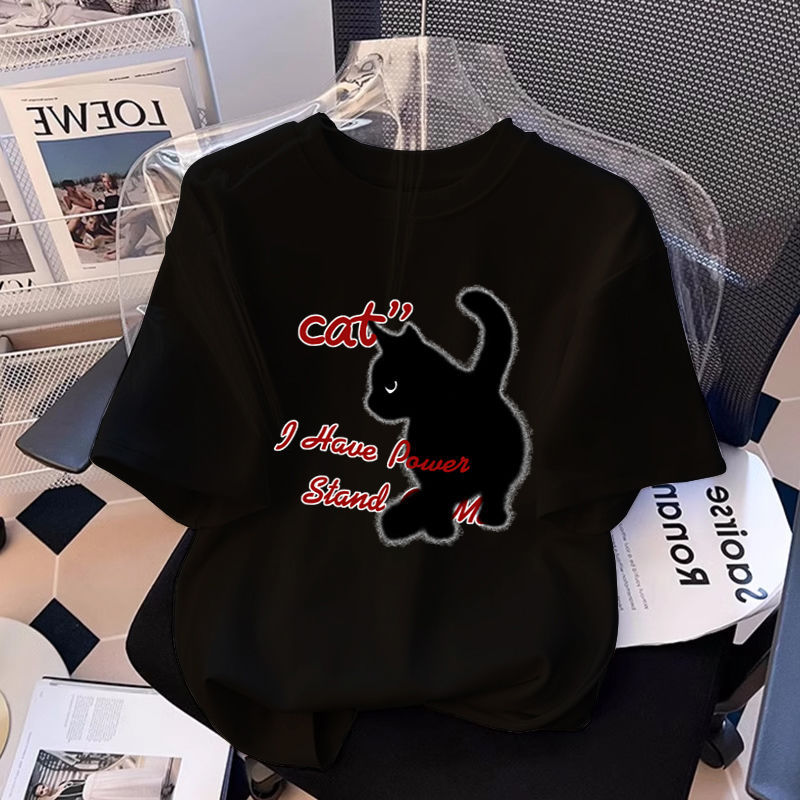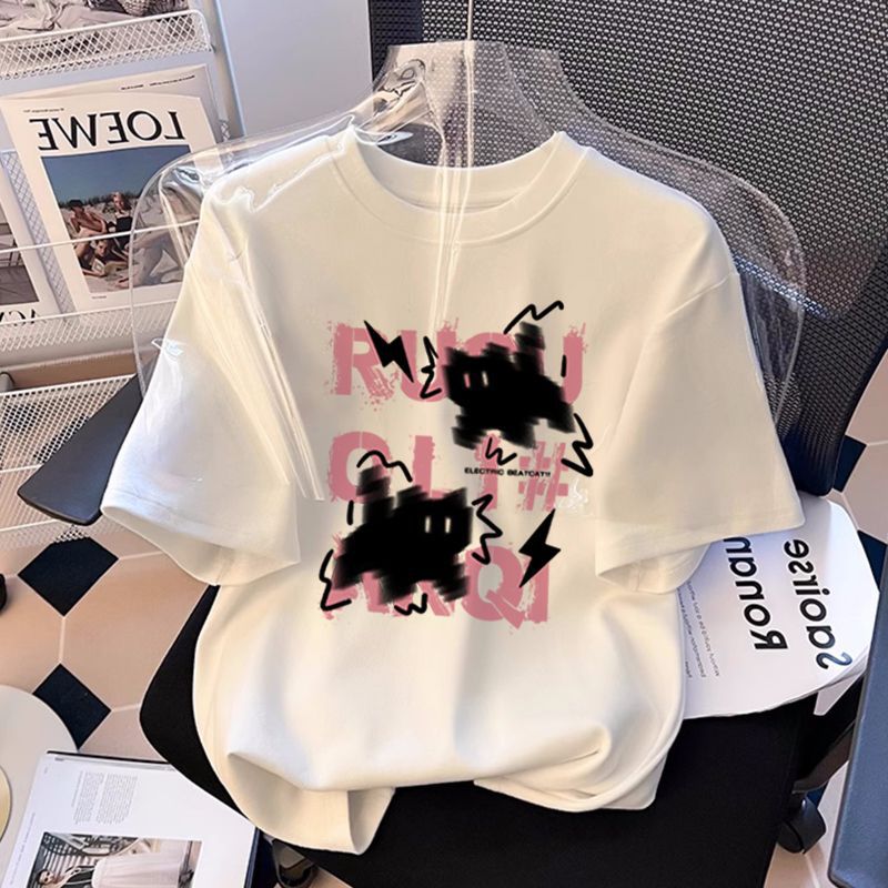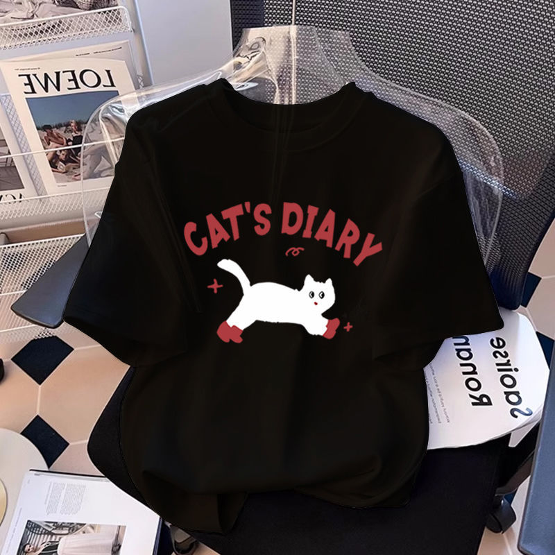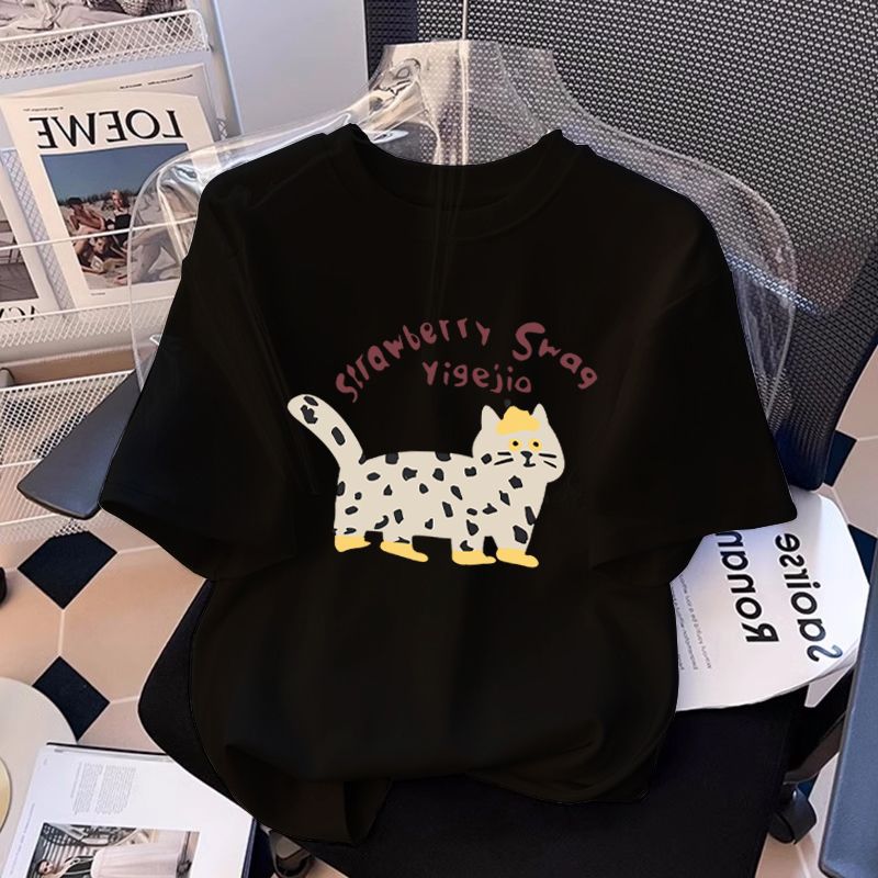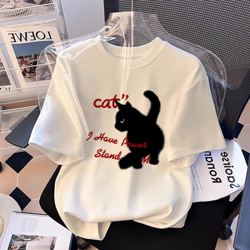2026 여름 신상 고양이 프린트 반팔 흰색 티셔츠 여성용, 세련되고 나이를 덜어보이는 루즈핏 순면 반팔 상의