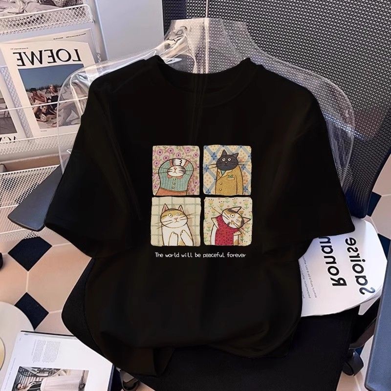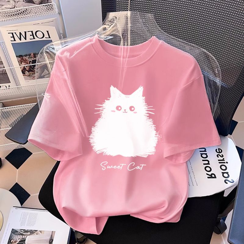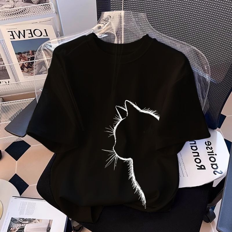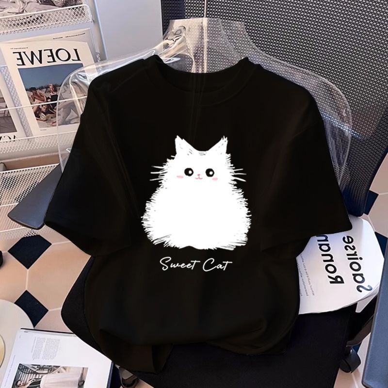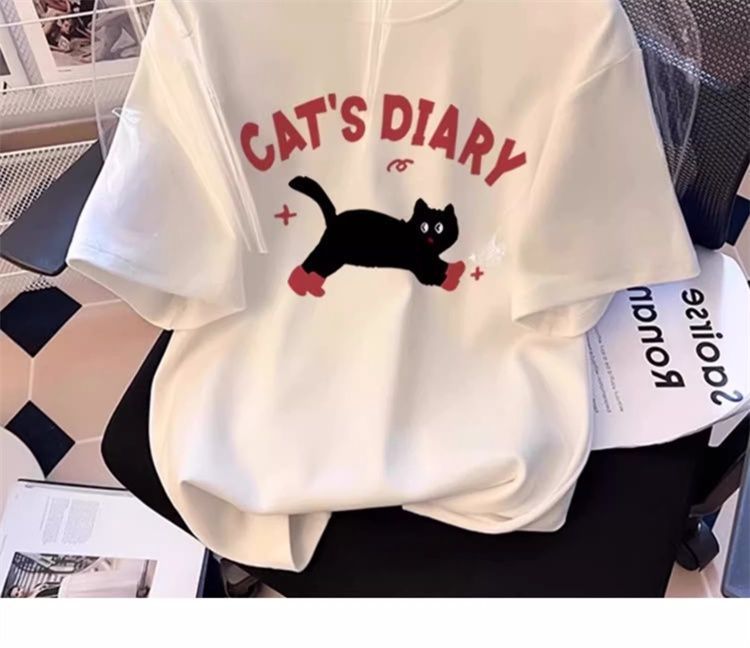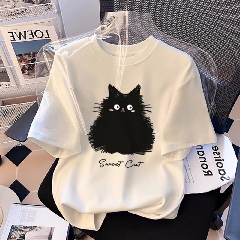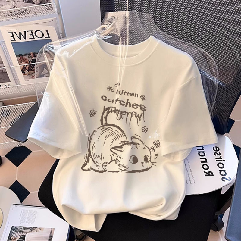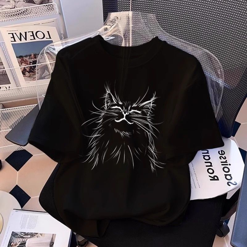 2026 여름 신상 고양이 프린트 반팔 흰색 티셔츠 여성용, 세련되고 나이를 덜어보이는 루즈핏 순면 반팔 상의스토어 가기
