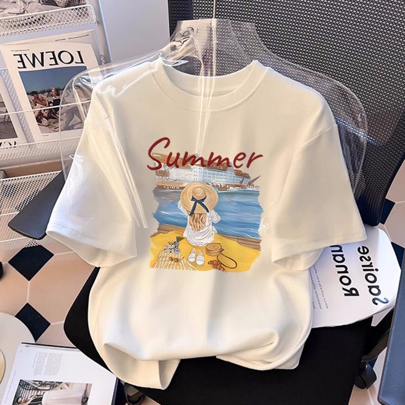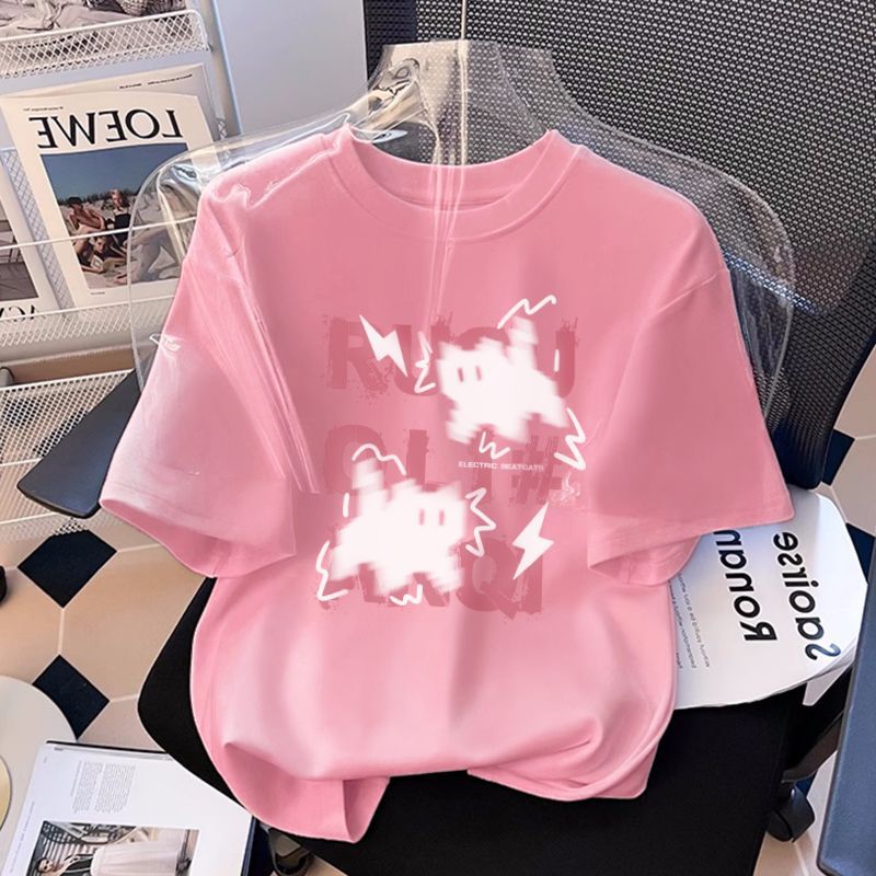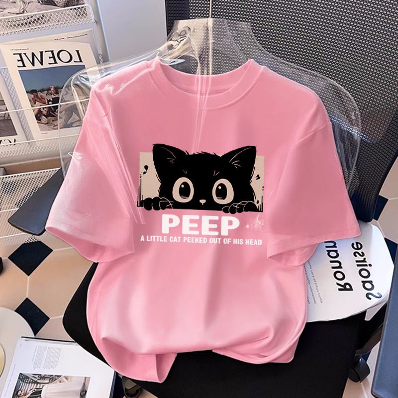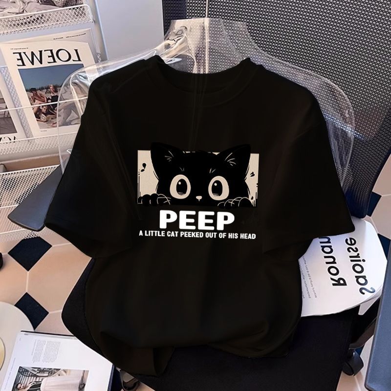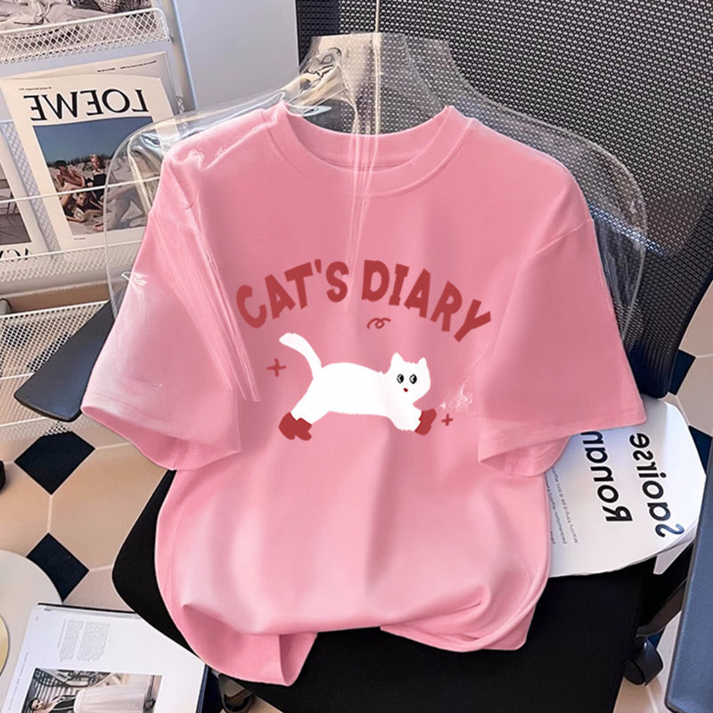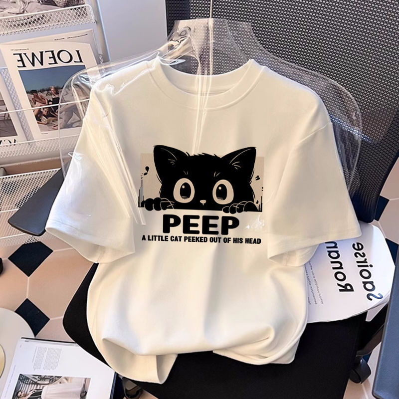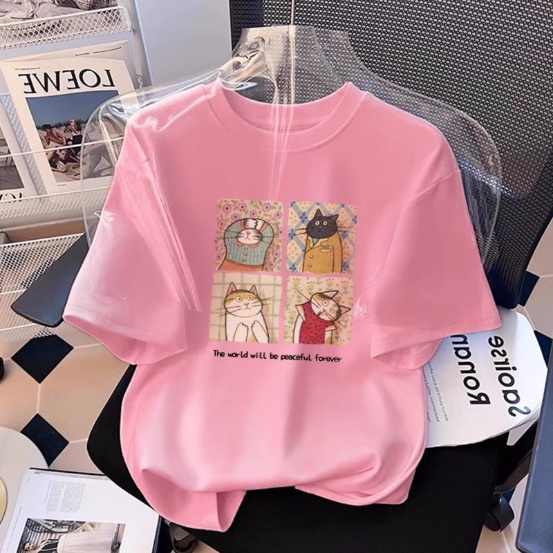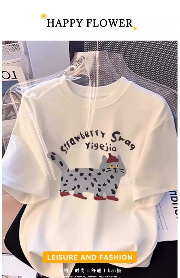 2026 여름 신상 고양이 프린트 반팔 흰색 티셔츠 여성용, 세련되고 나이를 덜어보이는 루즈핏 순면 반팔 상의스토어 가기