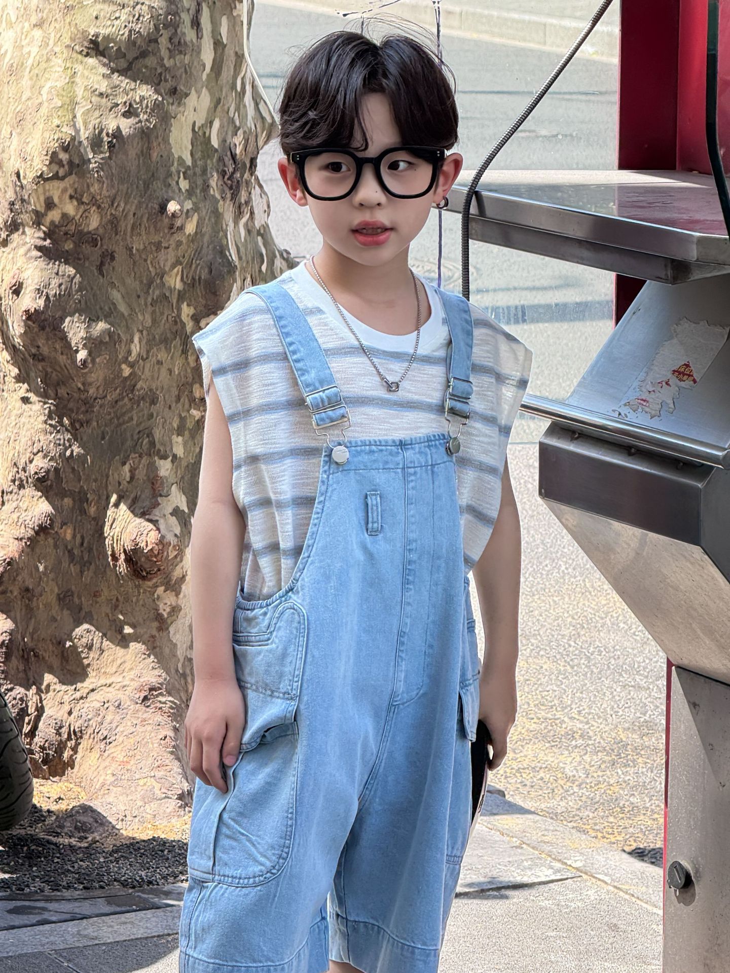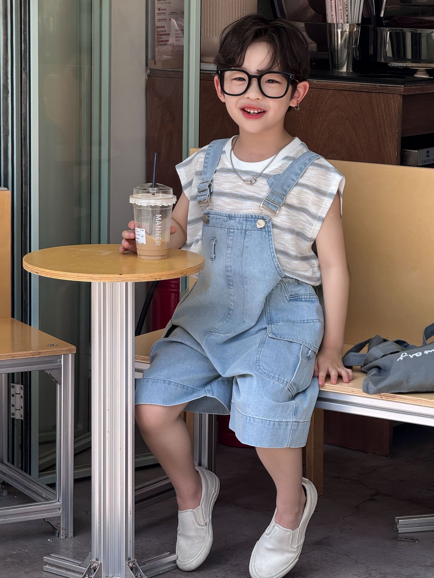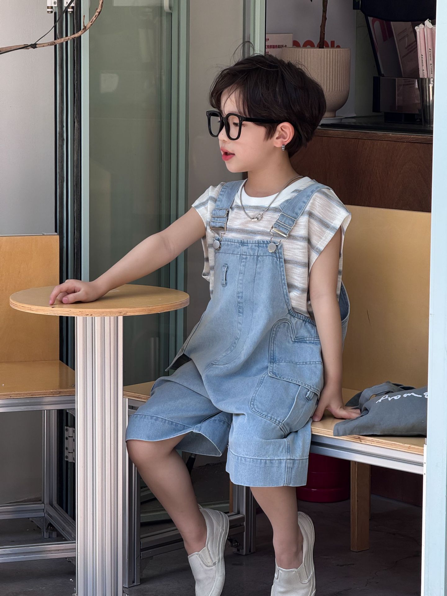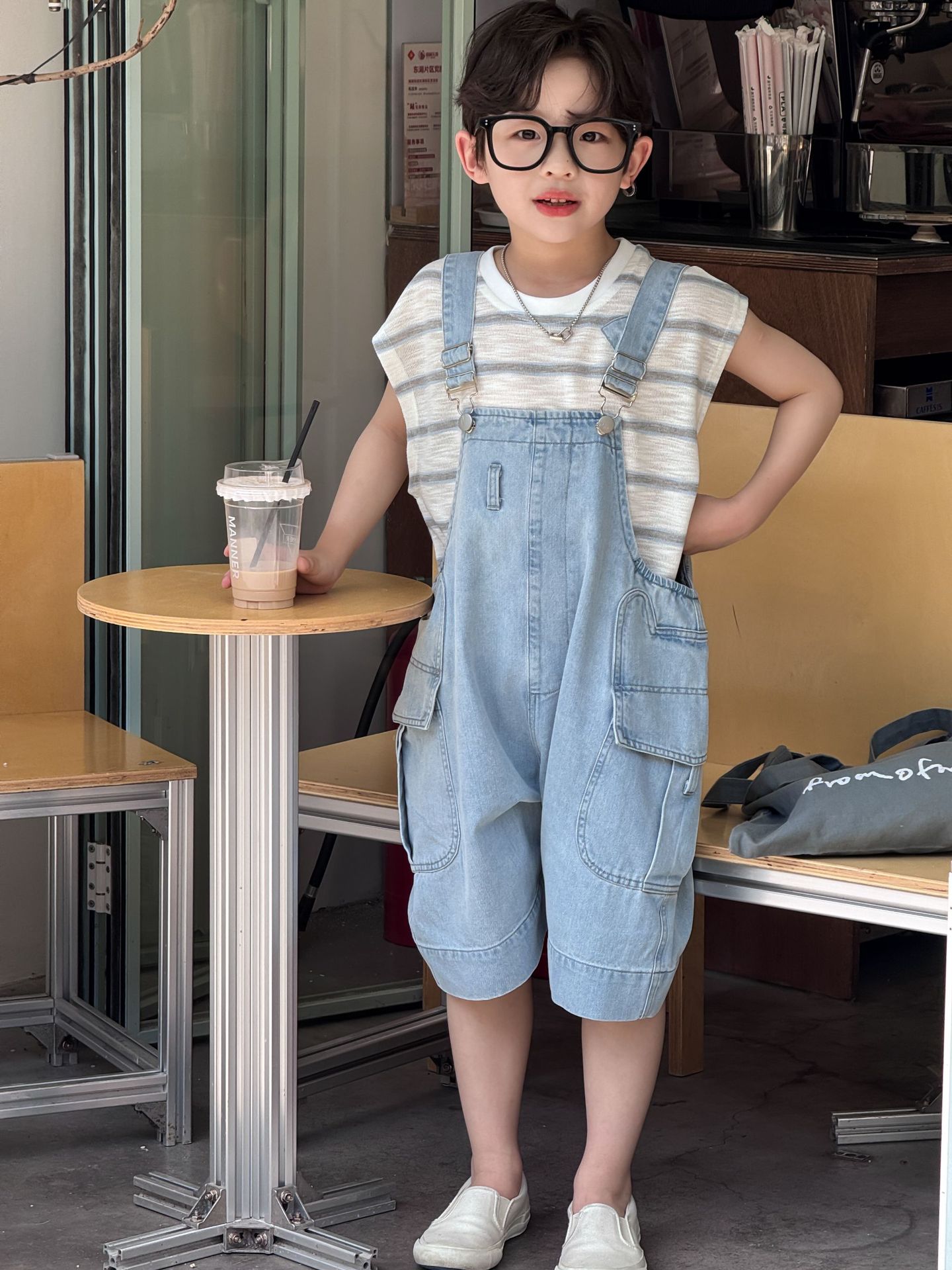 어린이와 소년을위한 25 여름 새 한국 아동복 복고풍 블루 큰 포켓 툴링 데님 멜빵스토어 가기