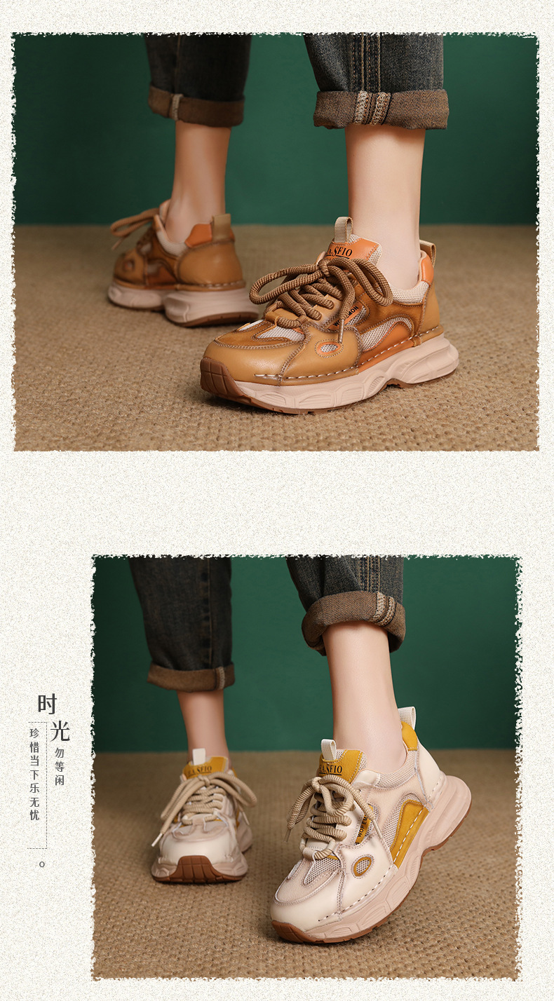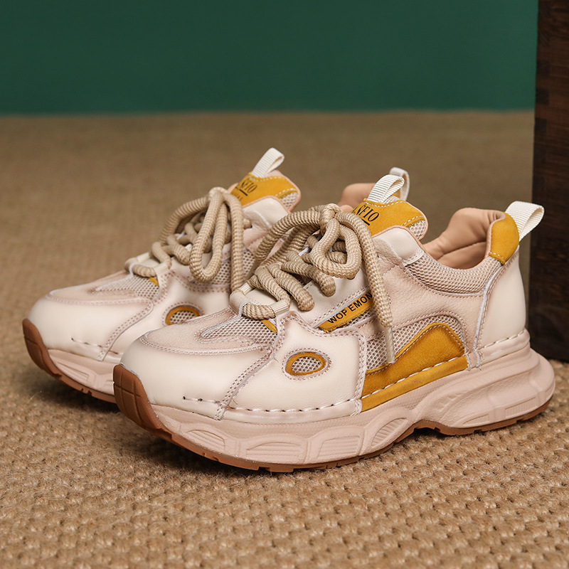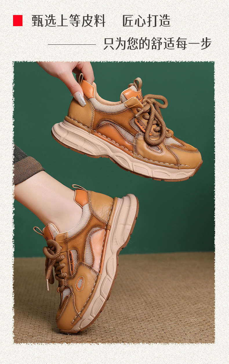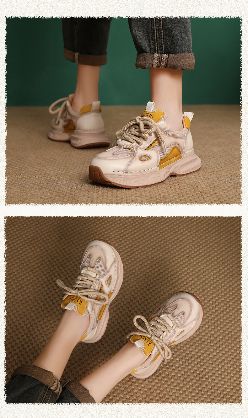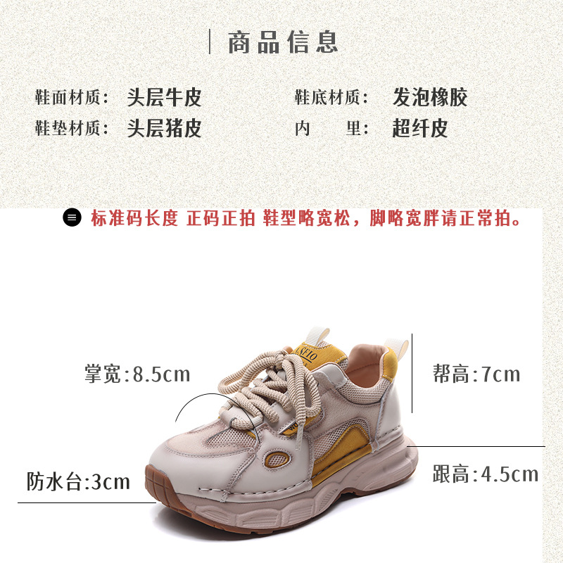 첫 번째 레이어 소 가죽 컬러 블록 통기성 메쉬 신발 여성의 봄과 여름 2025 새로운 두꺼운 밑창 부드러운 밑창 다목적 캐주얼 여성 신발스토어 가기