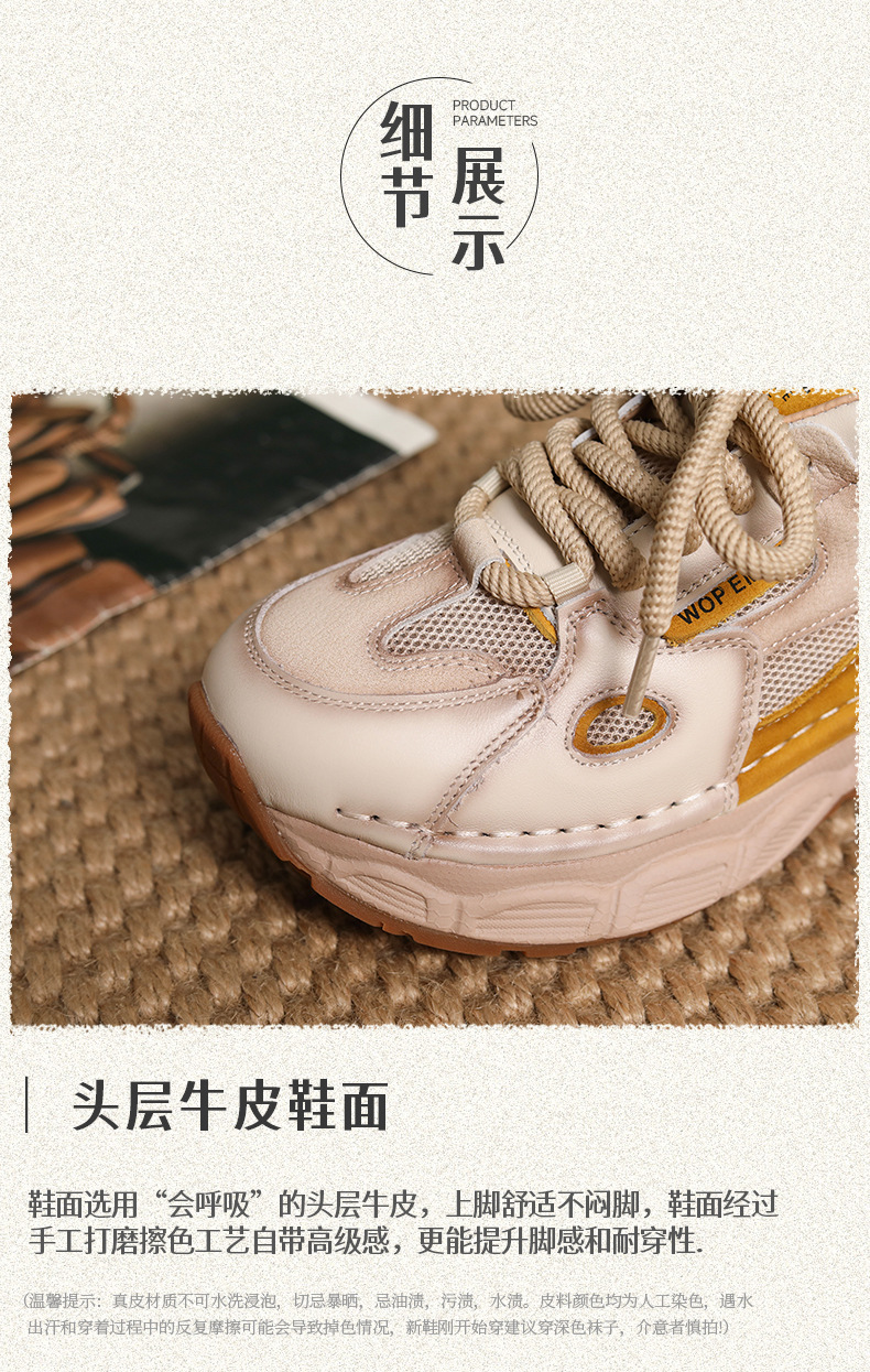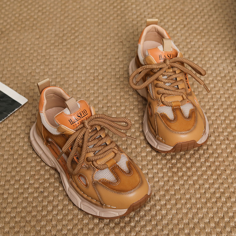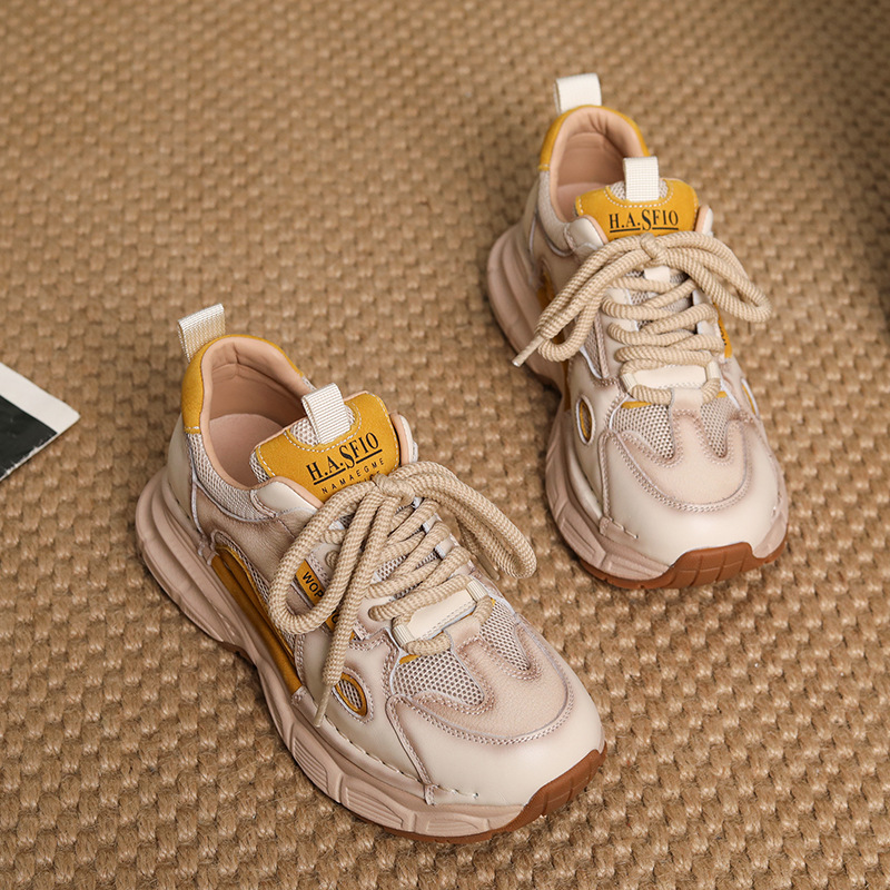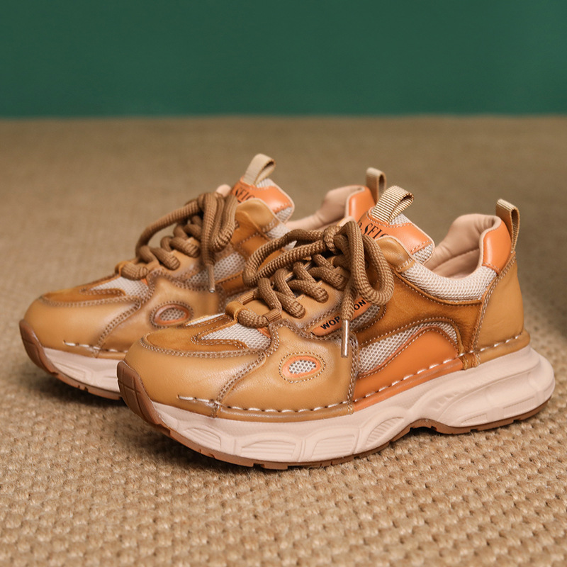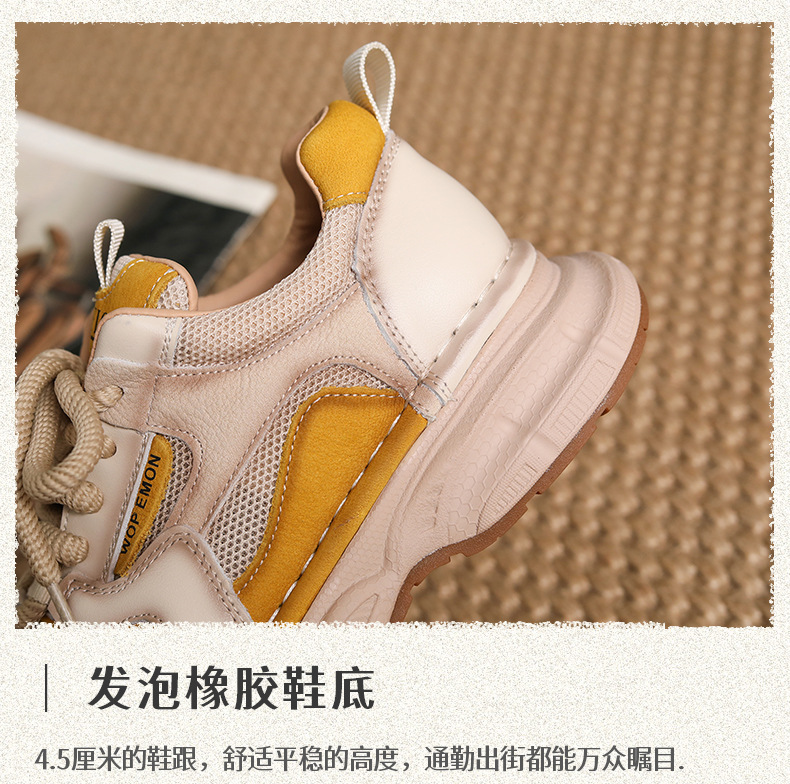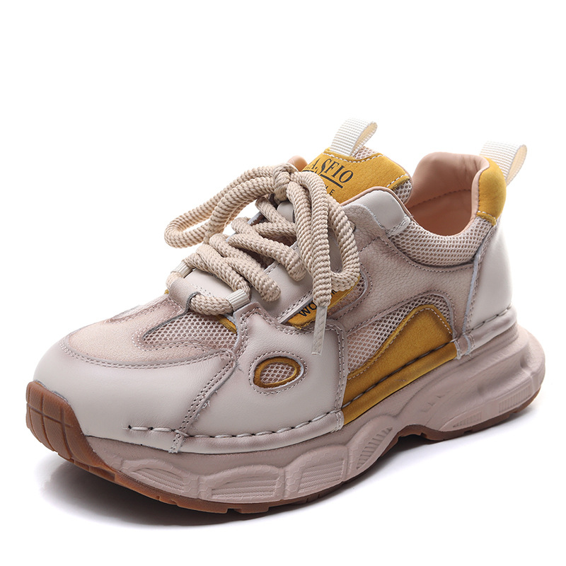 첫 번째 레이어 소 가죽 컬러 블록 통기성 메쉬 신발 여성의 봄과 여름 2025 새로운 두꺼운 밑창 부드러운 밑창 다목적 캐주얼 여성 신발스토어 가기