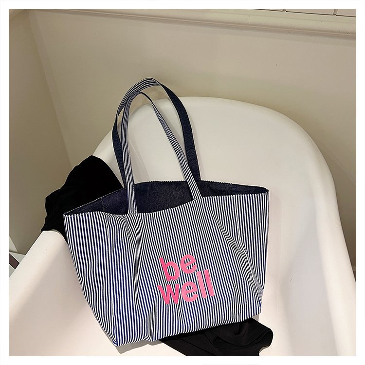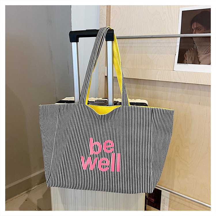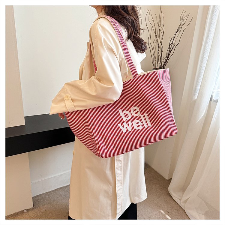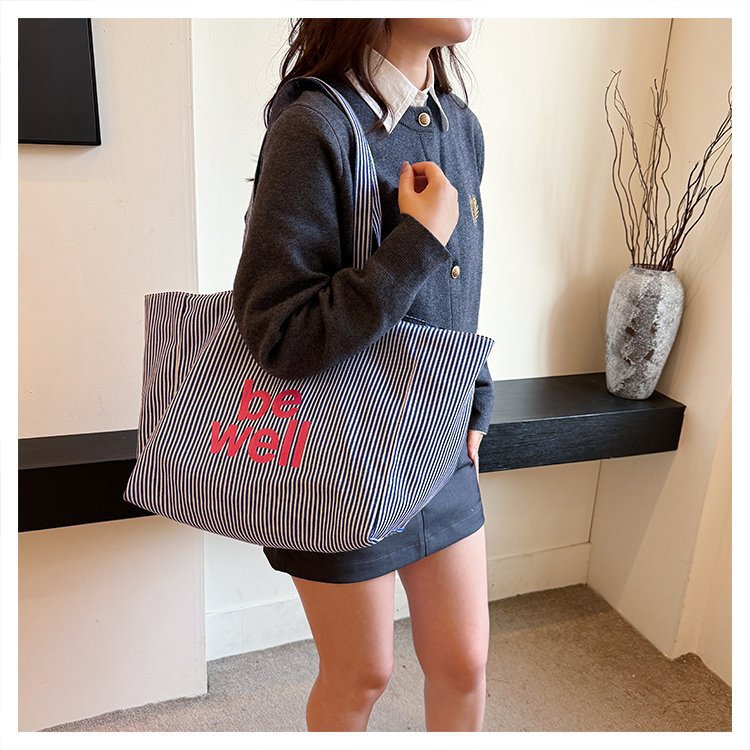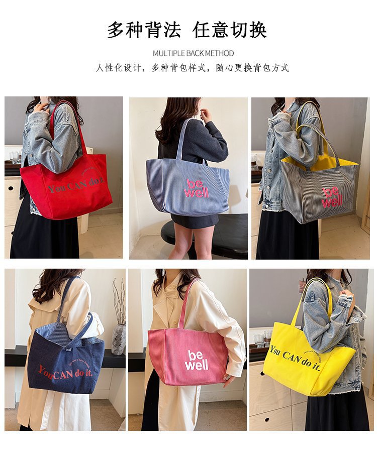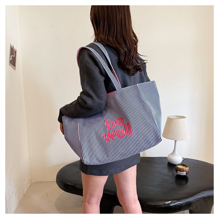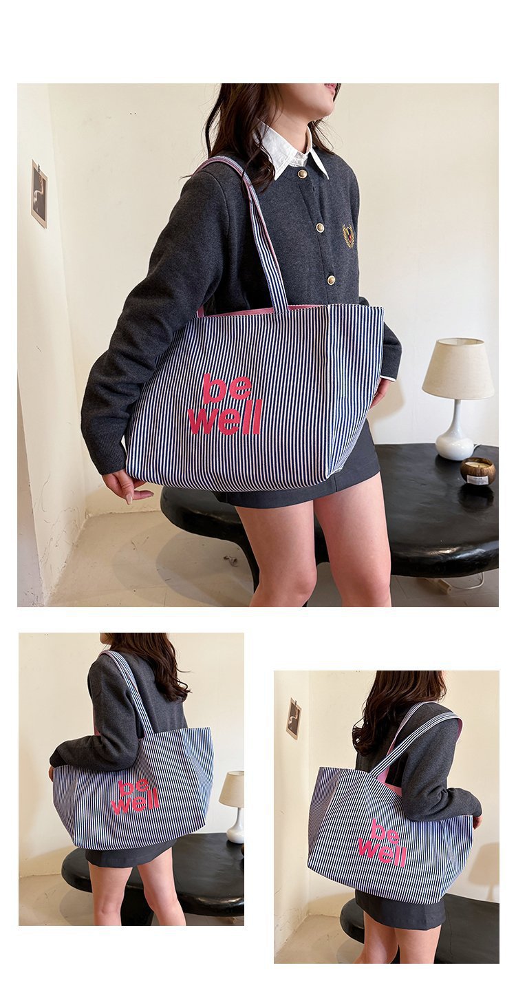 한국 대용량 토트 양면 새로운 줄무늬 캐주얼 원 숄더 질감 자수 캔버스 가방 학생 통근
