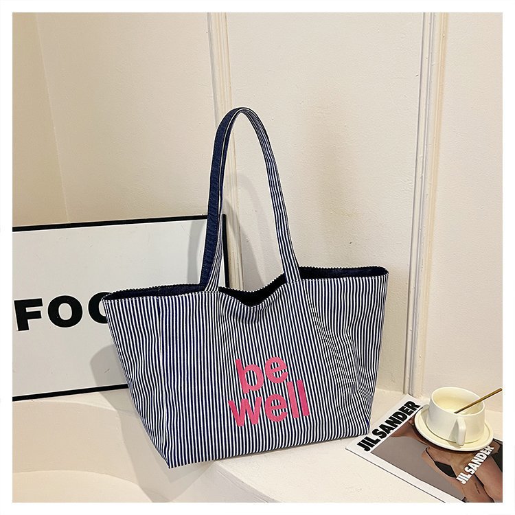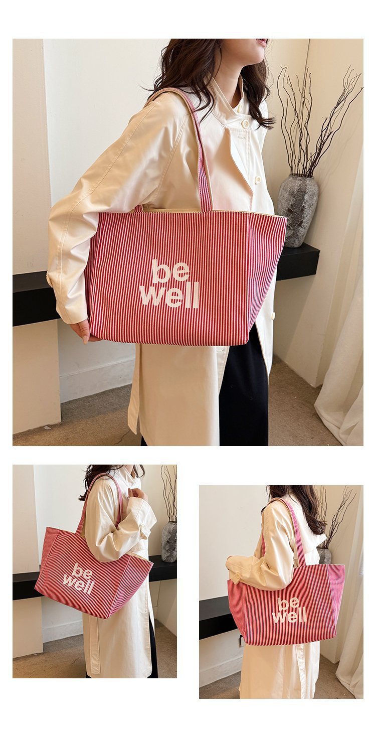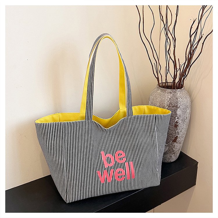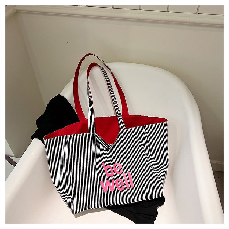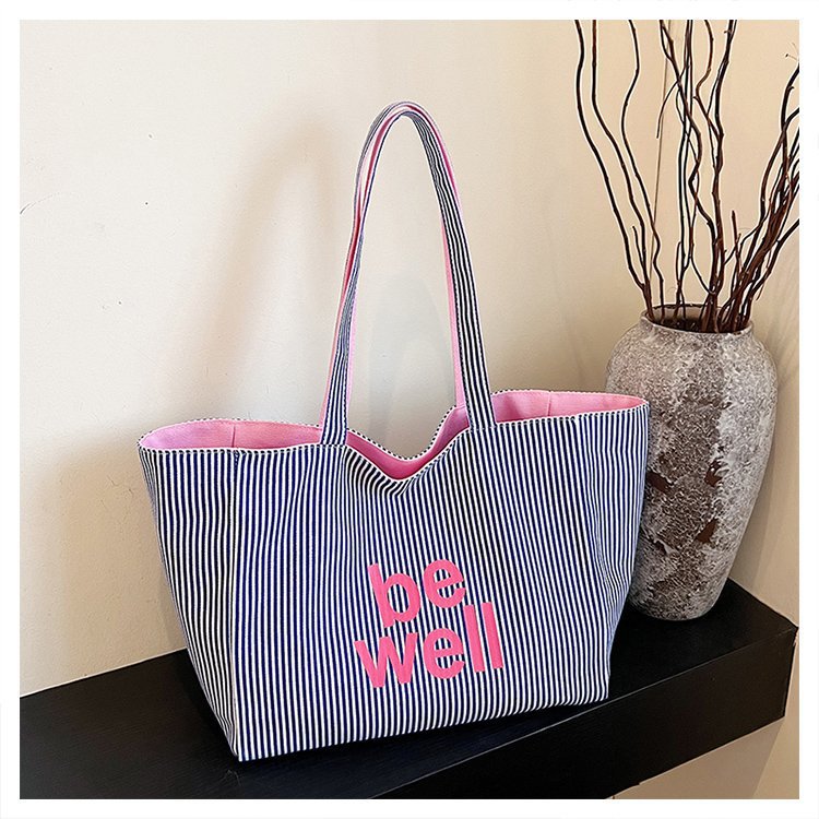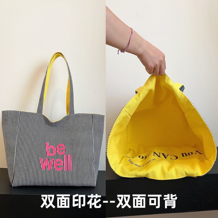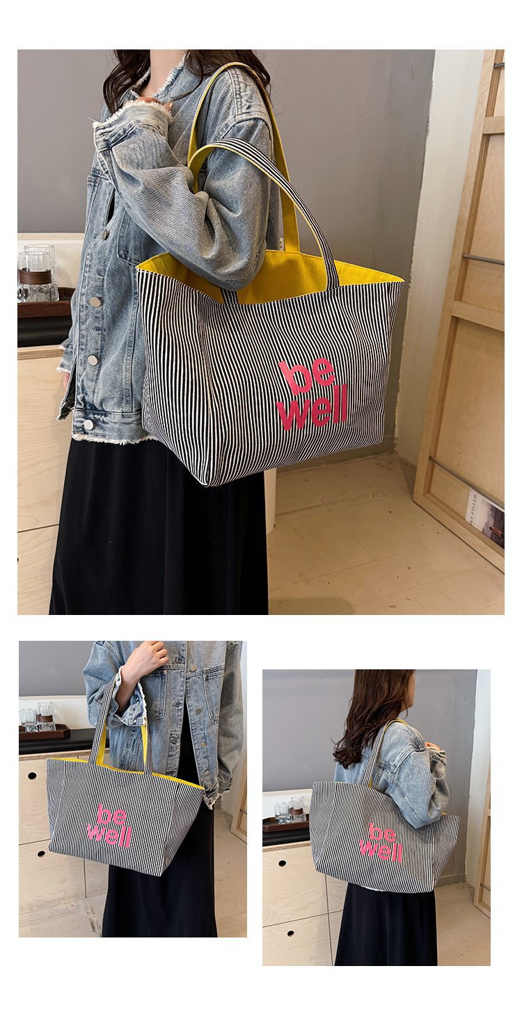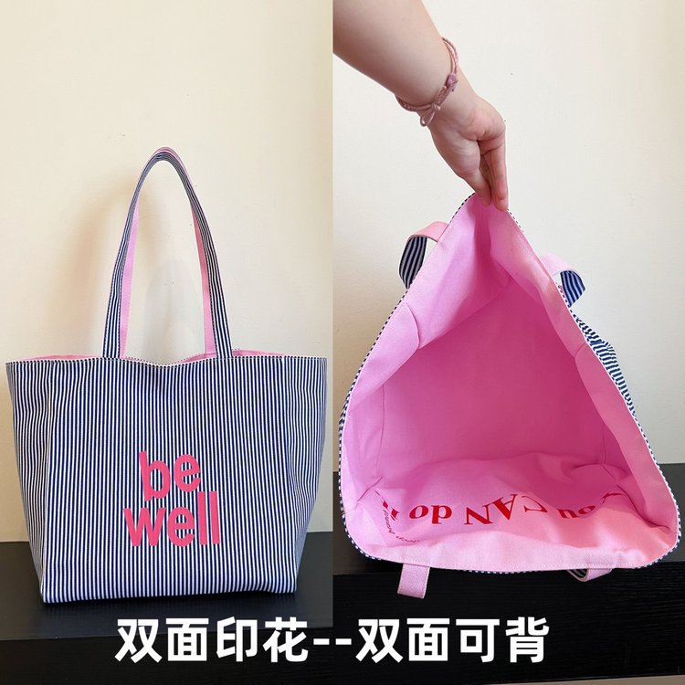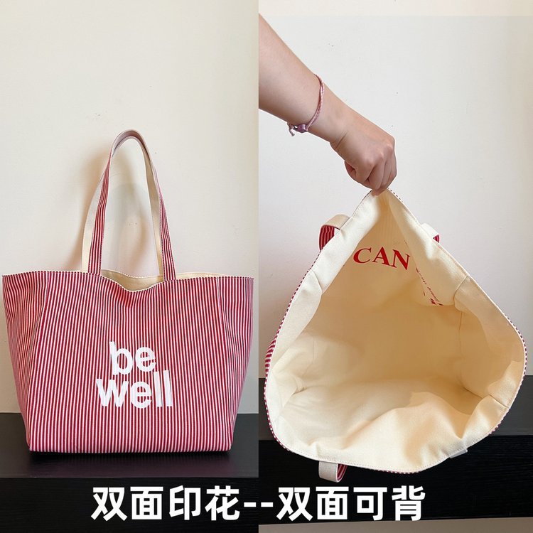 한국 대용량 토트 양면 새로운 줄무늬 캐주얼 원 숄더 질감 자수 캔버스 가방 학생 통근스토어 가기