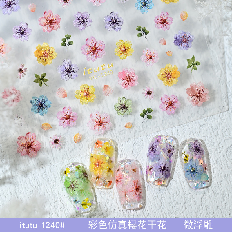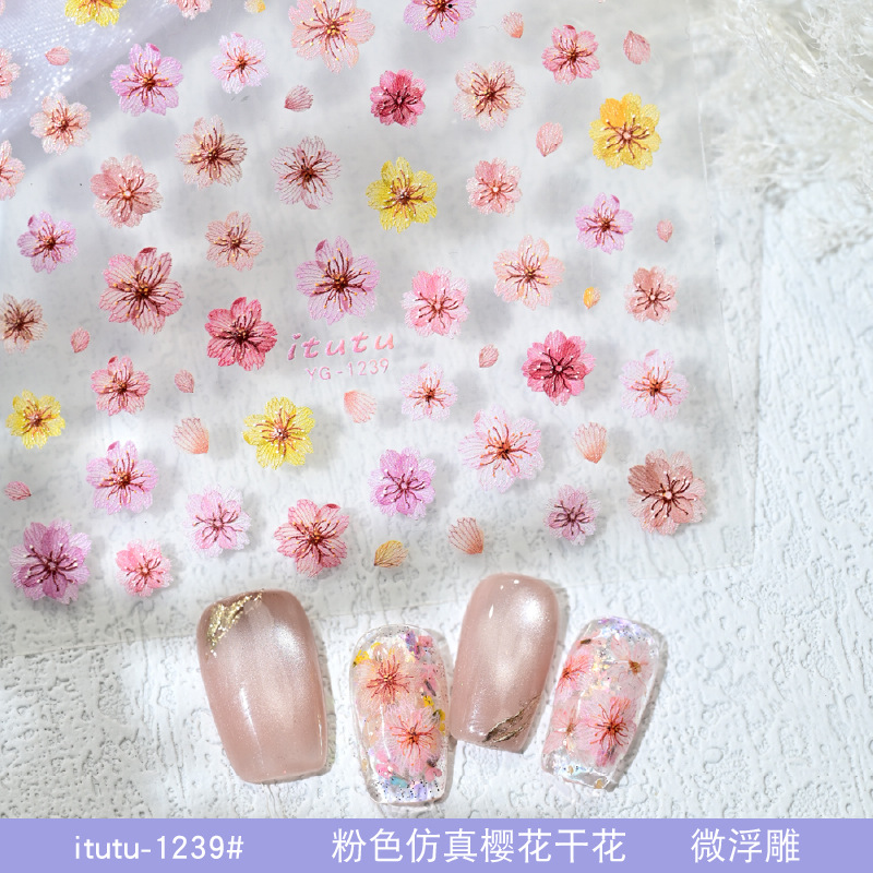 새로운 사이버 레드 네일 아트 시뮬레이션 컬러 벚꽃 말린 꽃 스티커 마이크로 릴리프 새로운 폭발 작은 꽃 네일 스티커