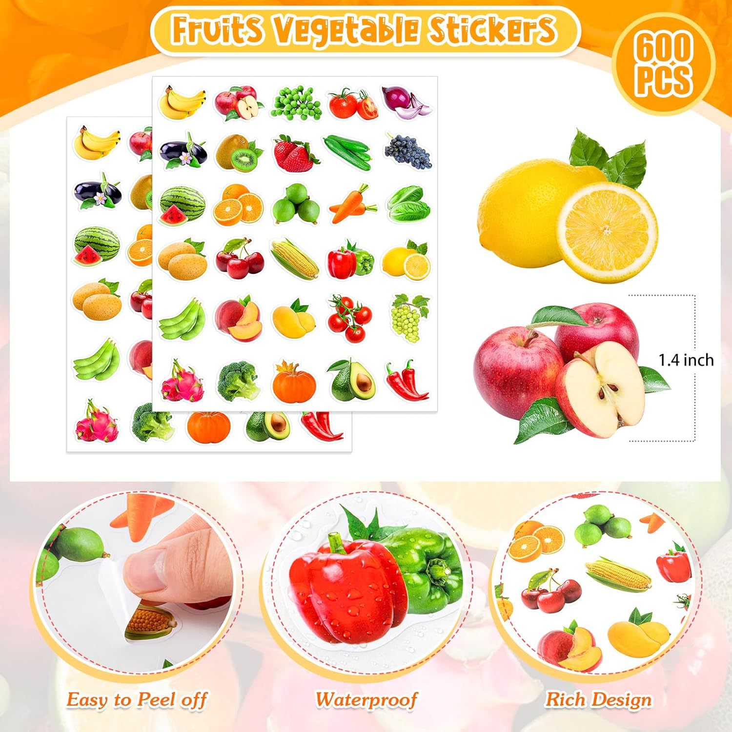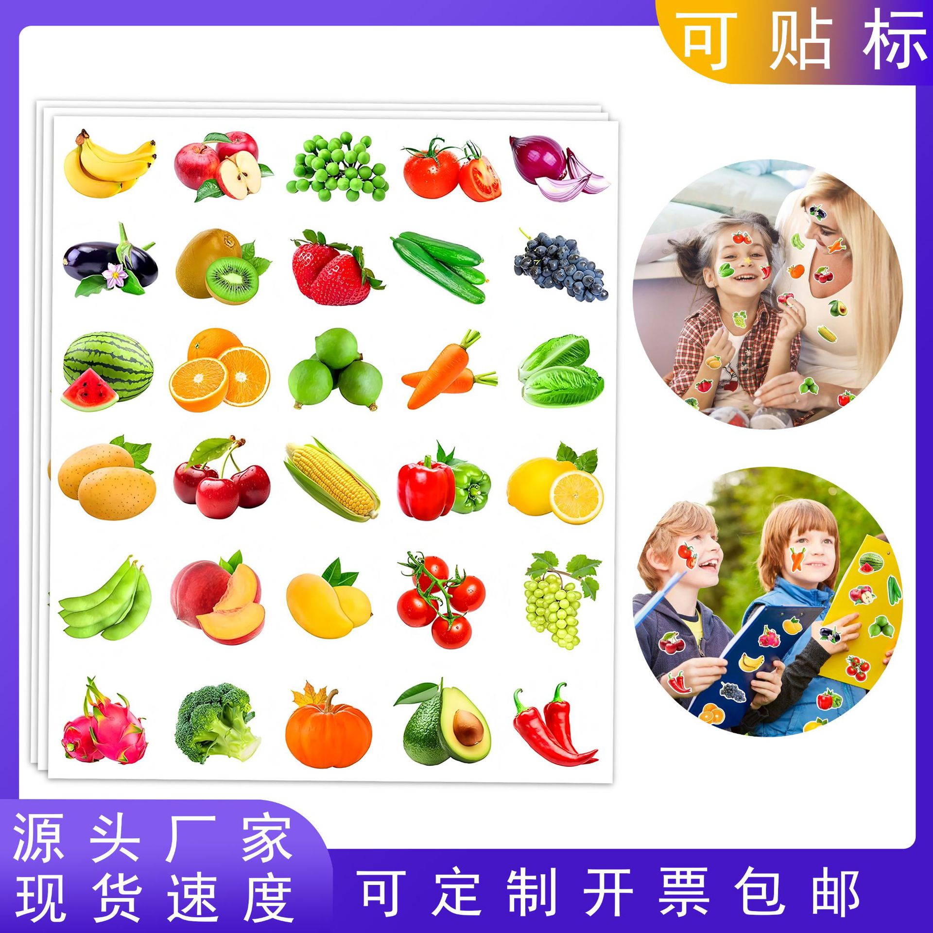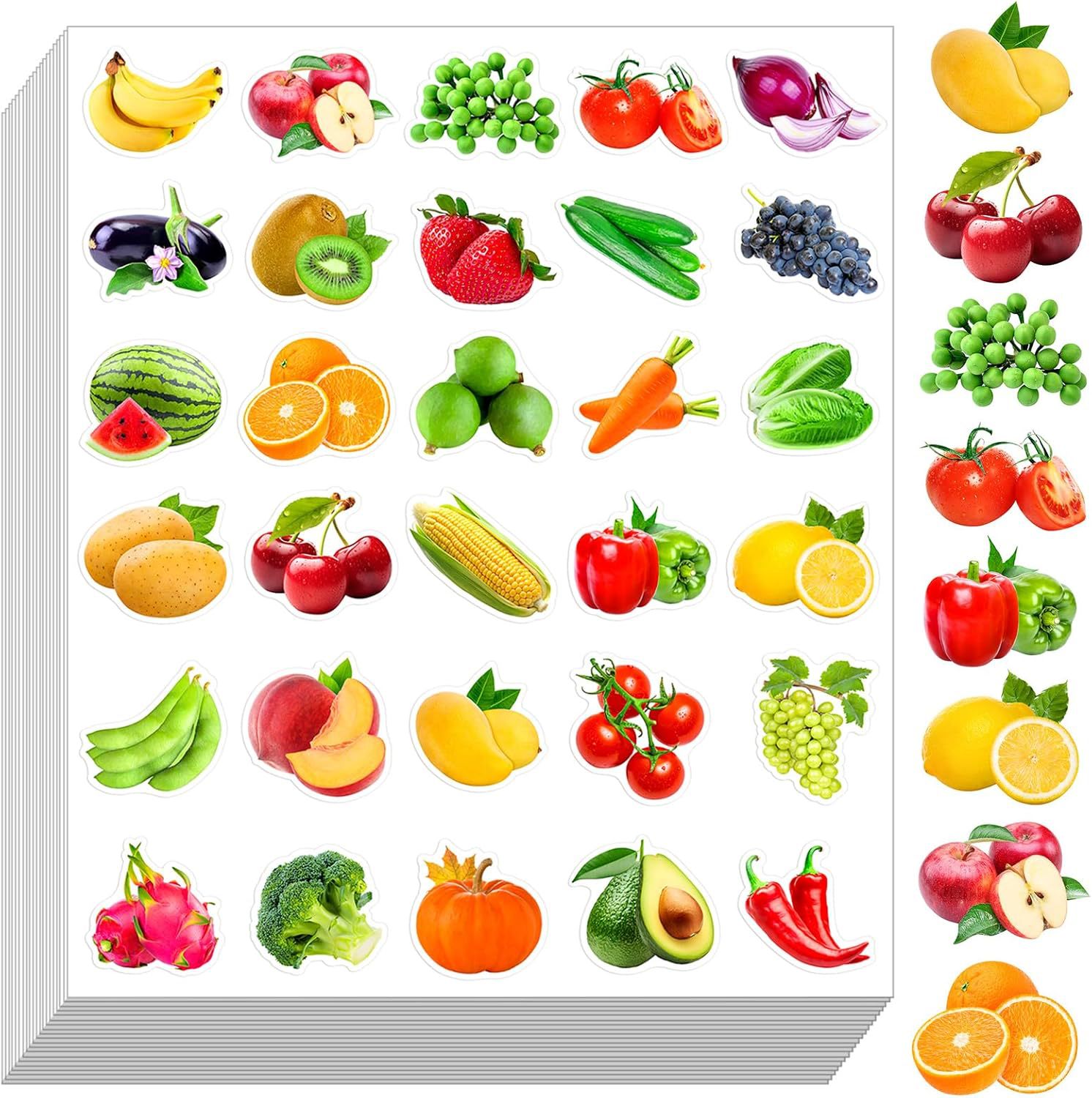 跨境流行600张彩色儿童水果蔬菜贴纸逼真食物创意贴画课堂认知教育主题派对礼物diy装饰笔记本手账贴花 课堂教育贴纸 蔬菜水果贴纸 逼真贴纸 手账贴纸 笔记本贴纸