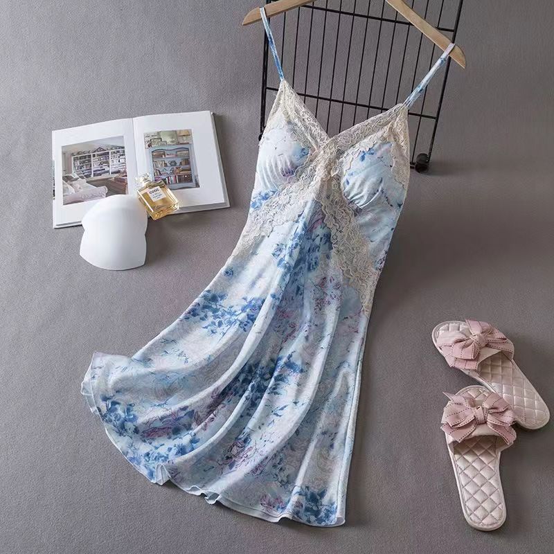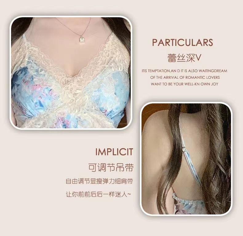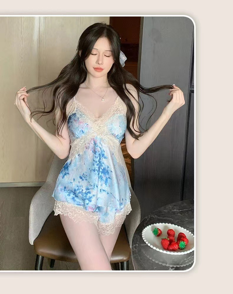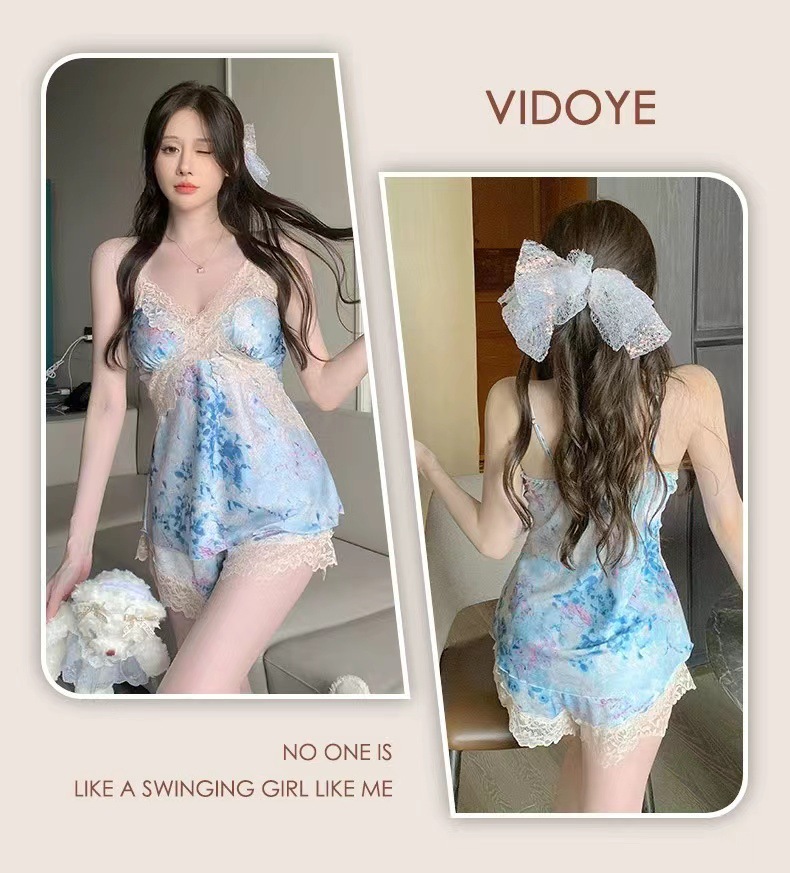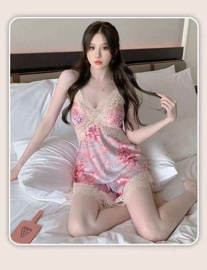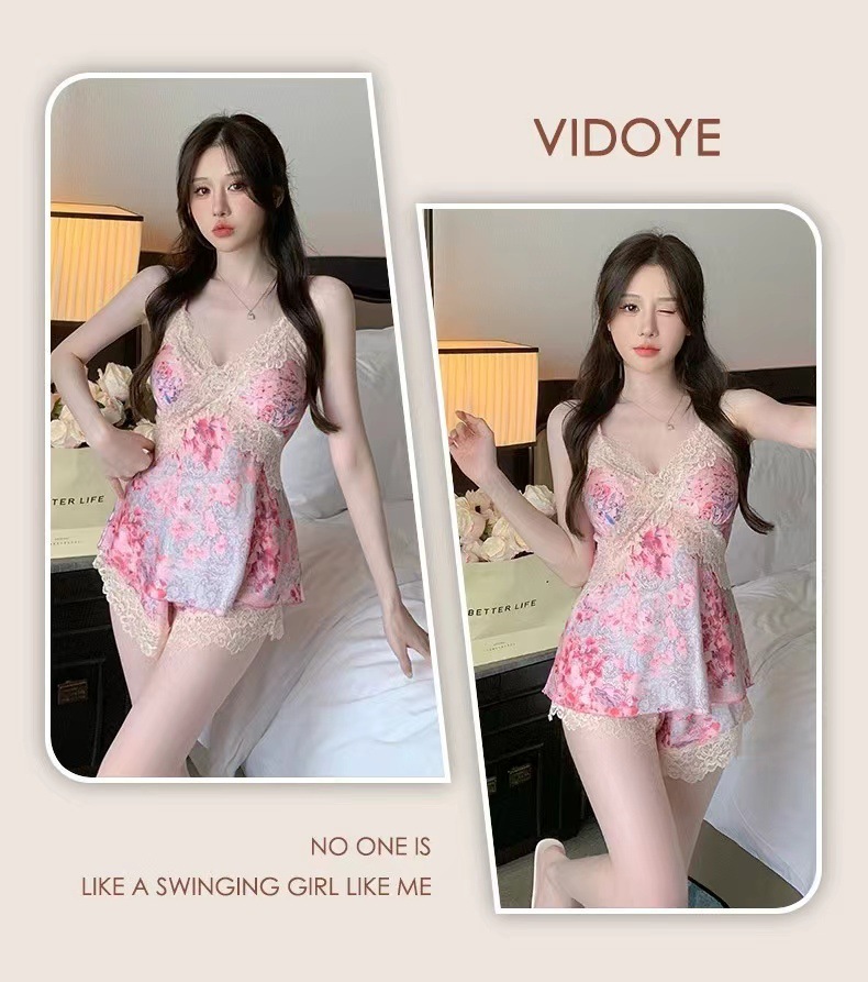 여름 여성용 아이스 실크 섹시 잠옷, 서스펜더 반바지, 잠옷 세트, 골드 로브 느낌의 홈웨어, Douyin Hit스토어 가기