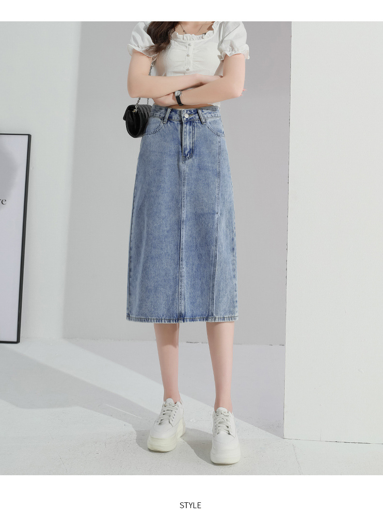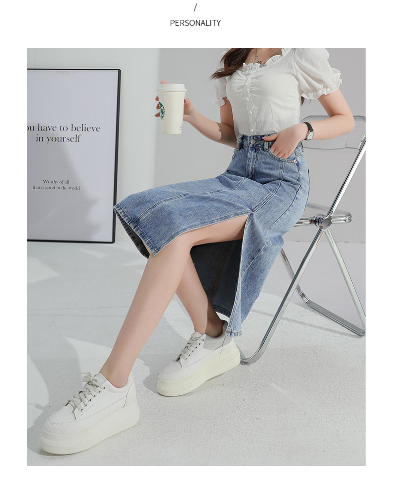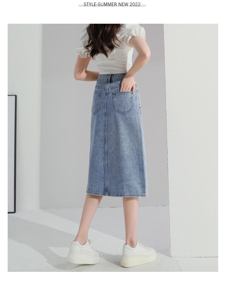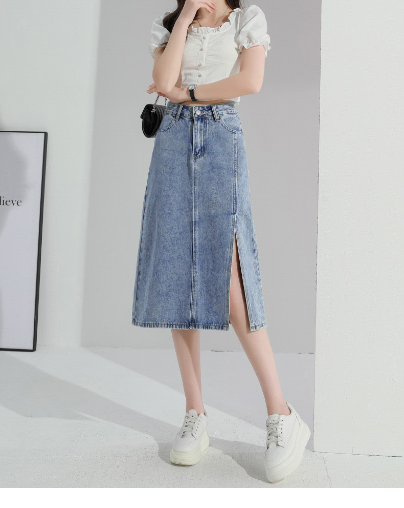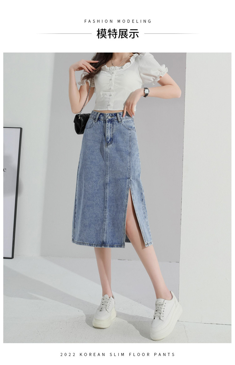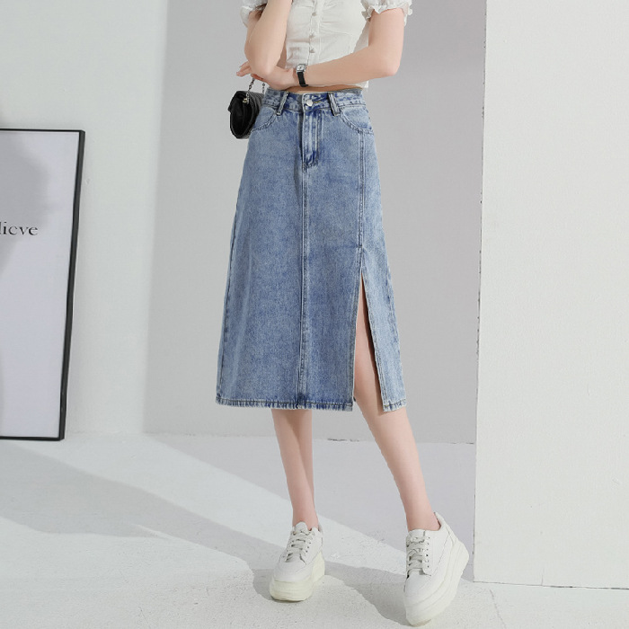 여성용 라이트 블루 슬릿 데님 스커트, 중간 길이의 A라인 하이엔드 핫걸 스위트 힙 스커트스토어 가기