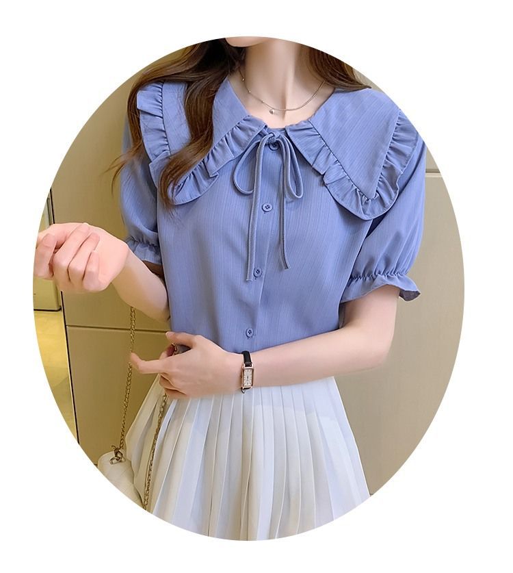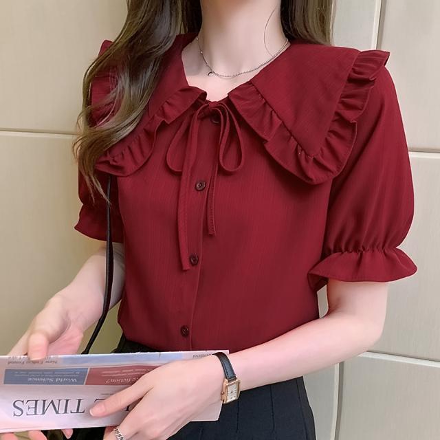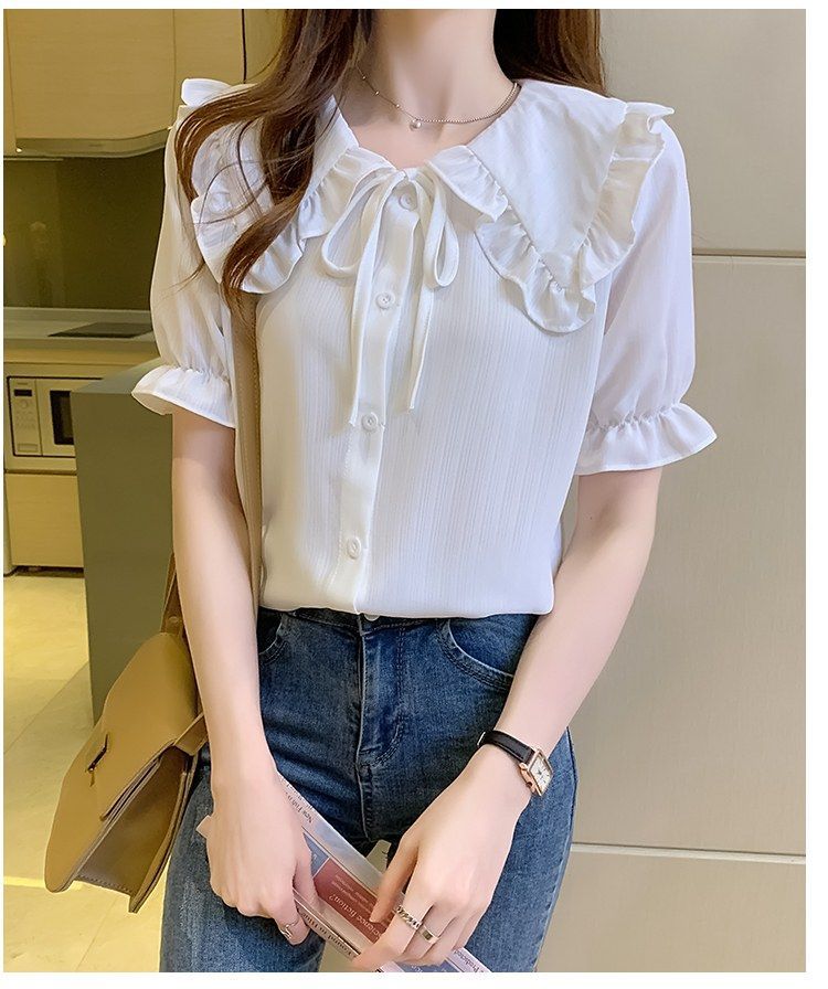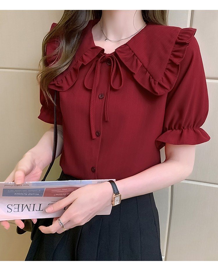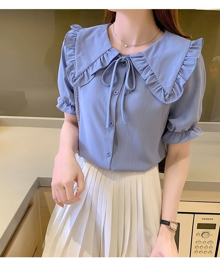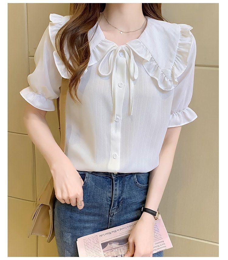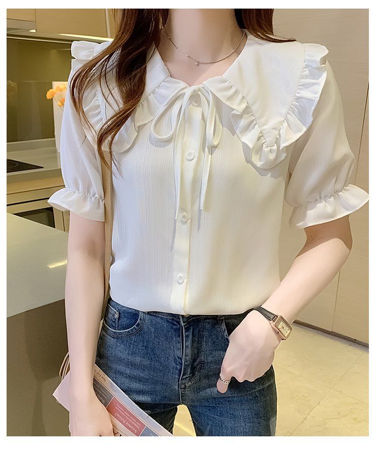 루즈한 러플 인형 칼라 레이스업 쉬폰 반소매 셔츠