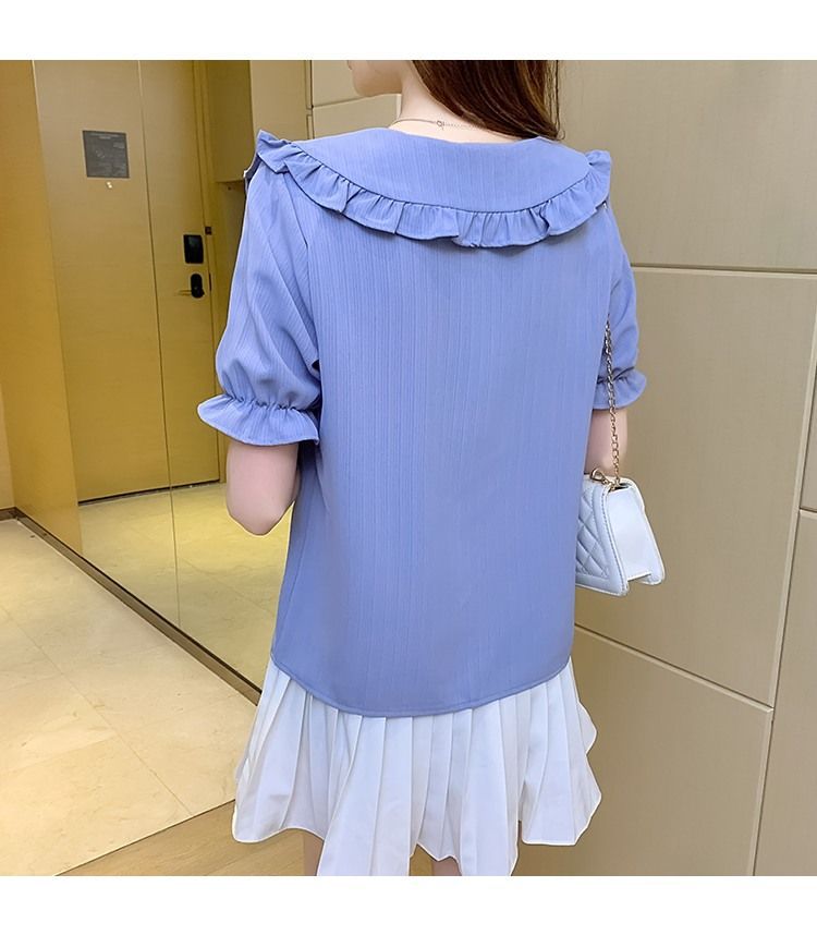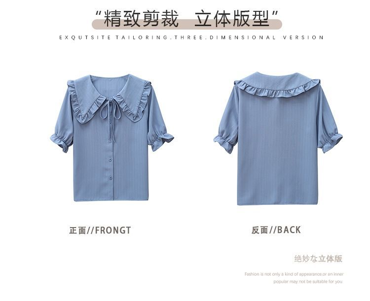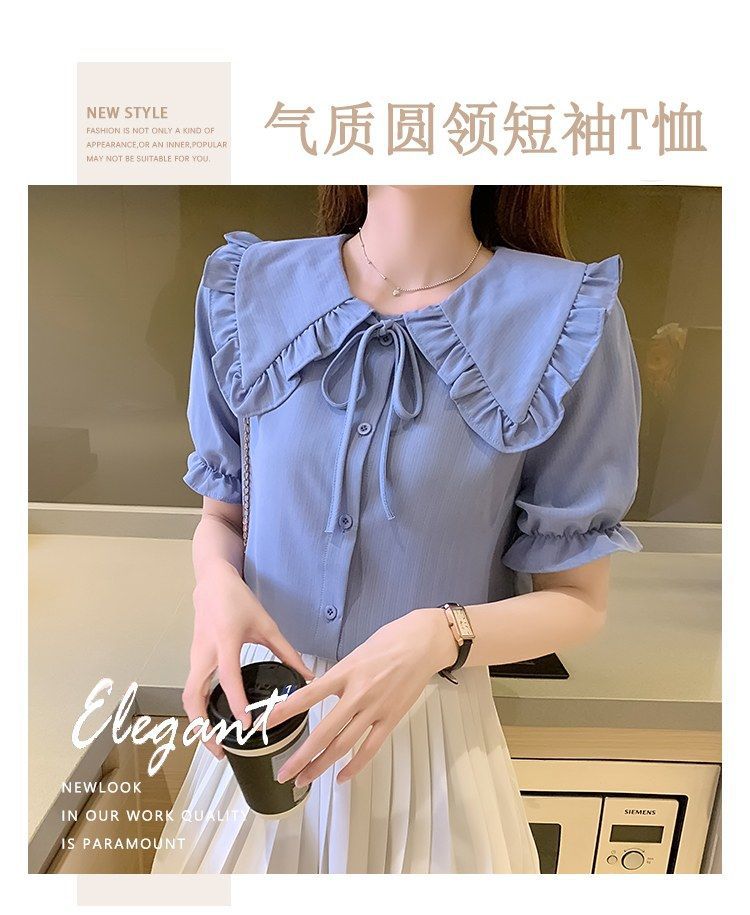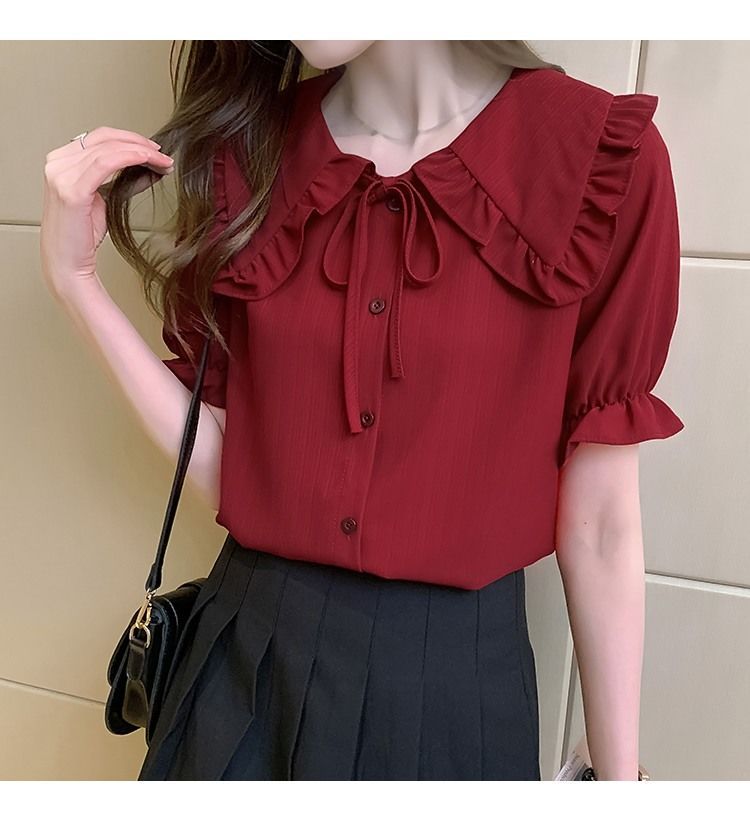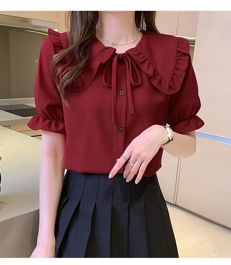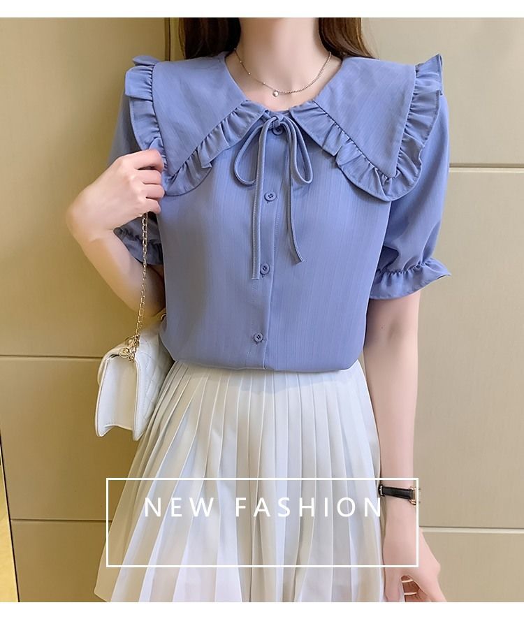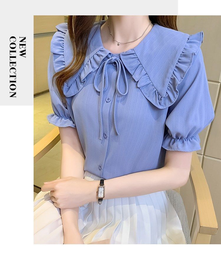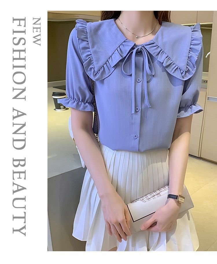 루즈한 러플 인형 칼라 레이스업 쉬폰 반소매 셔츠
